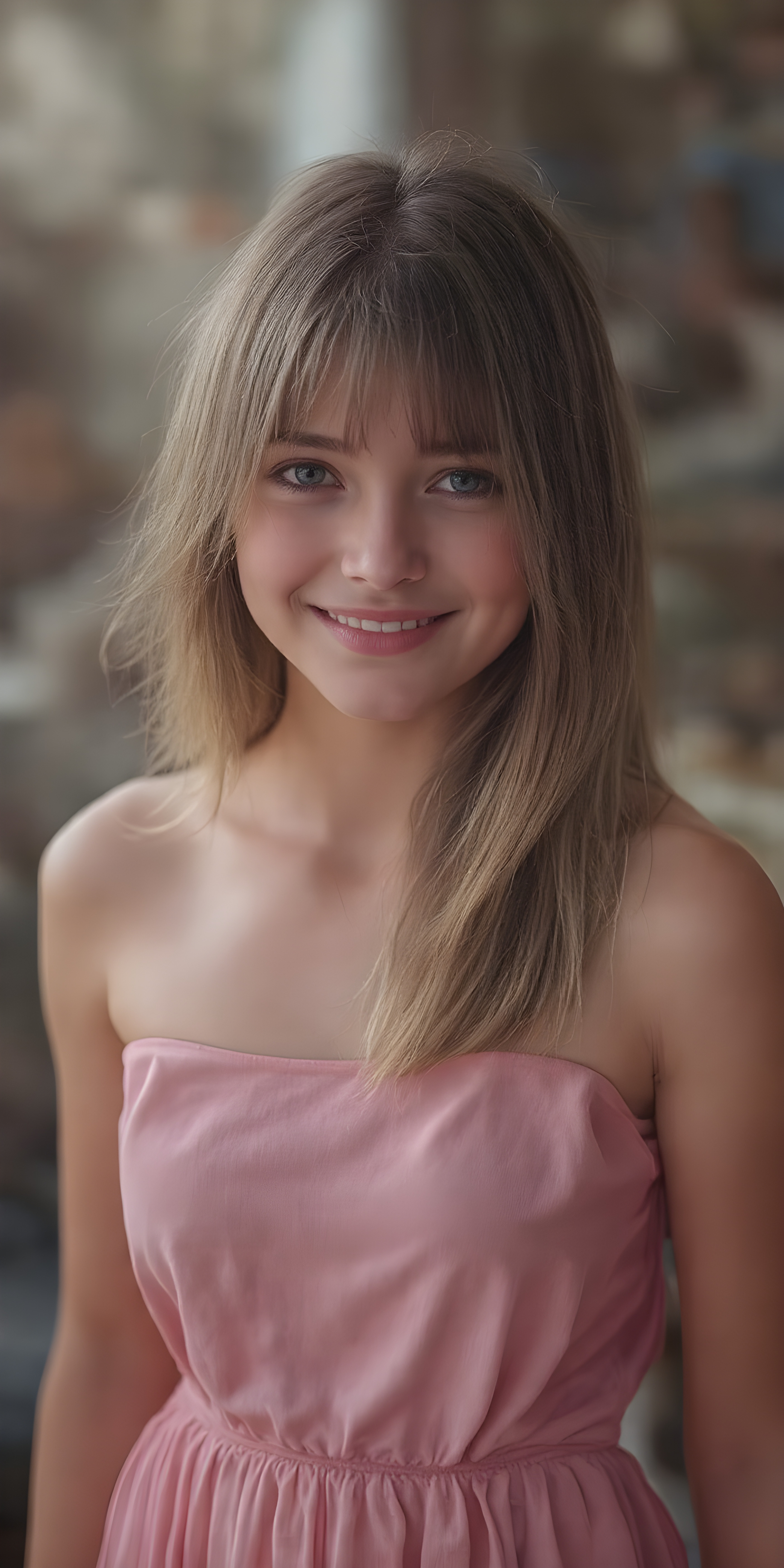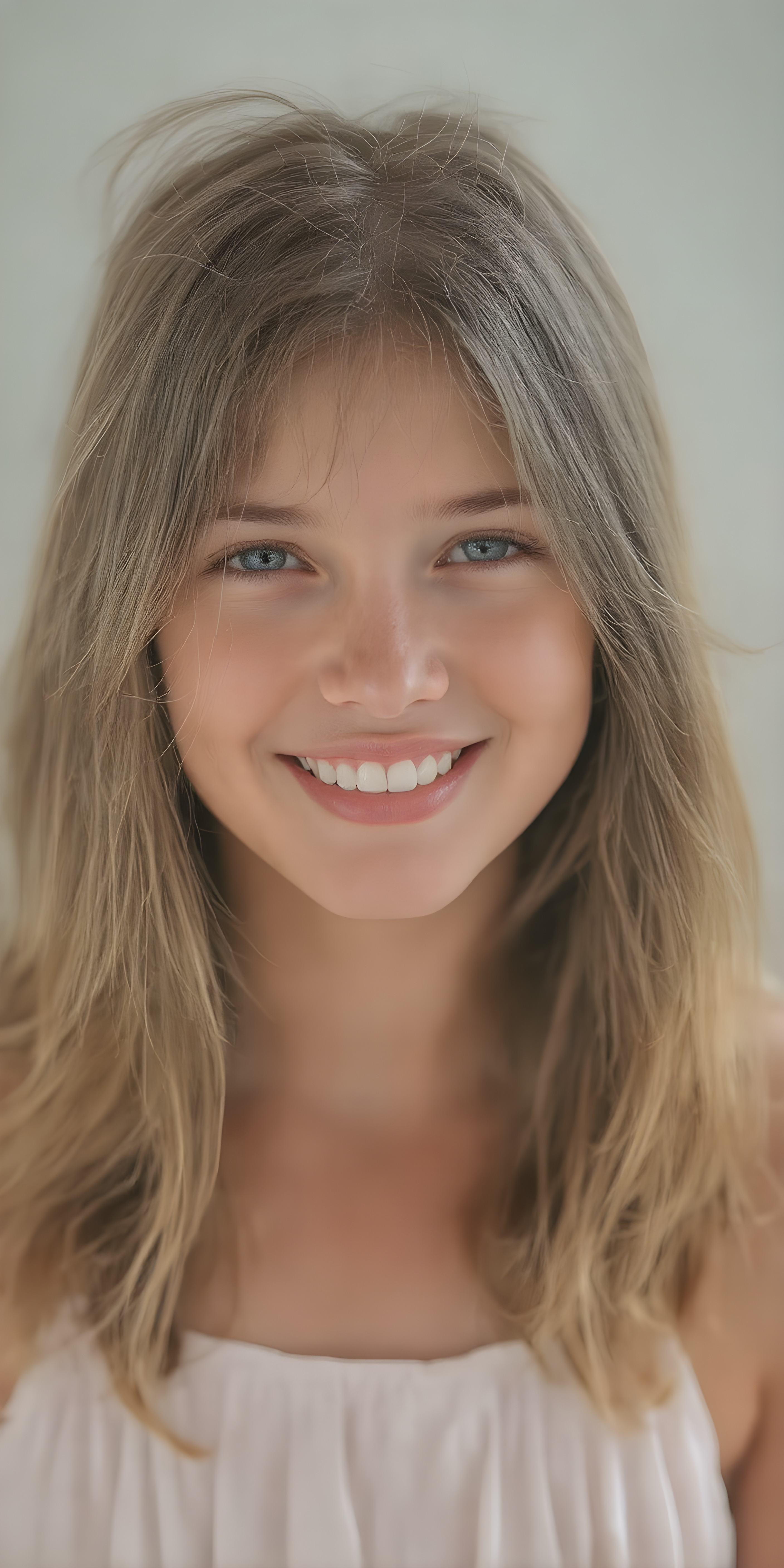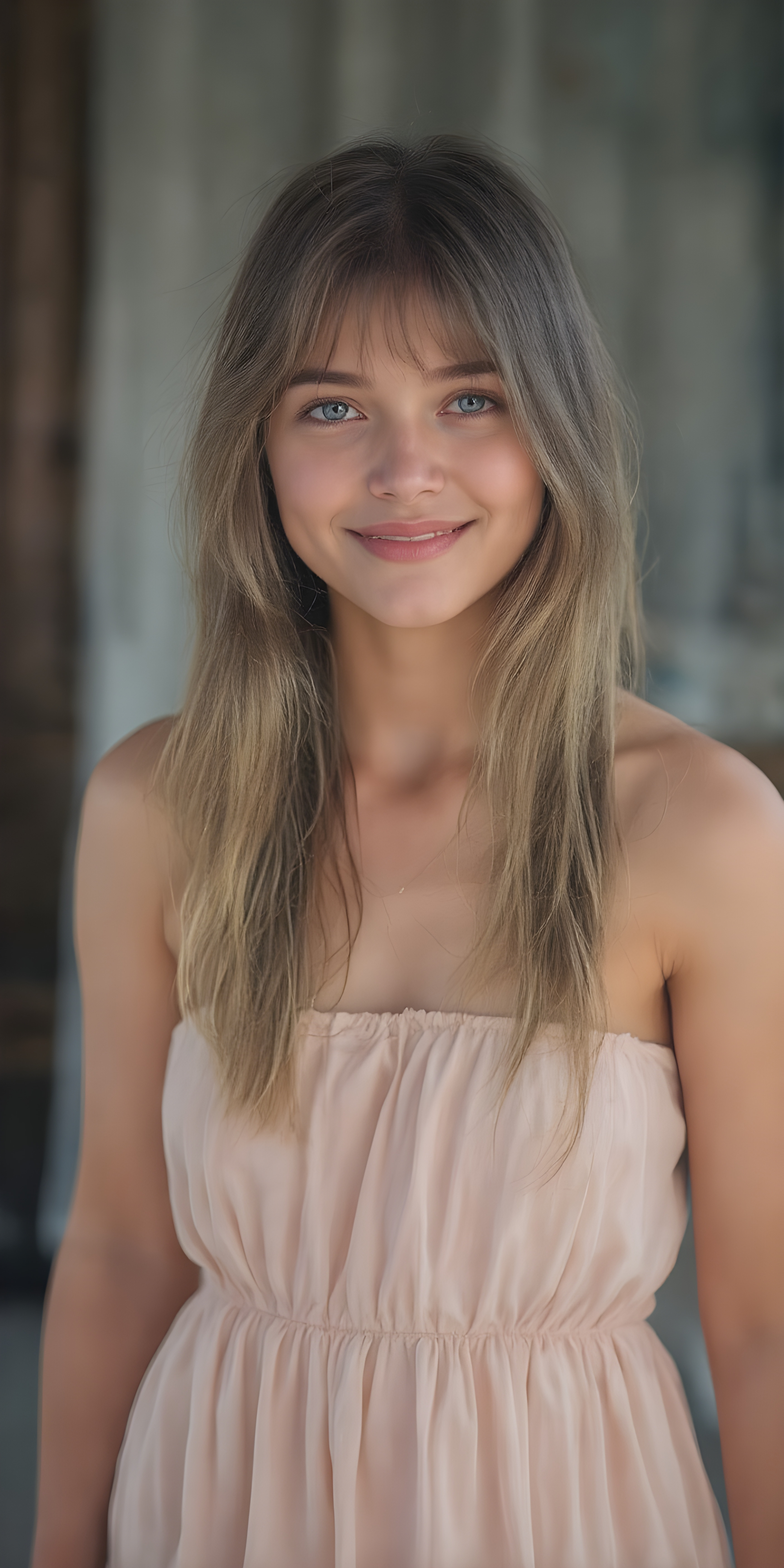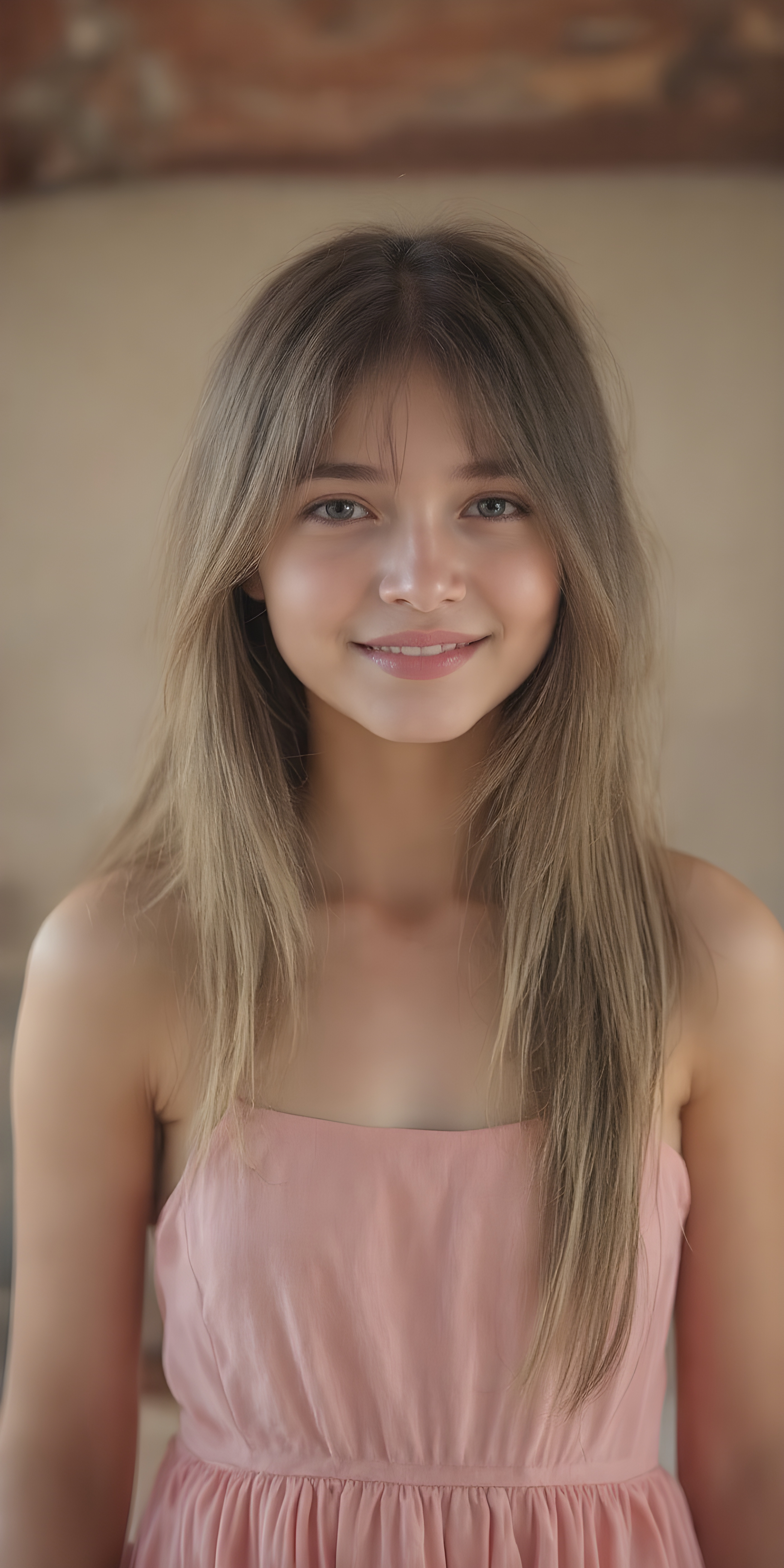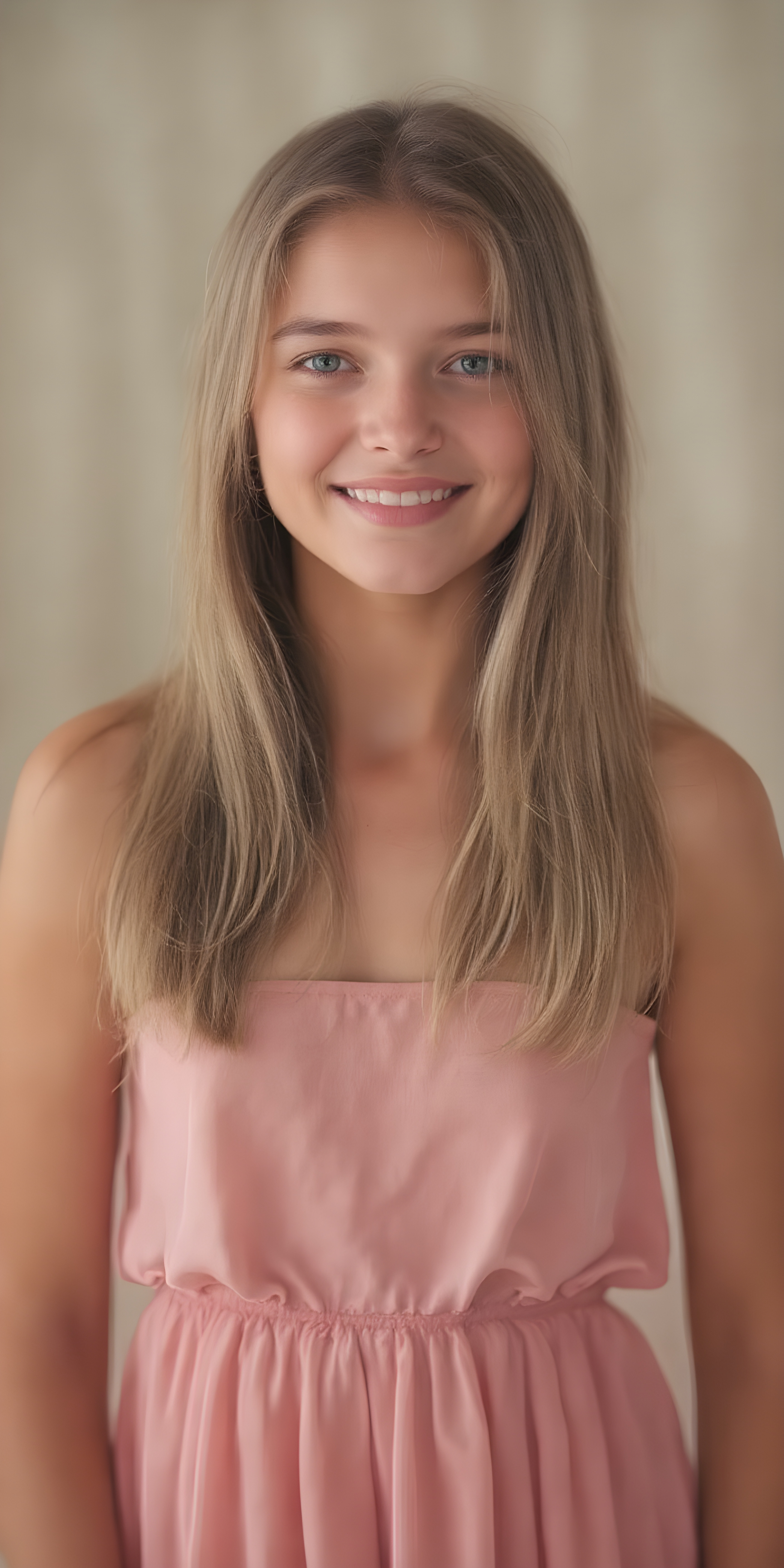 (((full body shot)) a (((vividly beautiful teen girl))), perfectly toned, intricate female form, dressed in a (((extremely light silky summer dress))) that emphasizes her natural beauty, featuring straight, full soft hair that gives off a gentle glow. Her smile radiates warmth and confidence, perfectly accentuating her adult face, white teeth, she exudes perfect physical and emotional health, representing a stunning 8K image that captures her perfectly serene yet playful essence