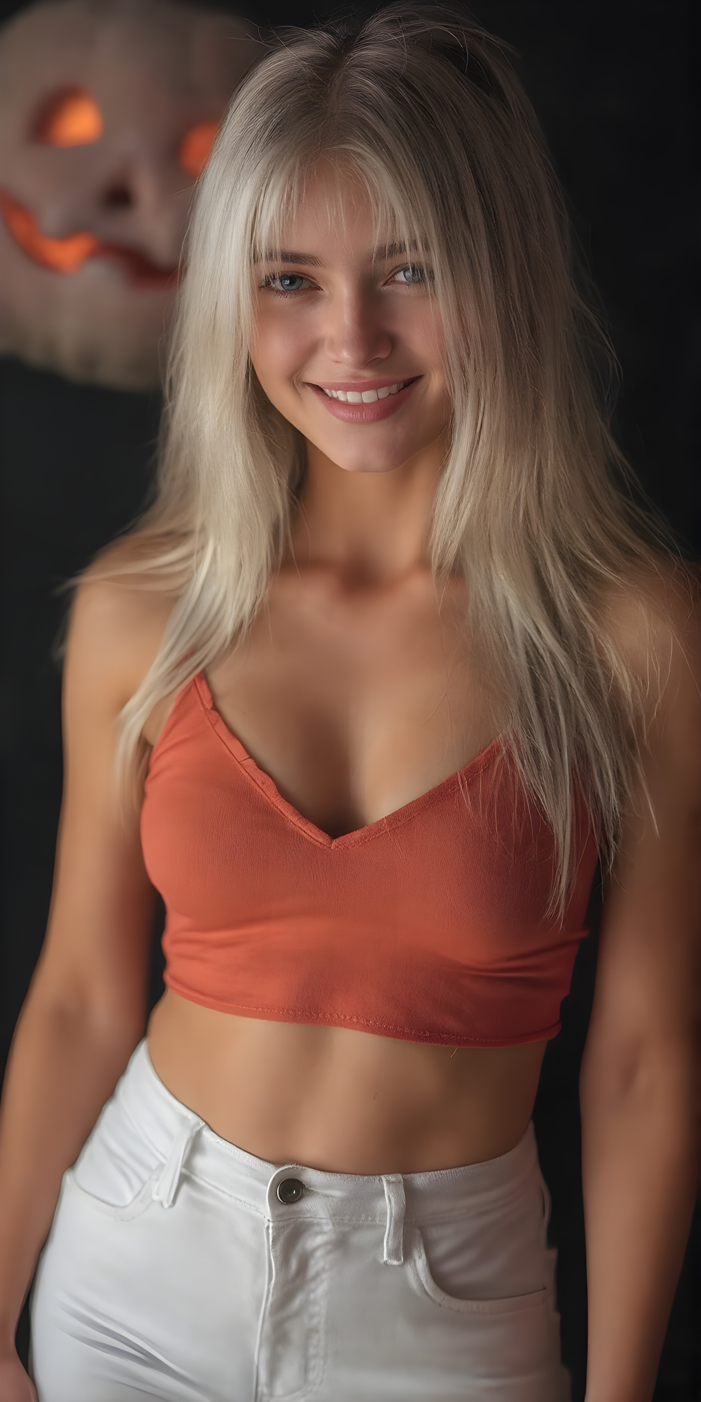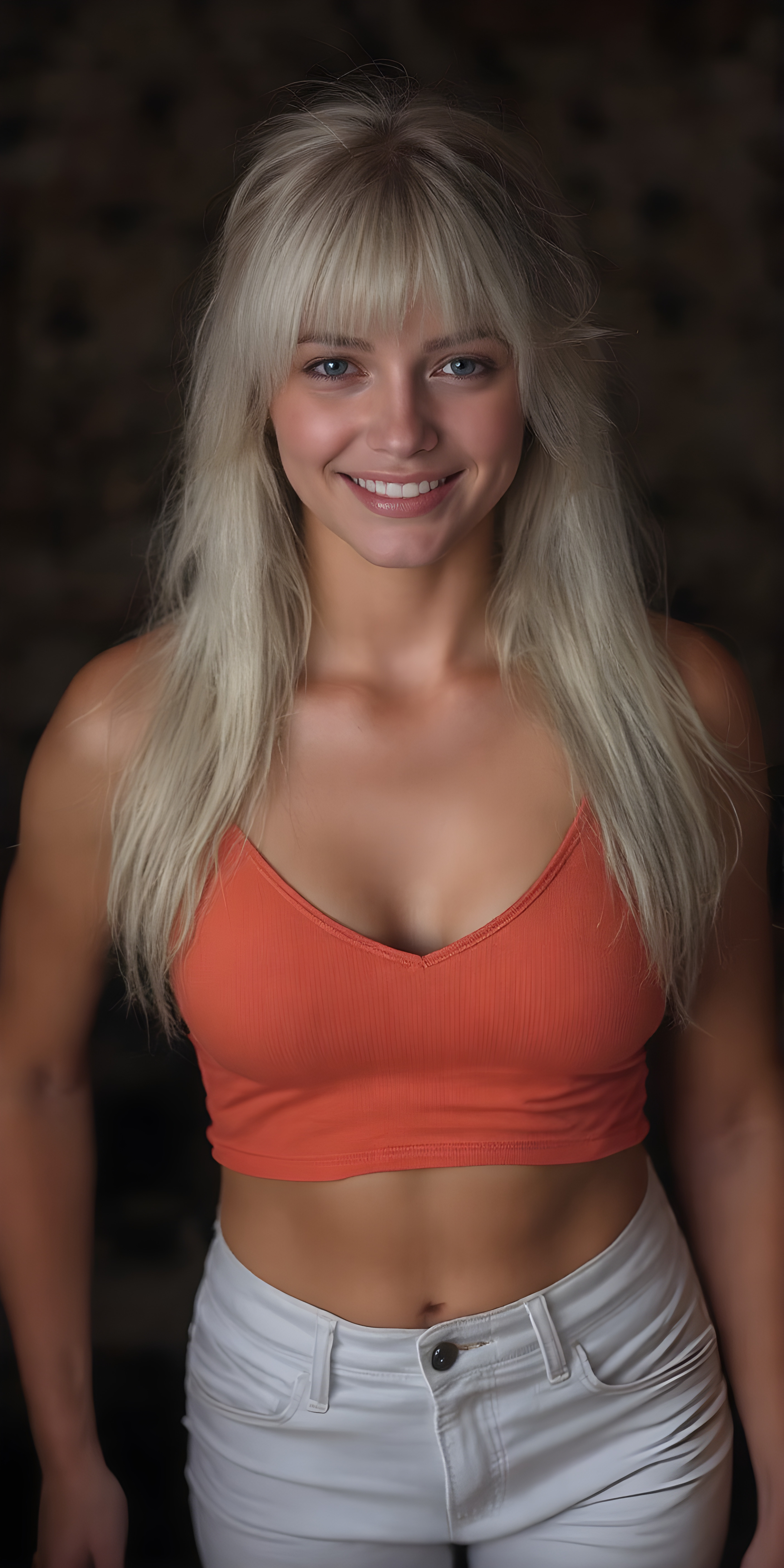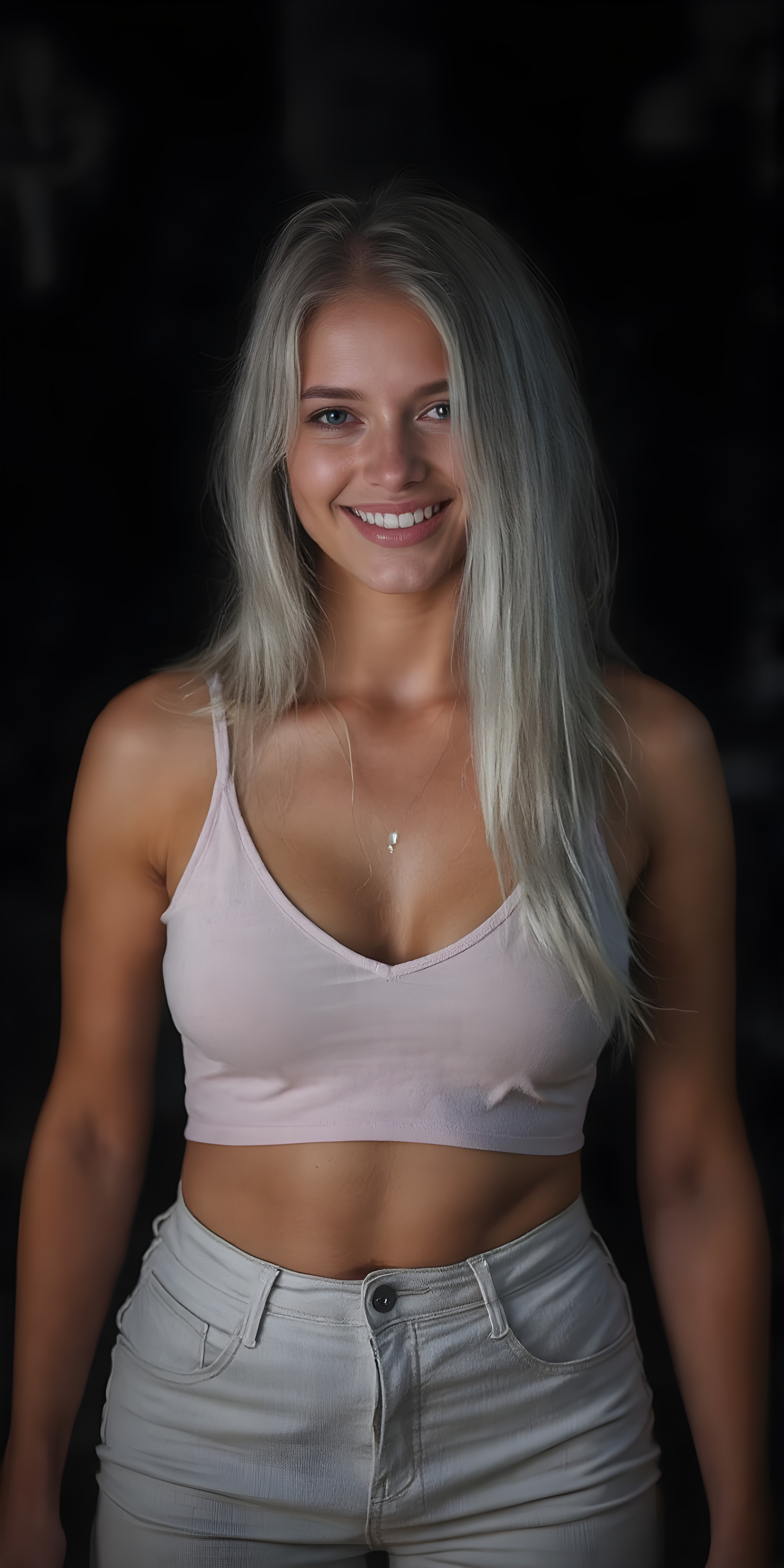 (((full body shot)) a (((vividly beautiful young cute adult tanned girl, busty))), with incredibly strong, thick, natural legs and a perfectly toned, intricate female form, dressed in a (((short cropped tank top, deep v-neck and white jeans pants))) that emphasizes her natural beauty, featuring straight, full soft straight white hair that gives off a gentle glow. Her smile radiates warmth and confidence, perfectly accentuating her adult face. She exudes perfect physical and emotional health, representing a stunning 8K image that captures her perfectly serene yet playful essence, all against a dark backdrop