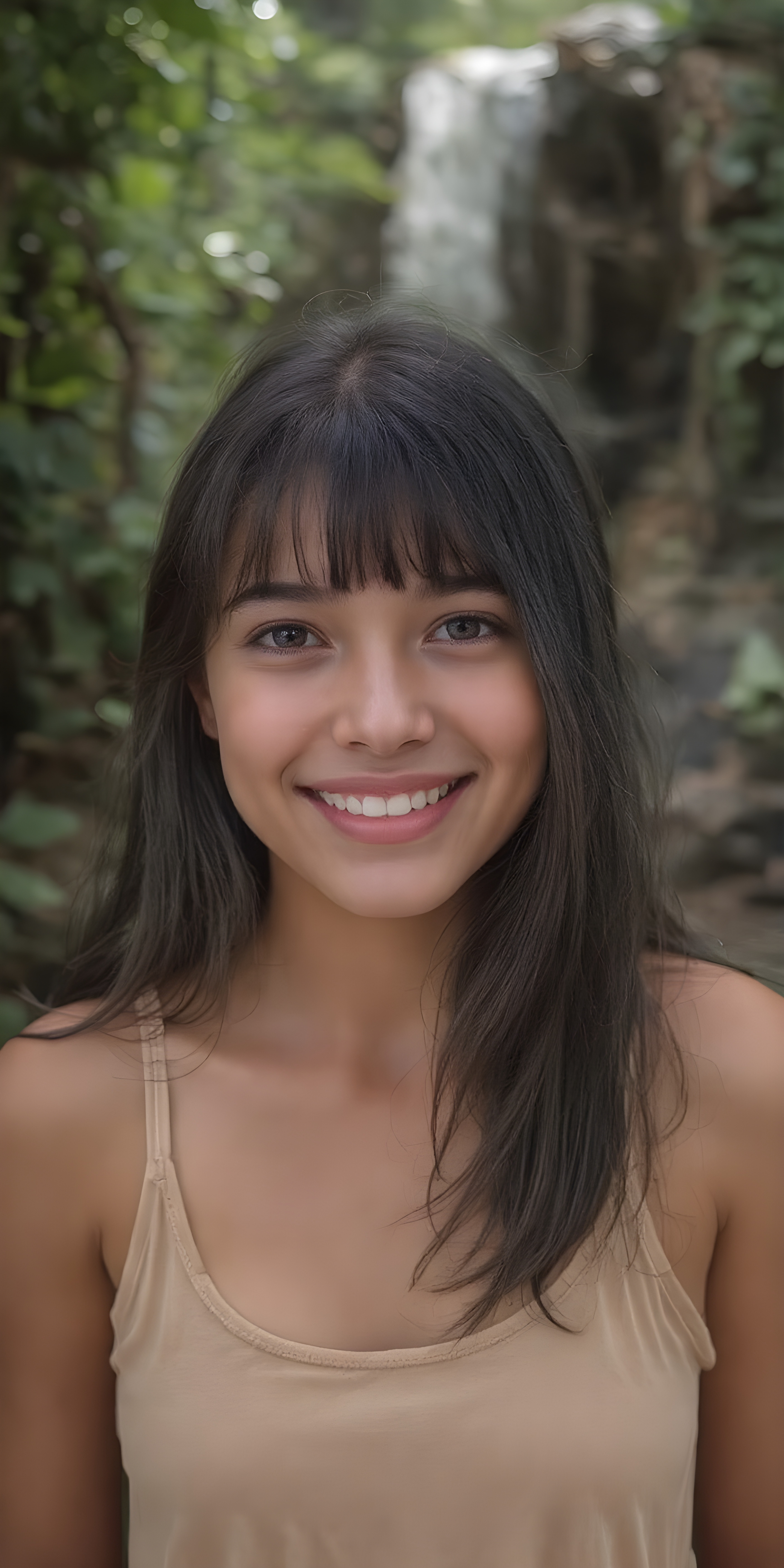 (((full body shot)) a (((vividly beautiful teen girl))), perfectly toned, intricate female form, dressed in a (((extremely light silky summer tank top))) that emphasizes her natural beauty, featuring straight, full soft black hair that gives off a gentle glow. Her smile radiates warmth and confidence, perfectly accentuating her adult face, white teeth, she exudes perfect physical and emotional health, representing a stunning 8K image that captures her perfectly serene yet playful essence