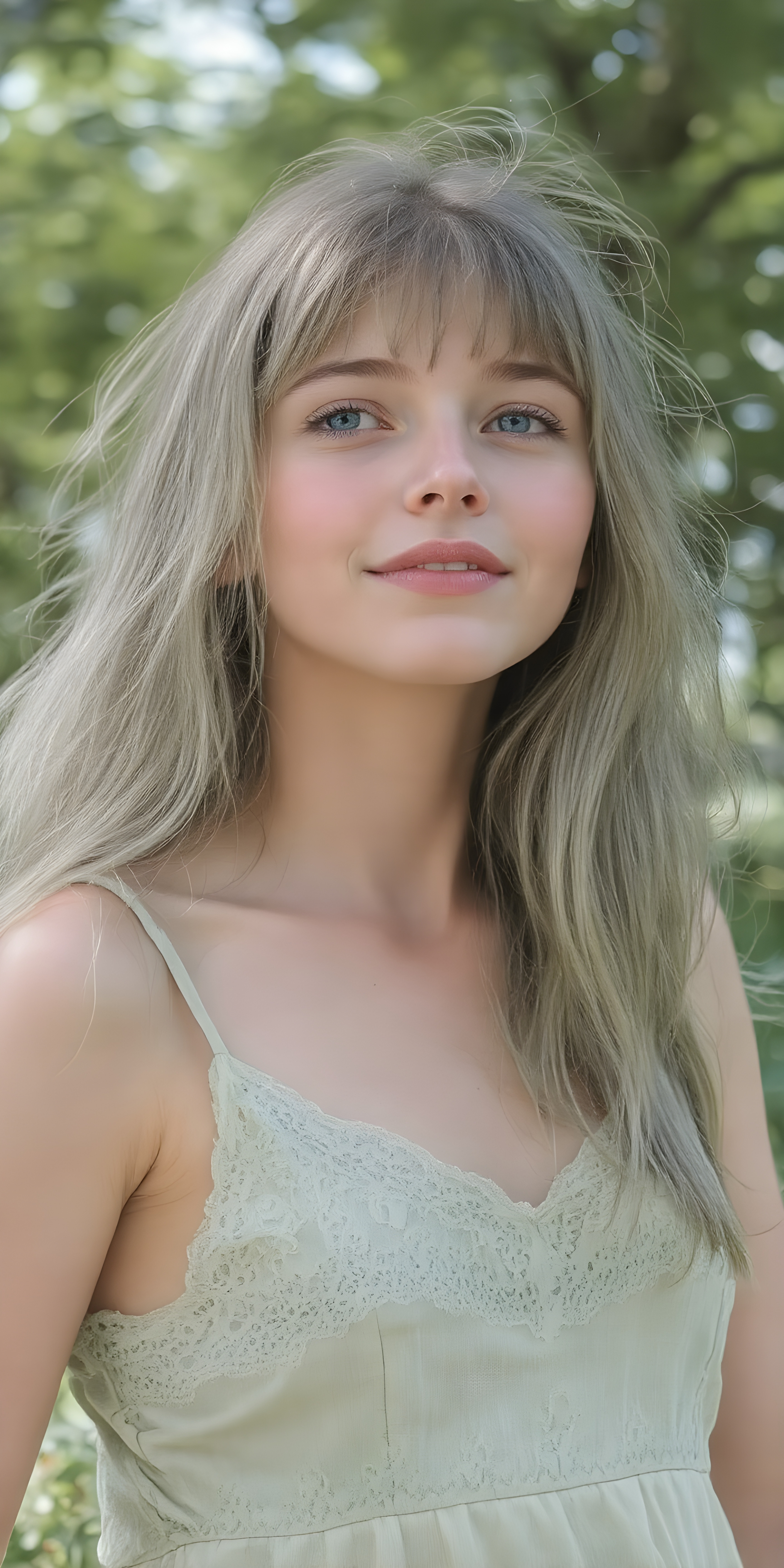 A (((beautiful young adult teen girl))), with long, flowing (((straight light green hair))), (((bright blue eyes))), and (((fair skin))), featuring (((full lips))) and (((white teeth))), that give off a (delicate yet inviting smile). She’s dressed in a (((very light, thin summer dress in a soft green hue))), with intricate details and (((very short, translucent, green shades)), that give off a (soft glow) and frame her youthful figure on a (mild grassy hill) looking up at the (sunny sky) and beautiful green trees in the background. She exudes an air of (serene beauty) and is painted in a (soft, impressionistic style) that gives off a (fantastical, dreamlike aesthetic) ((view from the side))