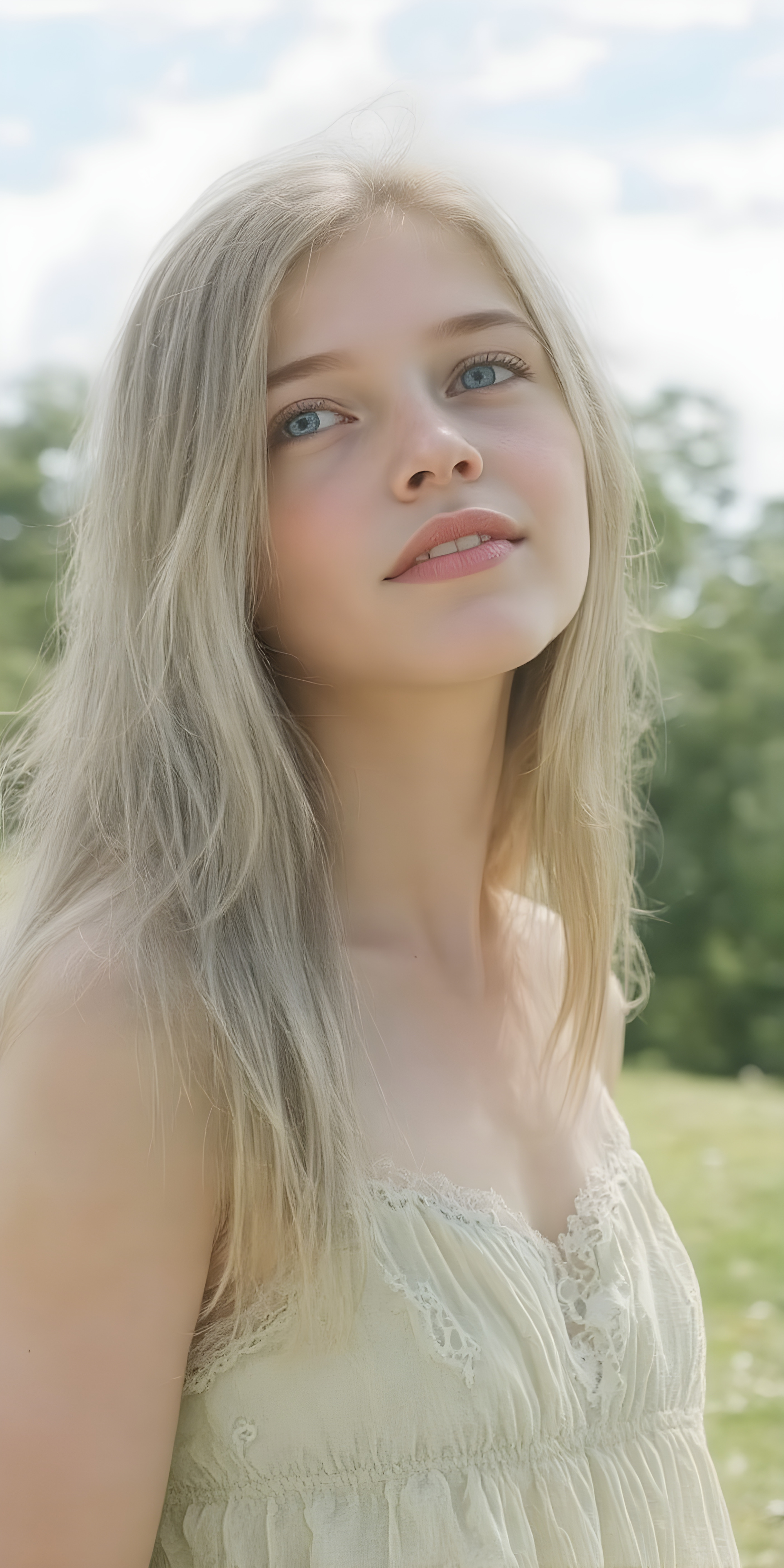 a beautifully (((full body image))) of a (((young teen girl))), with an athletic and lean figure, standing confidently in a (sunny park), surrounded by lush greenery and colorful flowers. Her blonde hair cascades down her back in long, straight locks. She wears a very light, tight, short dress in a summer color that flatters her youthful skin. The dress, which is made of a soft, semi-transparant fabric, has a low cut, and the skirt is short and tight. She smiles confidently as she looks up at the sky, side view