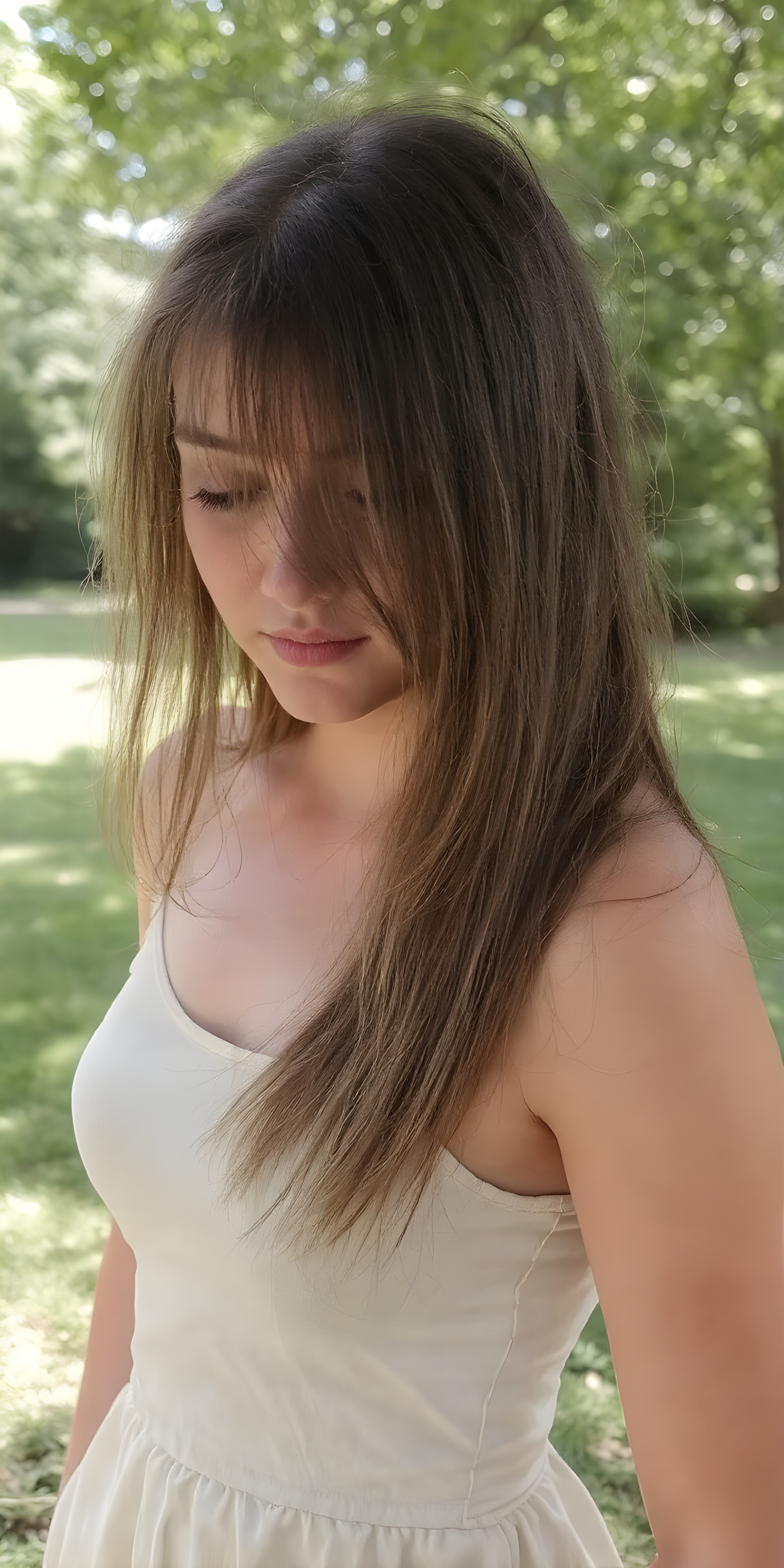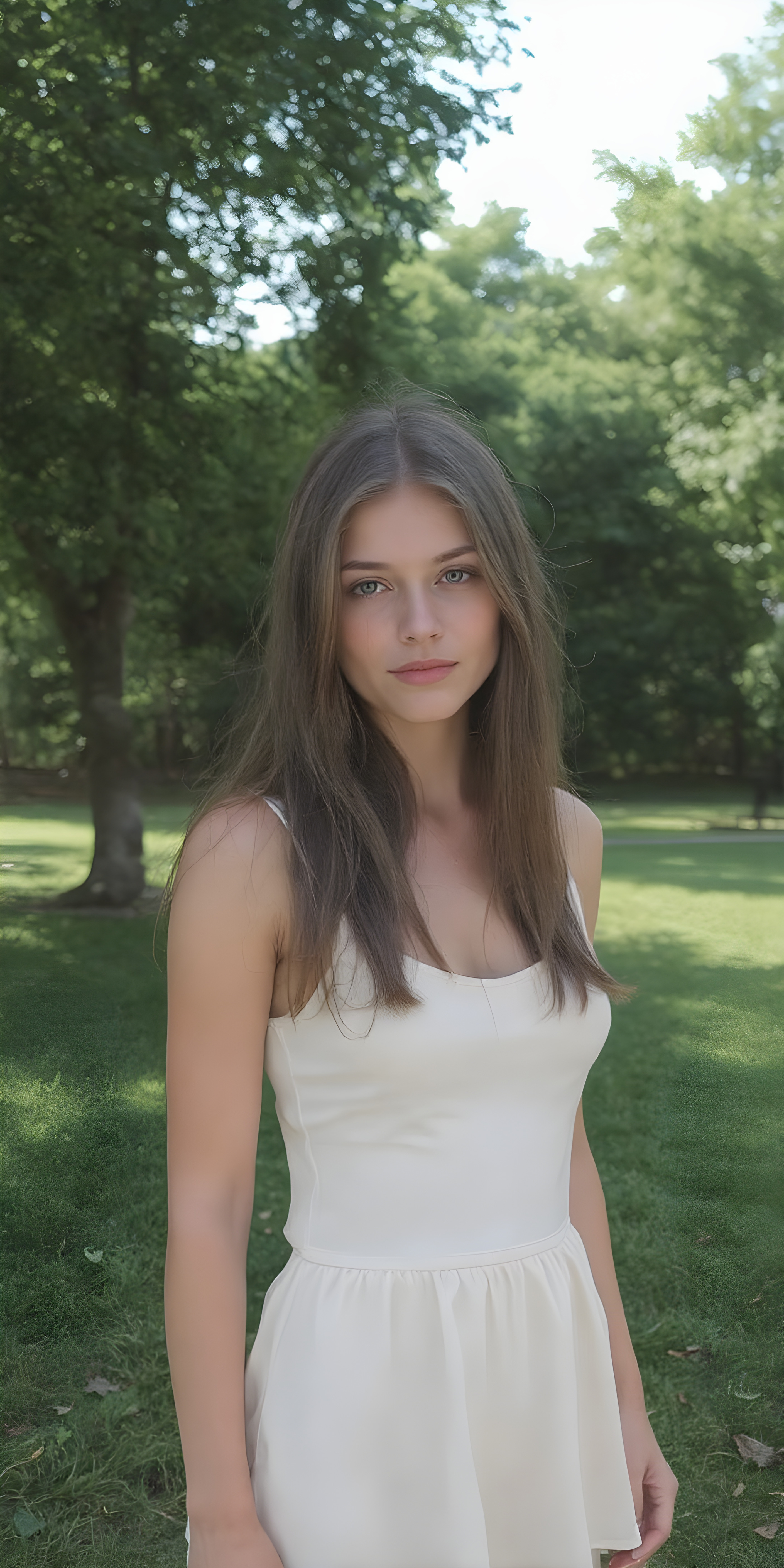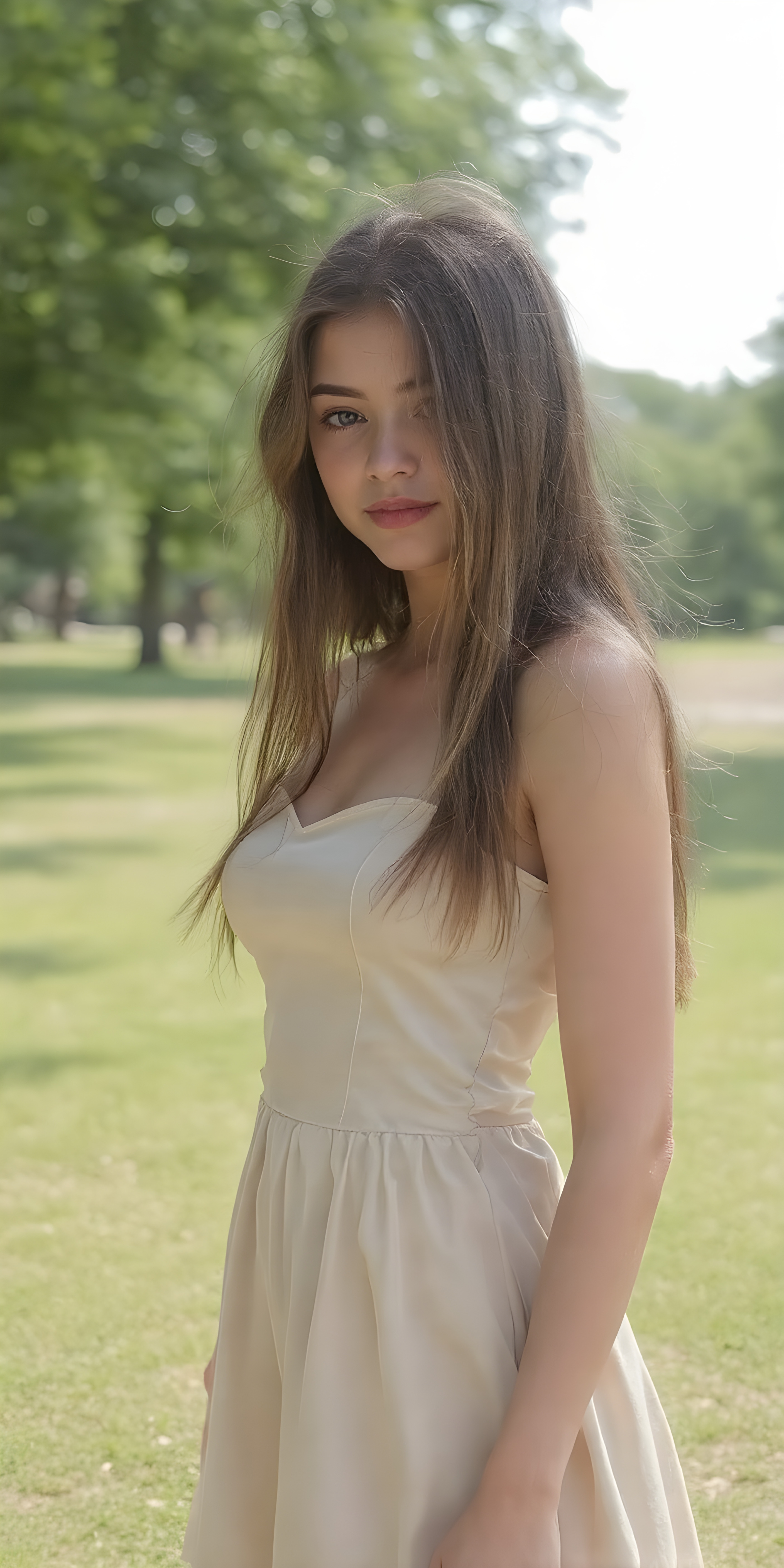 A young adult teen girl in a green, sunny park, wearing a light, thin short summer dress (tank top an round skirt). She has a perfect curved fit body. Her long, brown straight soft full hair falls down her back, stand in front of the viewer and looks seductive