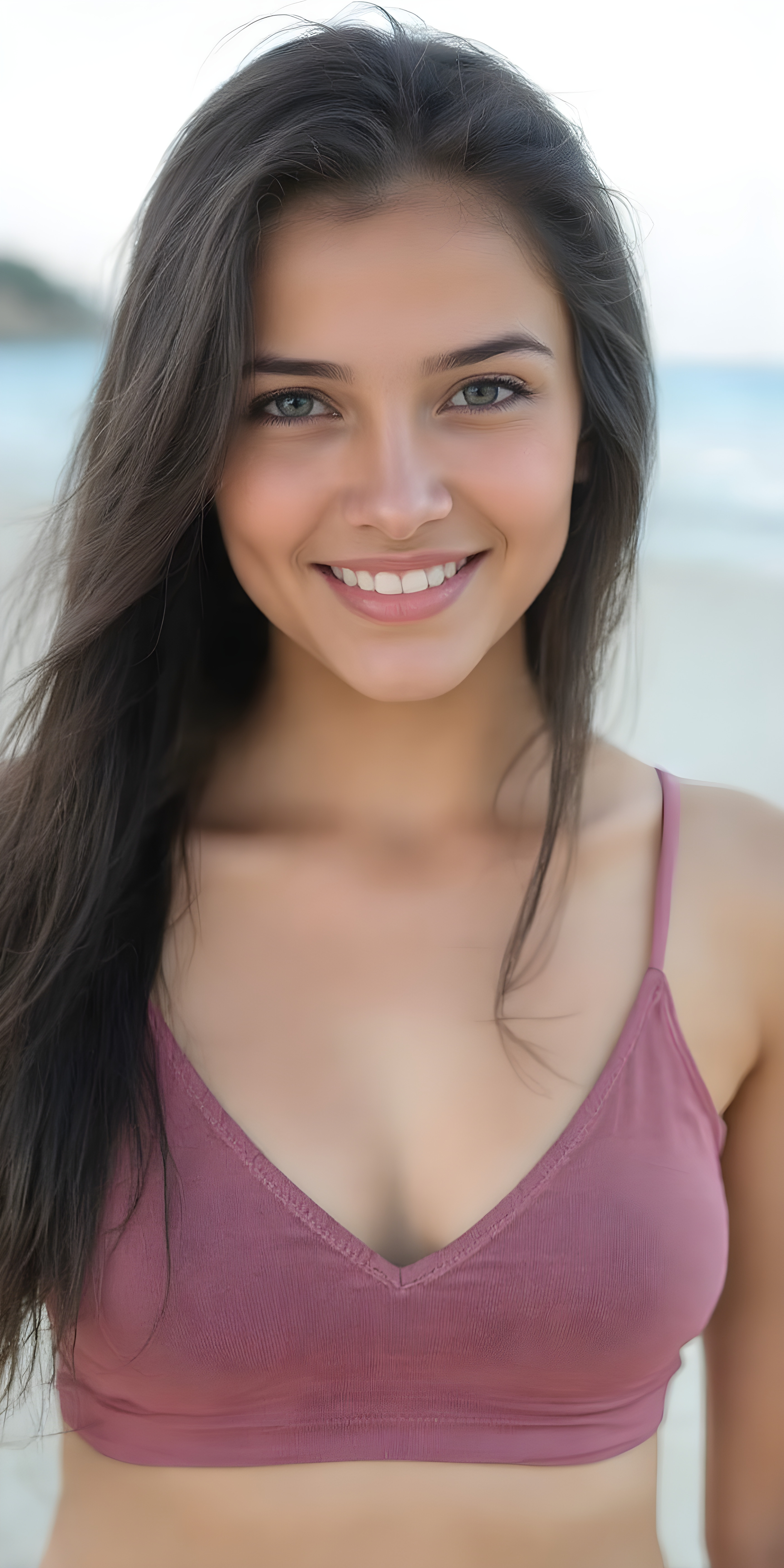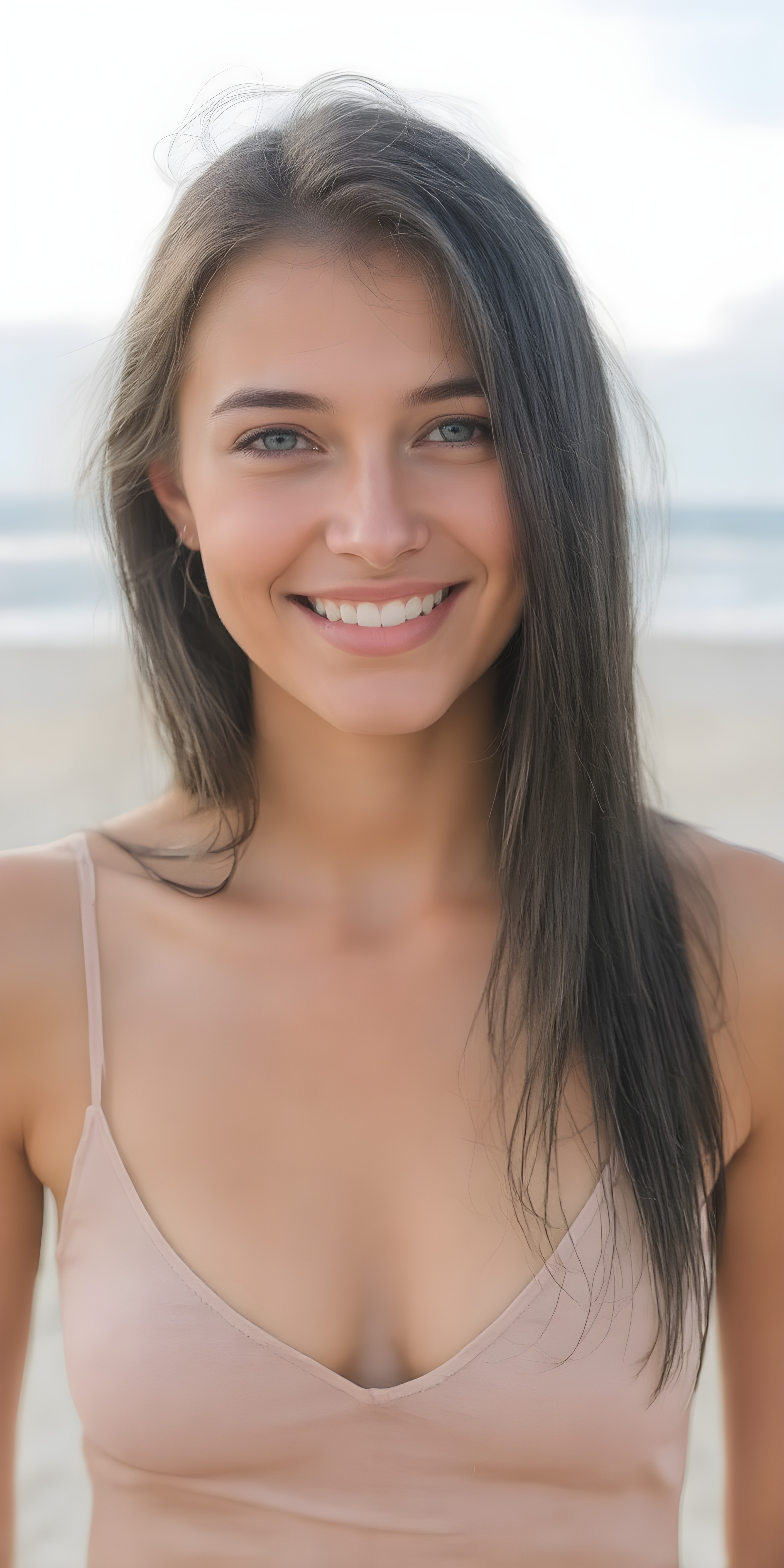 a beautifully (((full body image))), cute young adult girl, with tanned skin, long black straight soft wet hair, on a lonely beach and smiles into the camera, her upper body is in the center, she has a gorgeous body, thin tank top, deep v-neck