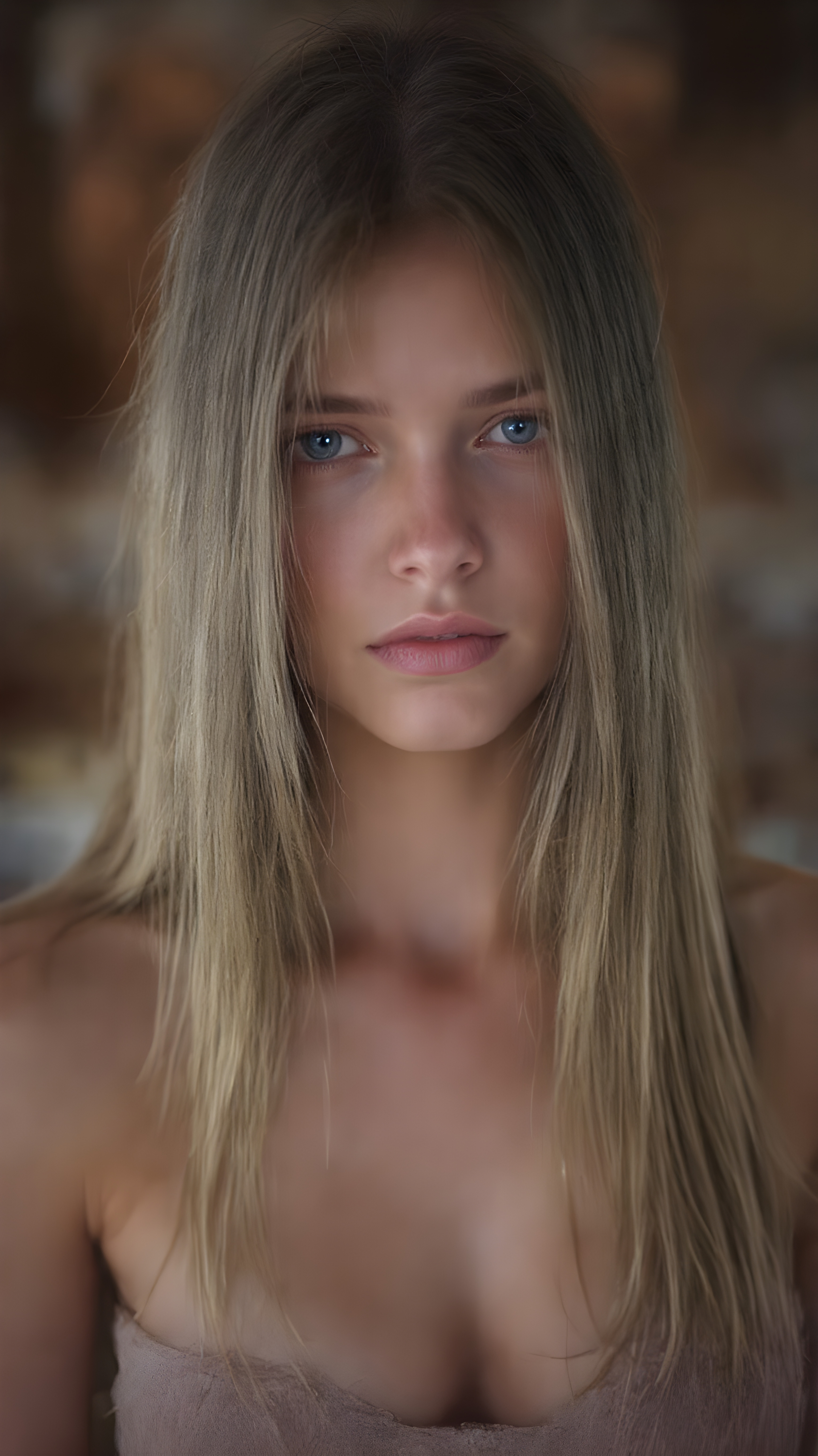 a young, gentle adult busty girl with very long, soft straight brown hair and a round face. She has blue eyes and gentle features. Her young, perfect body radiates pure femininity and she looks seductively into the camera. She wears a thin cropped short tank top, deep v-neck