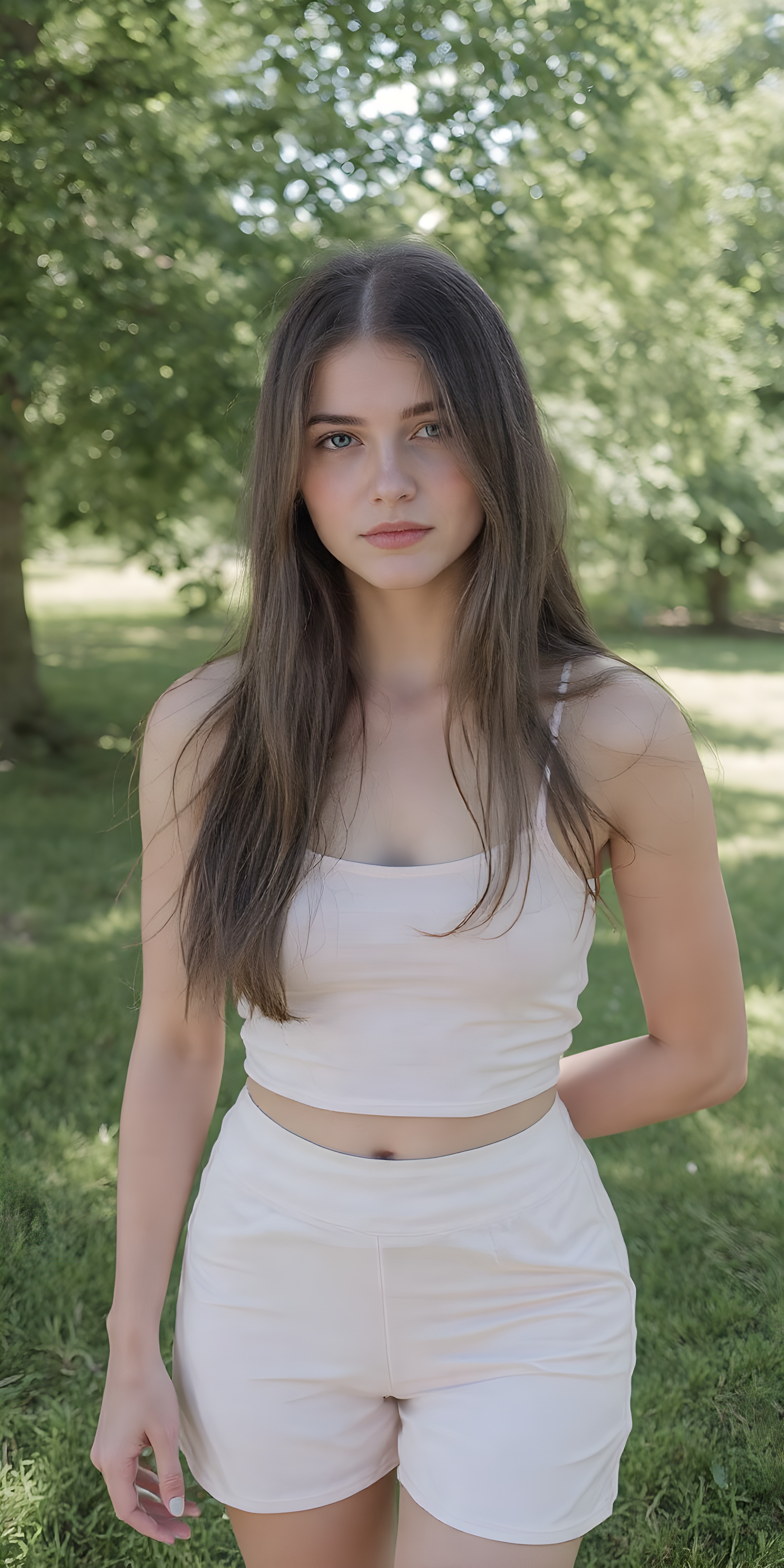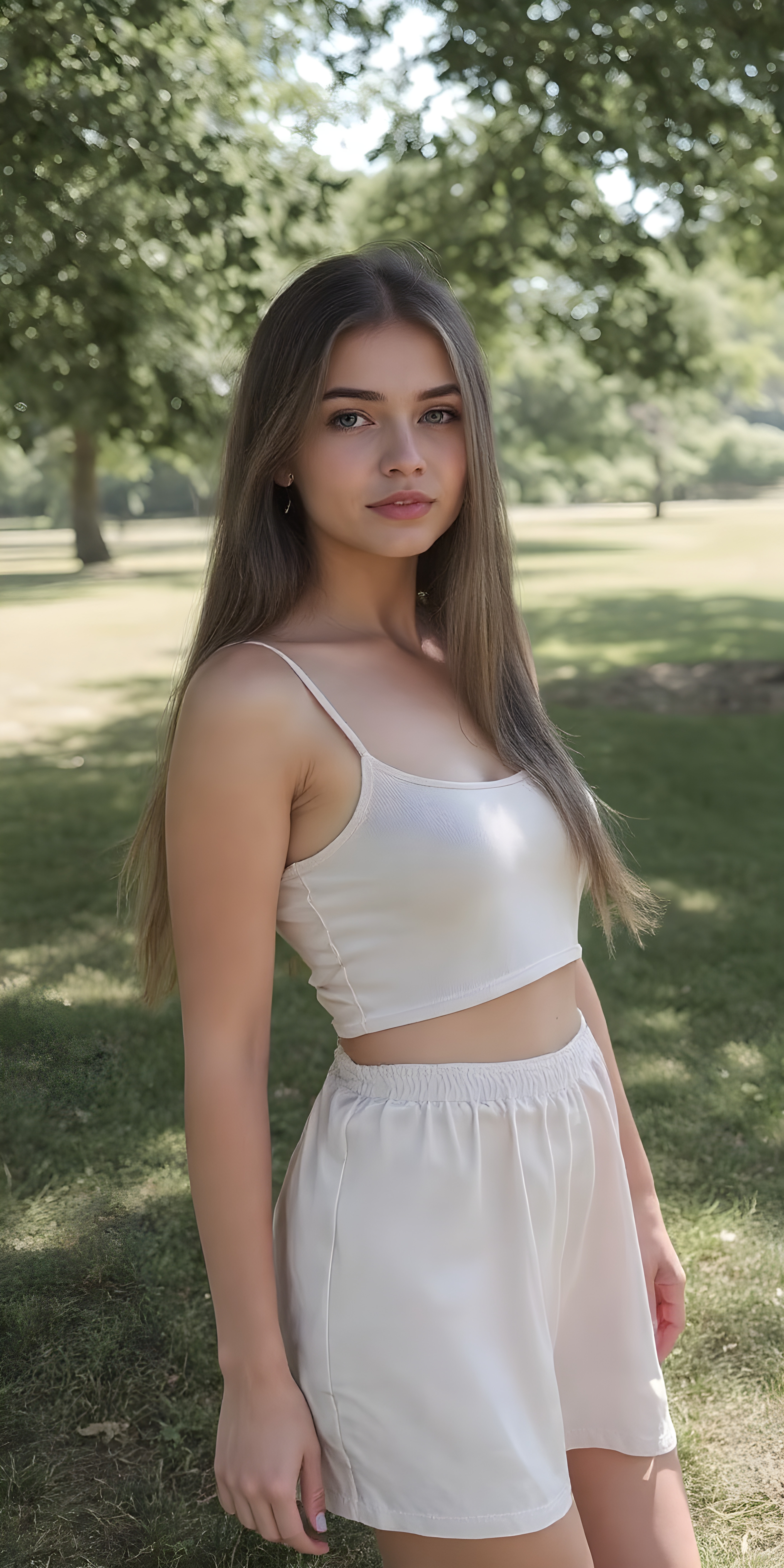 full body shot, a young adult teen girl in a green, sunny park, wearing a light, thin short summer dress (paired in a separate short, cropped tank top and short round skirt). She has a perfect curved fit body. Her long, brown straight soft full hair falls down her back, stand in front of the viewer and looks seductive, perfect belly button
