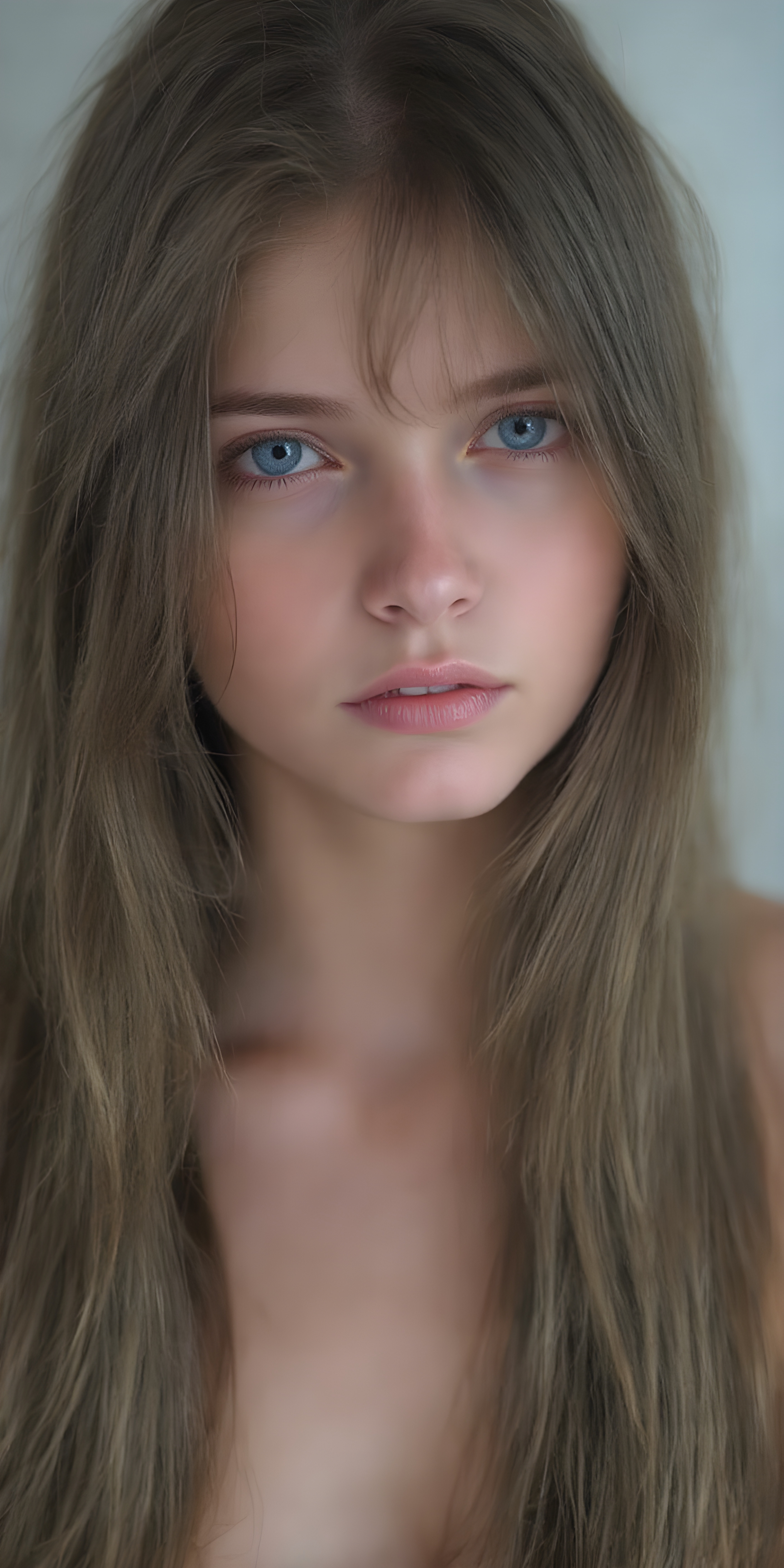 (realistic and detailed photo), (full body shot) a young, gentle adult busty teen girl with very long, soft straight brown hair, her full hair falls over the upper body and cover her body, round face. She has blue eyes and gentle features. Her young, perfect body radiates pure femininity and she looks seductively into the camera