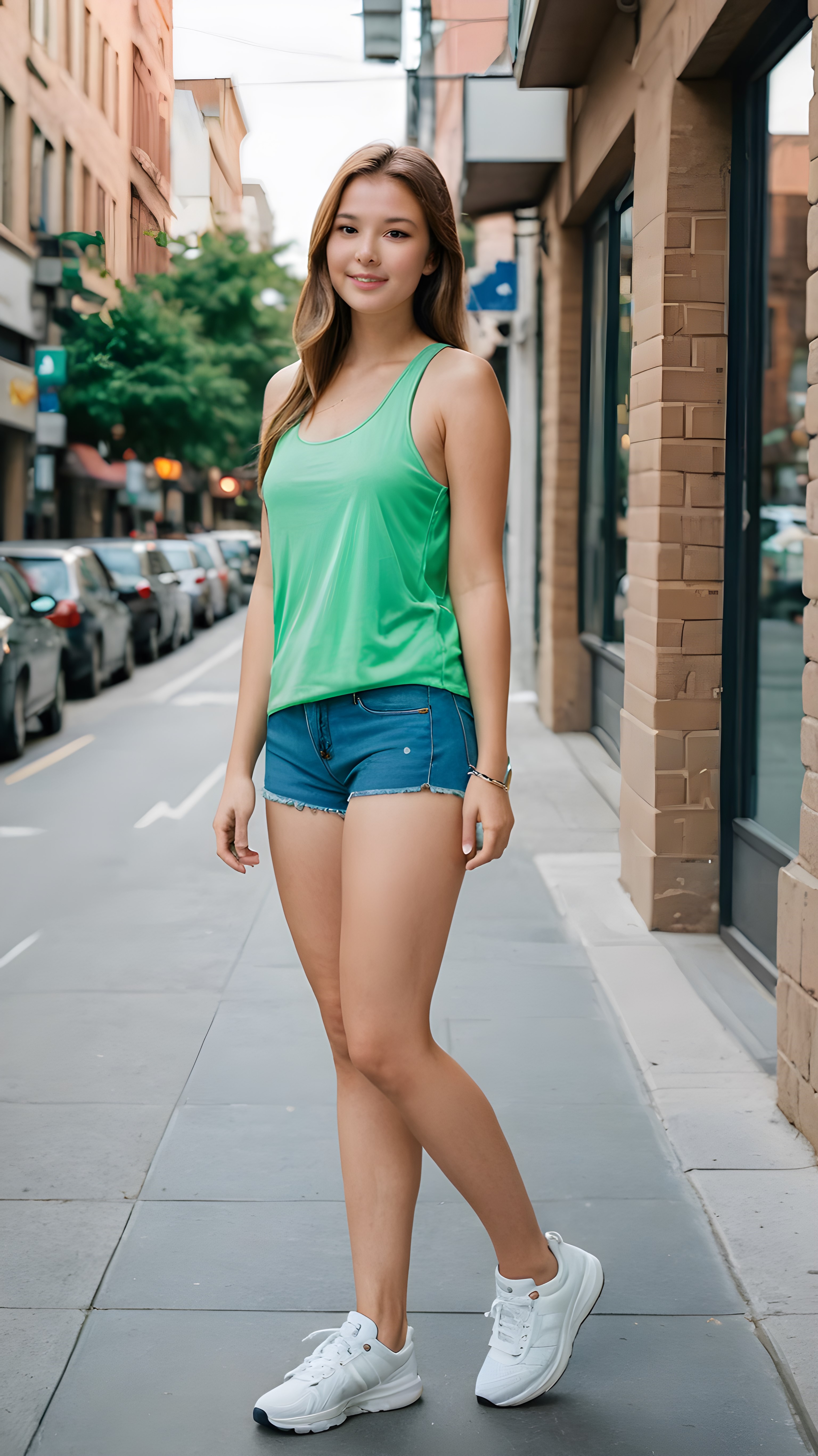 a (((beautiful young girl))) with a curvy silhouette and (((straight light brown hair))), complemented by (((pale, flawless skin))). She’s dressed in a (((vivid green tank top))), (((blue jean shorts))), and (((comfortable sneakers))), capturing a carefree vibe as she strolls through (modern, bustling downtown)