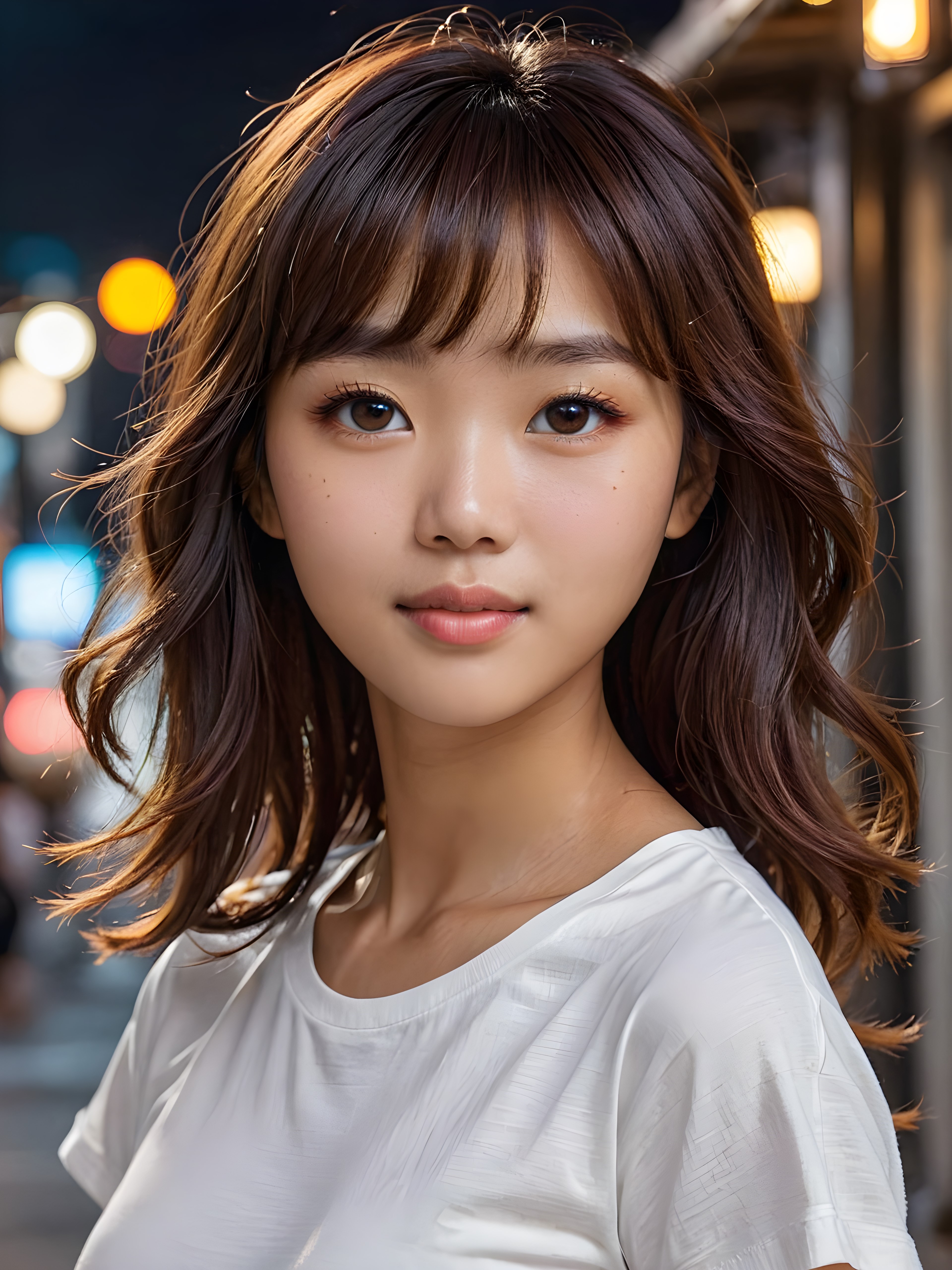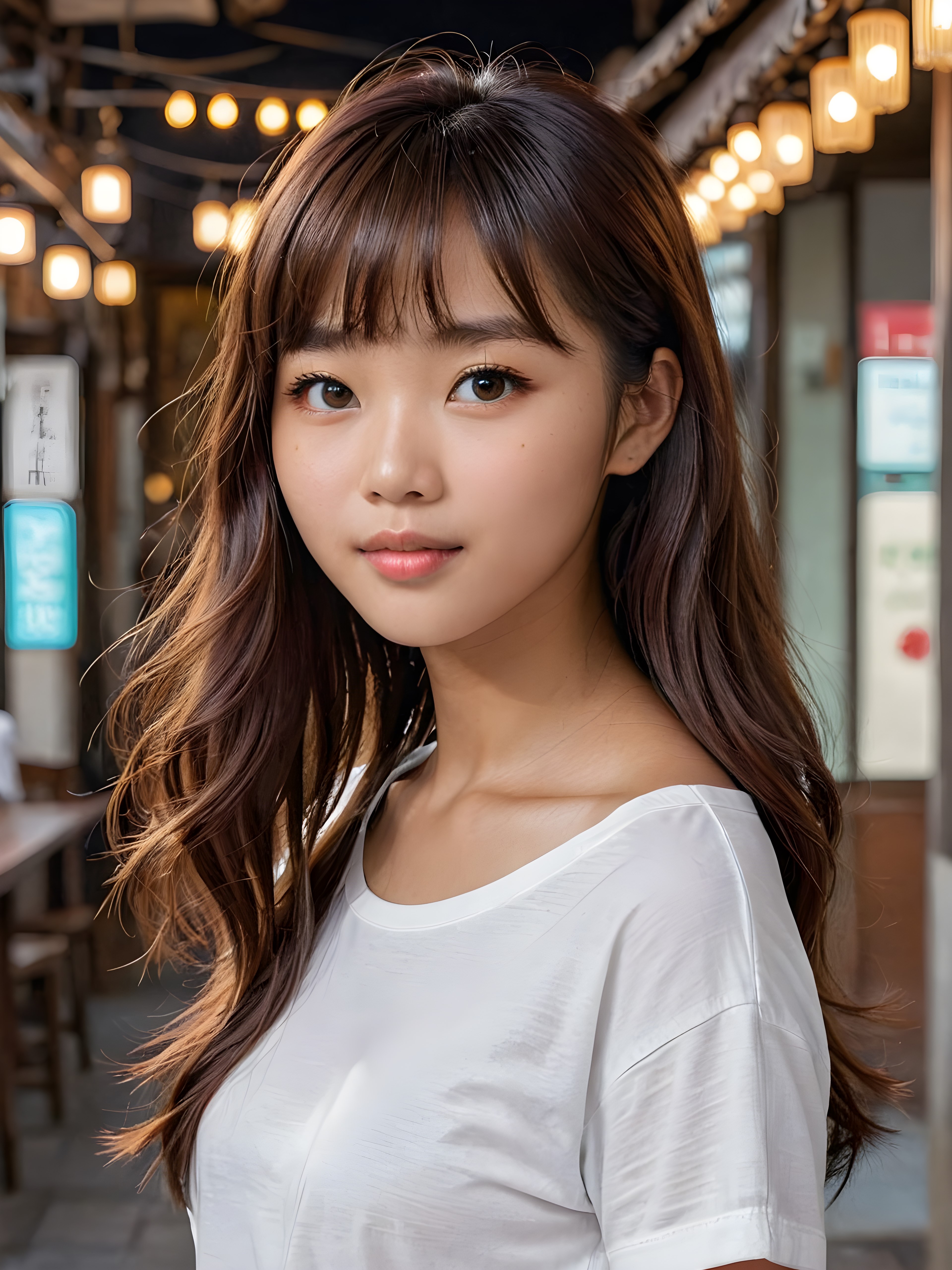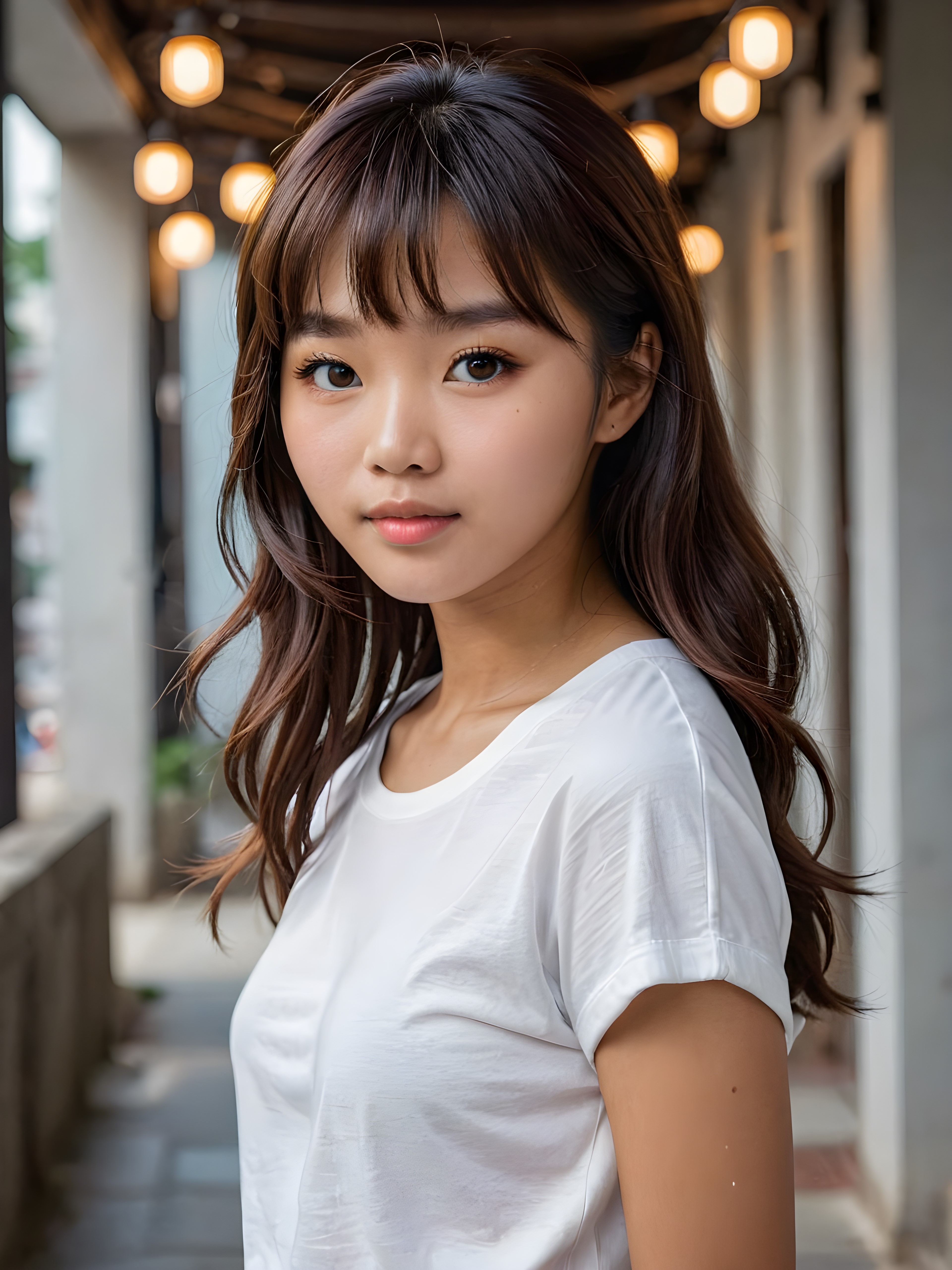 a (((cute 16-year-old Filipino girl with intricate ((bangs)), featuring highly detailed, ultra realistic hair that extends beyond her shoulders. She’s clad in a (((perfectly curved and fitted white short t-shirt))), with a stunning face that exudes realism, complete with glowing, ultra-realistic amber eyes and delicate, detailed maroon straight hair that flows down her back. Her skin is highly detailed, with subtle wrinkles and a warm smile that draws the viewer in. Captured in an incredibly advanced image with deeply saturated colors, advanced film grain, and a soft focus that creates a sense of beauty and wonder. This advanced image represents the pinnacle of digital artistry, with unparalleled detail and advanced technology, making it a true masterpiece that pushes the boundaries of what is possible