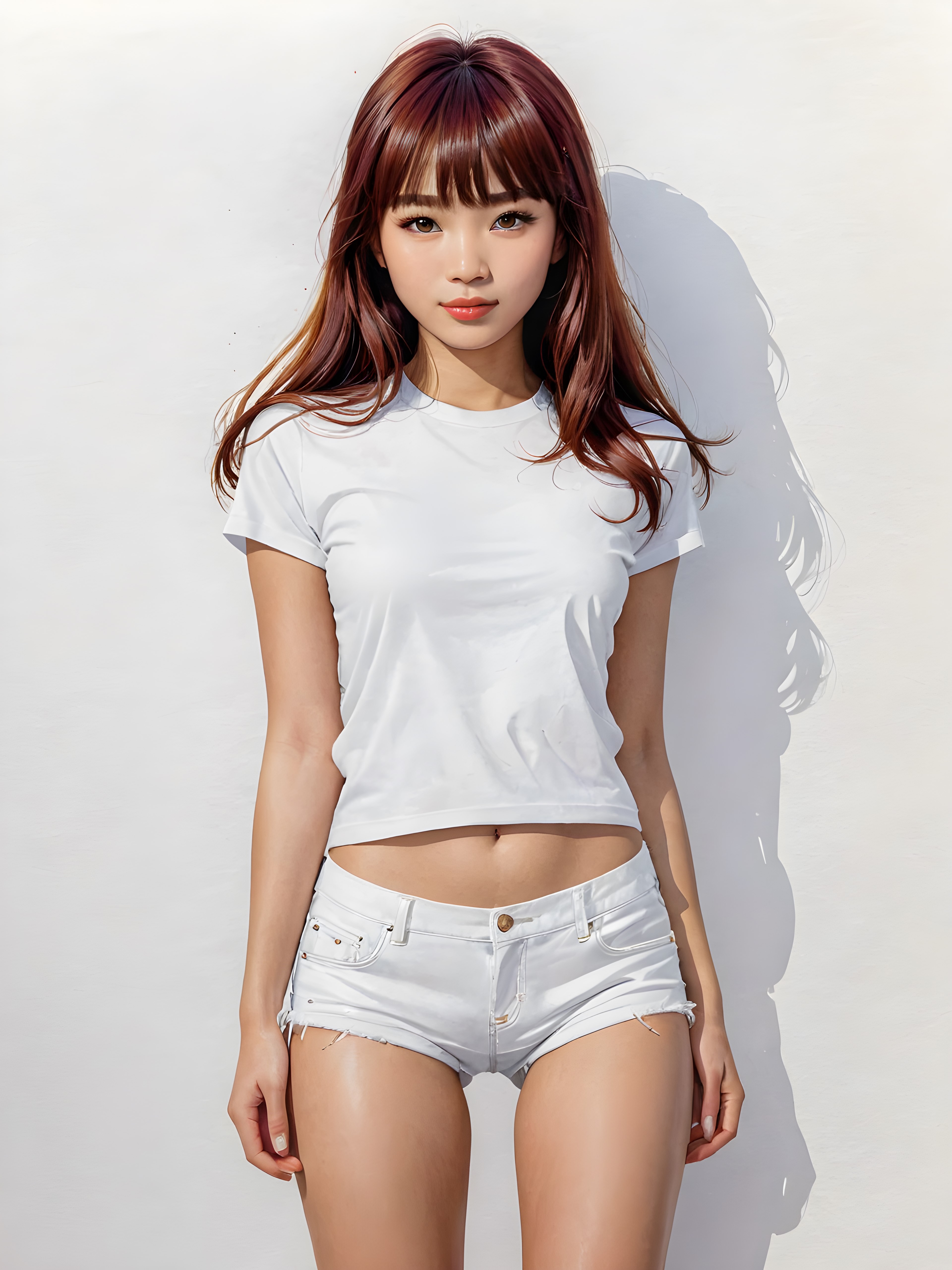 a (((cute 16-year-old Filipino girl with intricate Korean-style bangs))), featuring highly detailed, ultra realistic hair that extends beyond her shoulders. She’s clad in a (((perfectly curved and fitted white short shirt))), with a stunning face that exudes realism, complete with glowing, ultra-realistic amber eyes and delicate, detailed maroon straight hair that flows down her back. Her skin is highly detailed, with subtle wrinkles and a warm smile that draws the viewer in. Captured in an incredibly advanced image with deeply saturated colors, advanced film grain, and a soft focus that creates a sense of beauty and wonder. This advanced image represents the pinnacle of digital artistry, with unparalleled detail and advanced technology, making it a true masterpiece that pushes the boundaries of what is possible