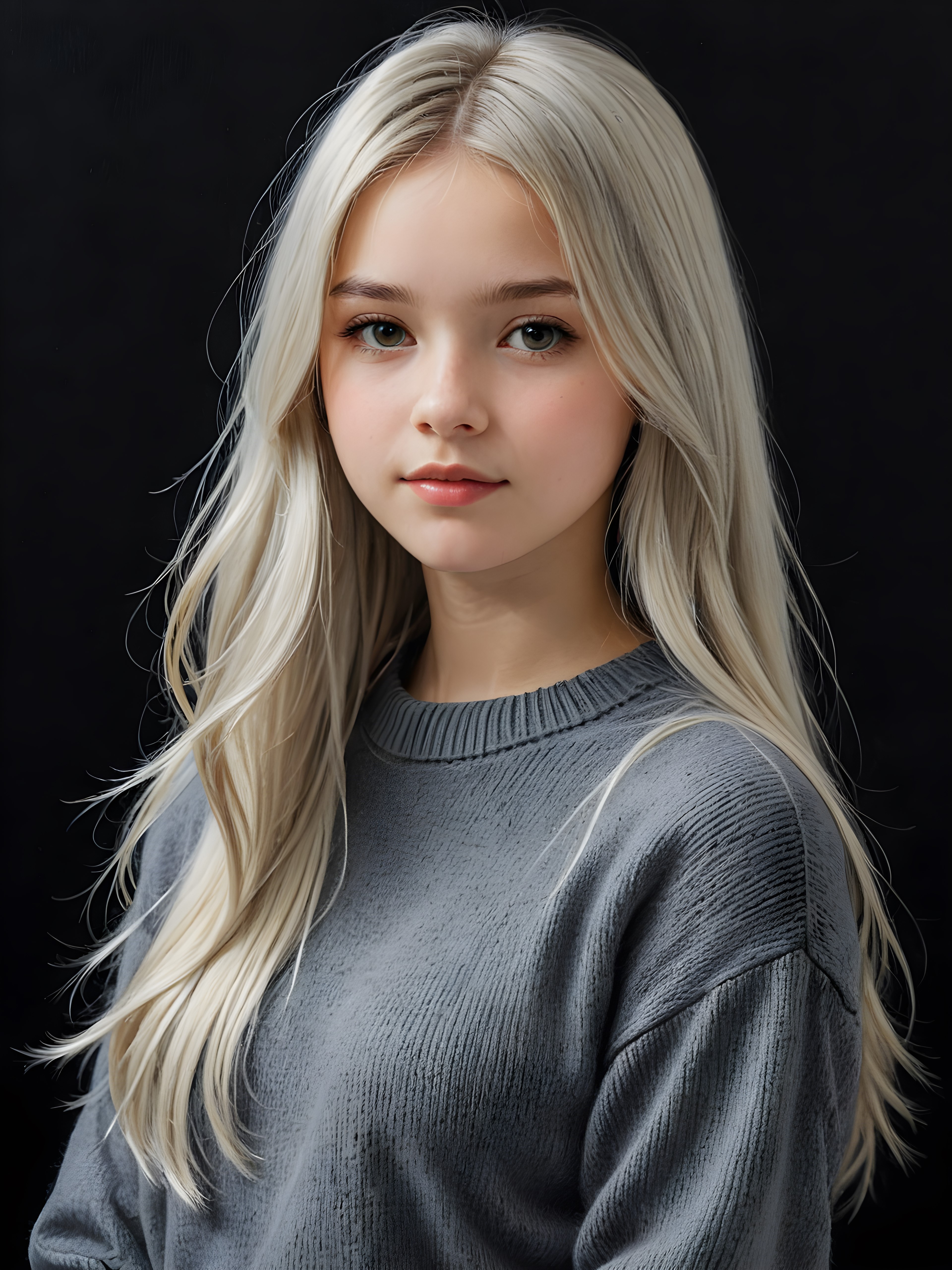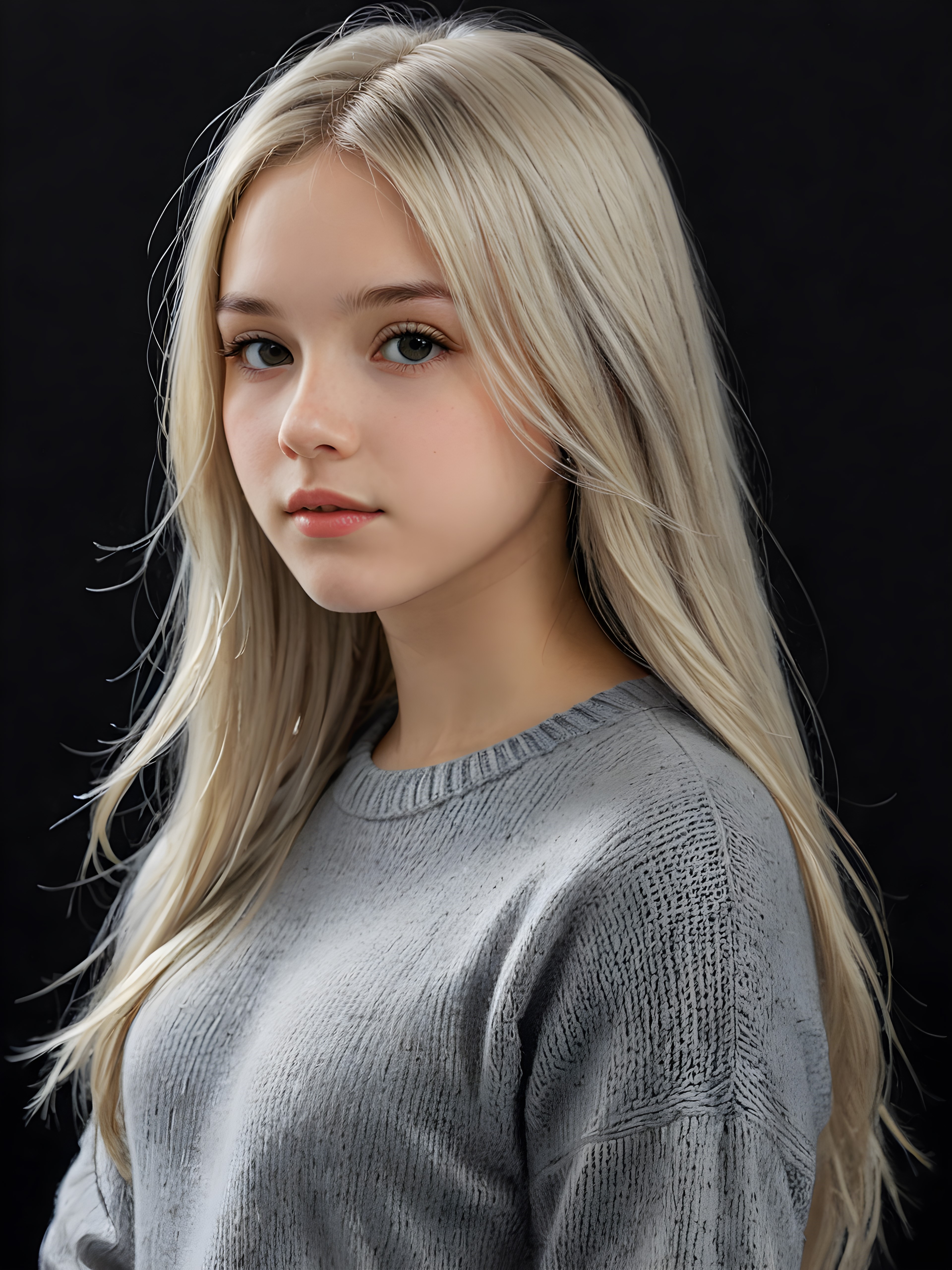 a detailed an realistic photo from a young teen girl, 13 years old, (((jet platinum-white thick straight long hair)) and bangs), ((wears a fine grey wool sweater)), ((stunning)), ((gorgeous)), ((black background)) ((side view))