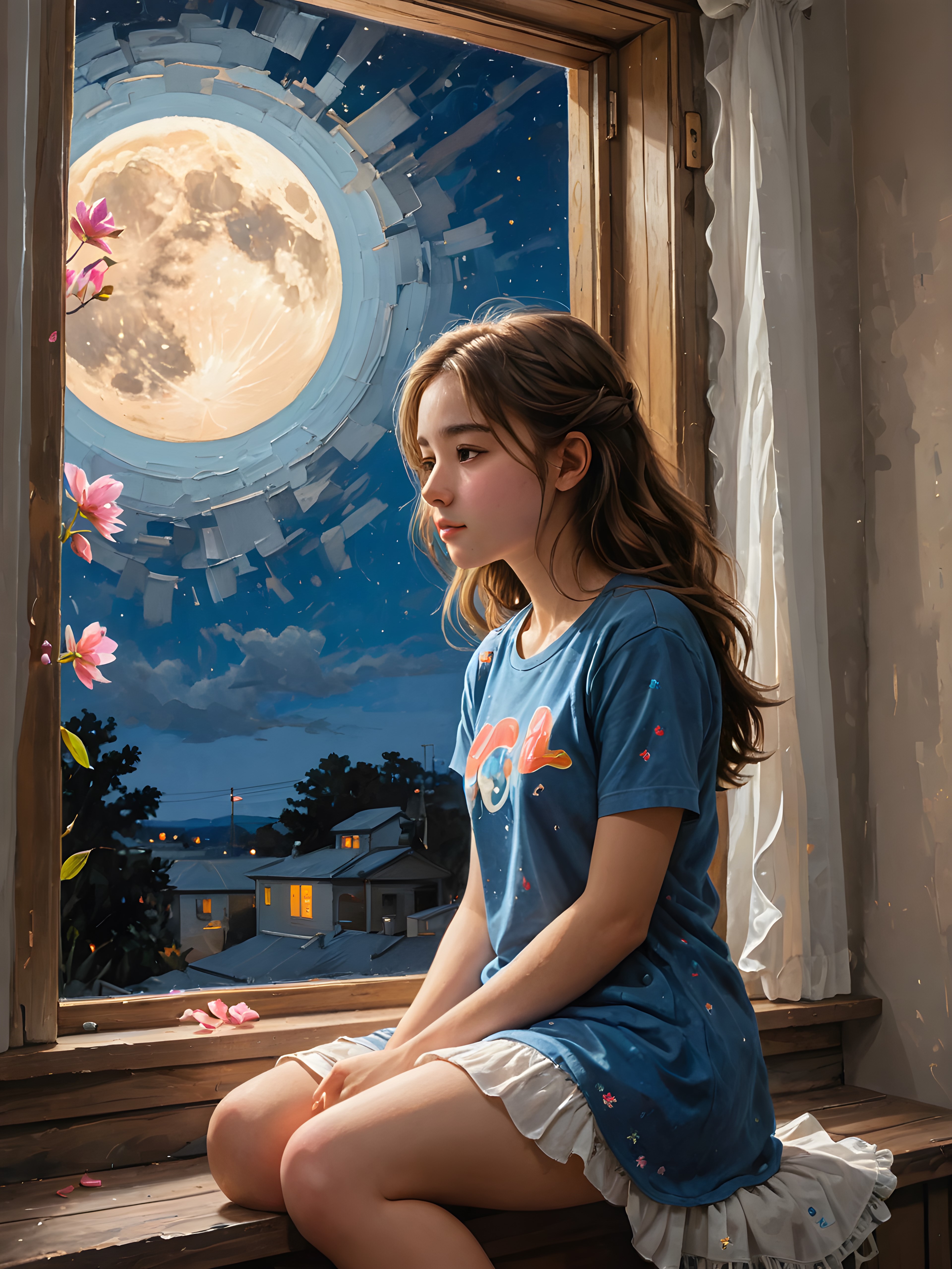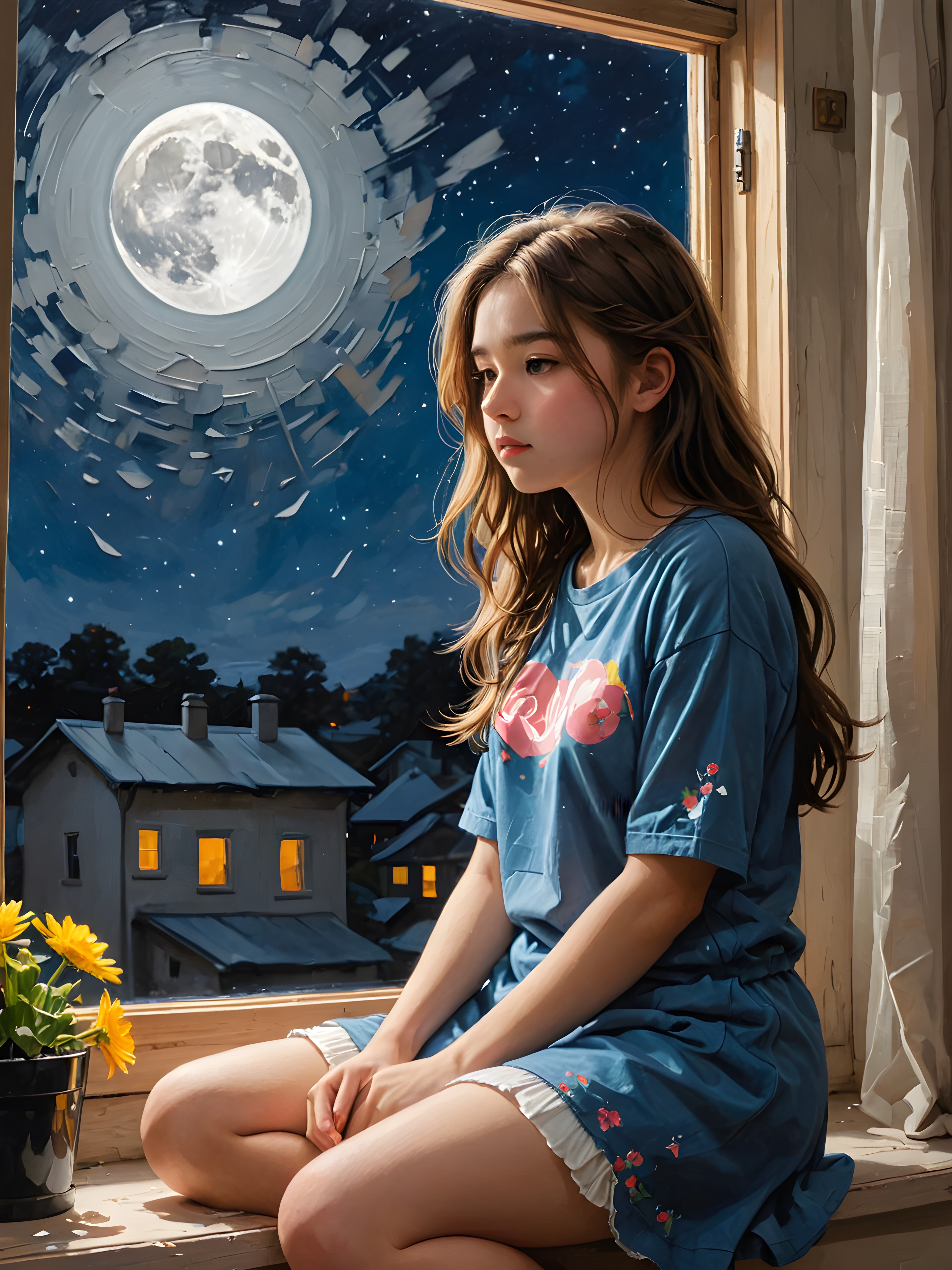 a (((lonely teen girl))) sitting by a window at night, her face silhouetted against the moon’s glow, its petals a poignant reminder of heartbreak, she wears a shot cropped t-shirt
