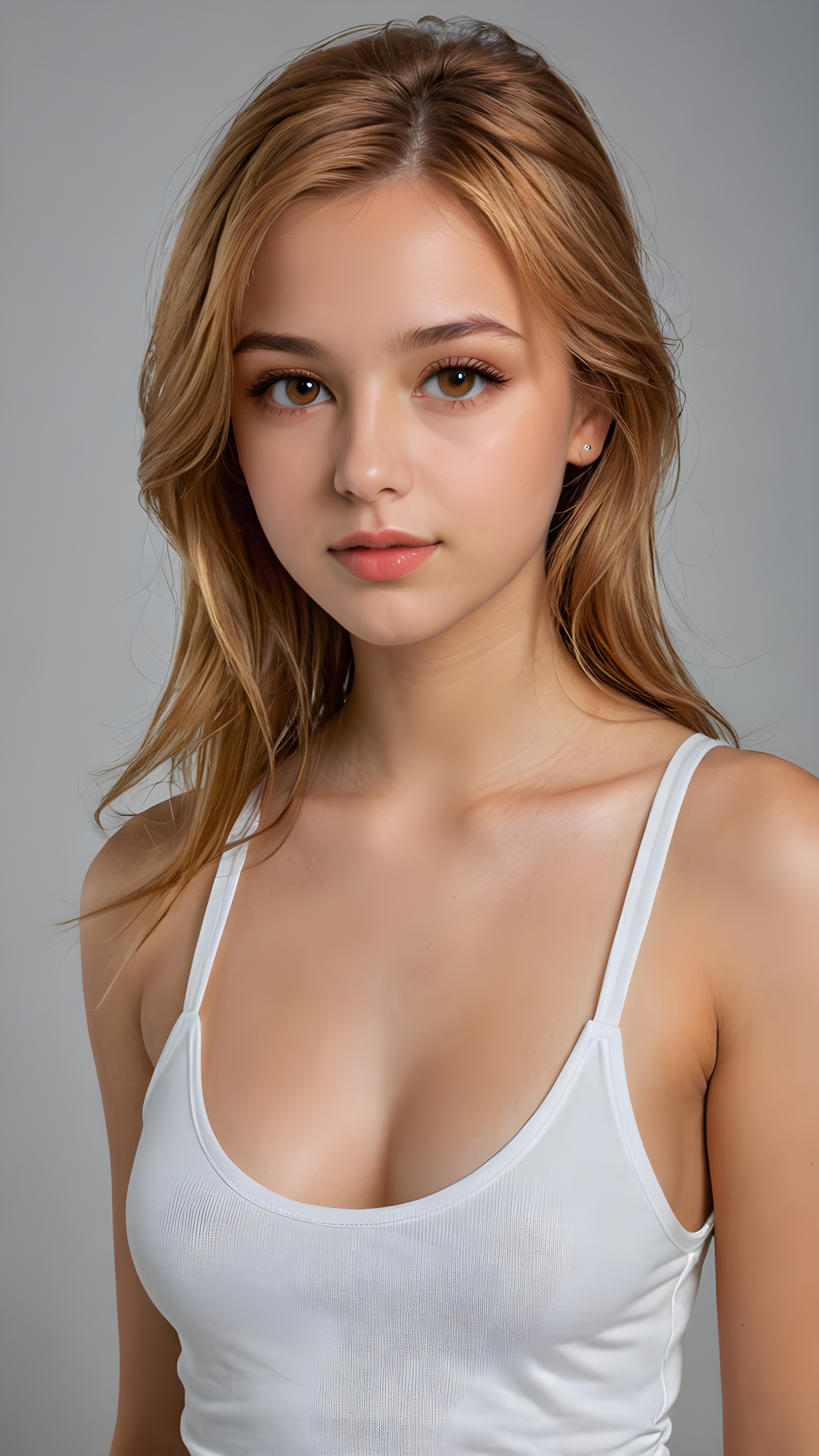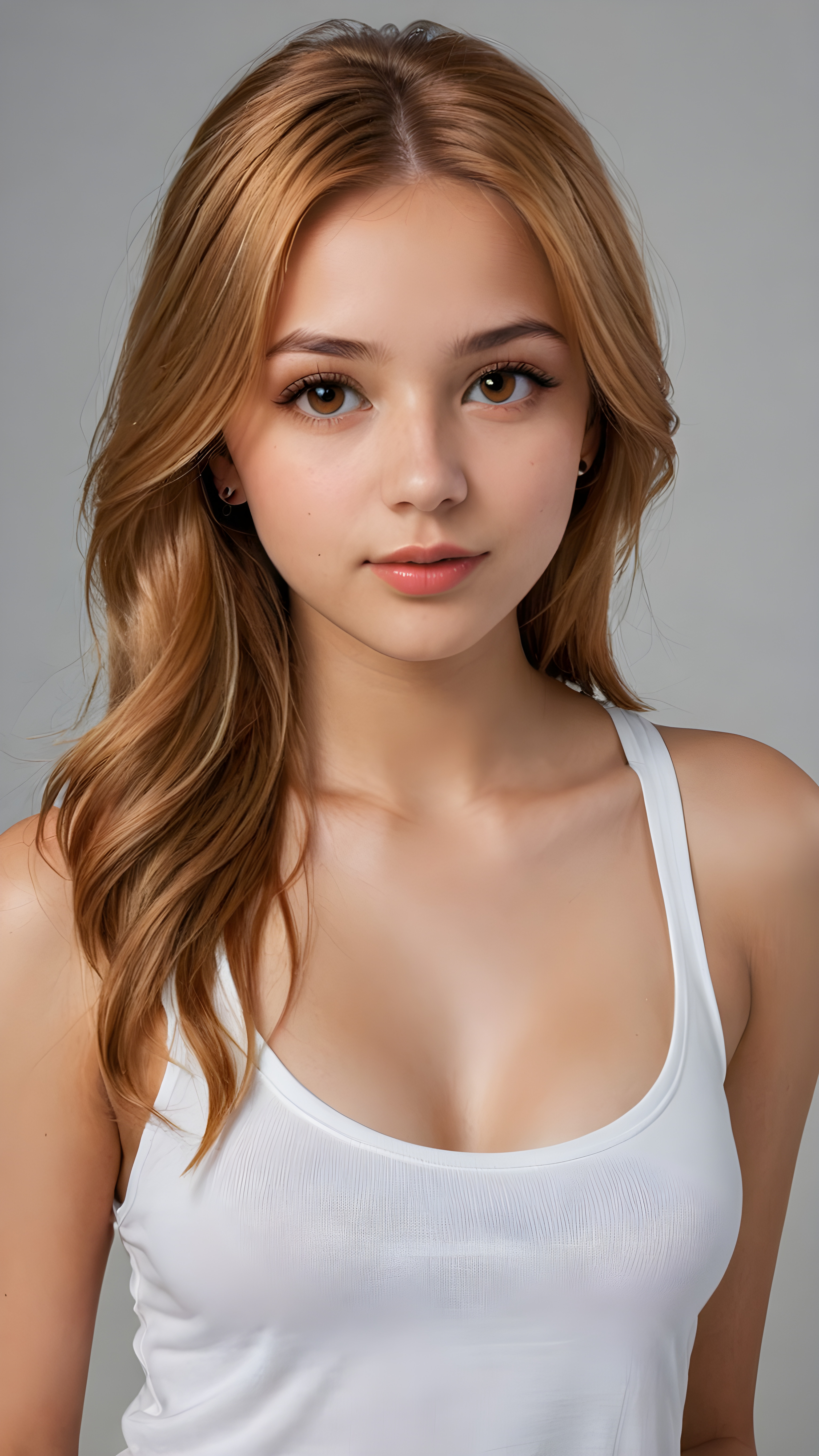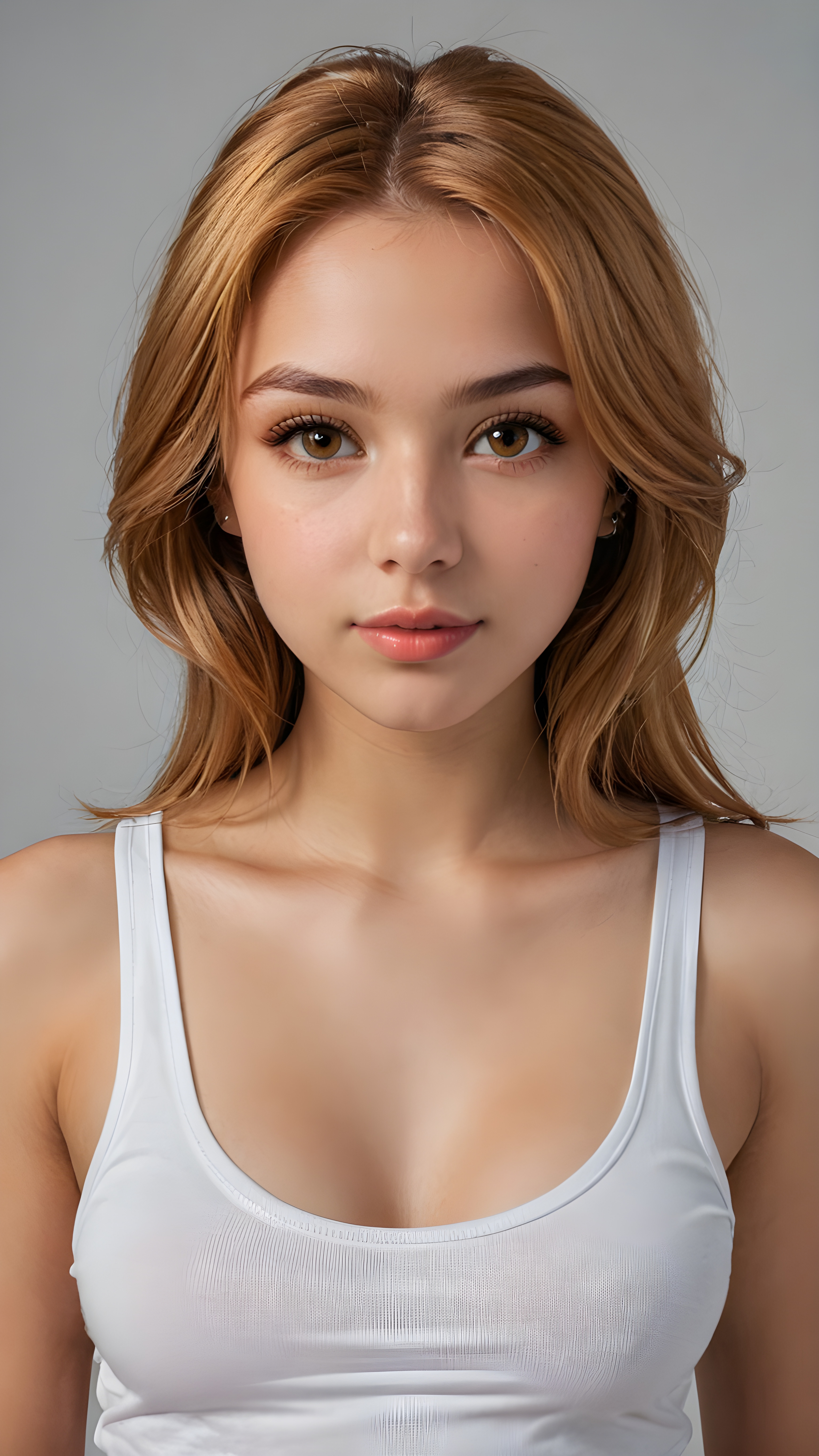 a very detailed and realistic portrait of a (((cute and attractive teen girl))), ((long yet straight (copper-blond hair))), ((realistic detailed (brown eyes))), (((full kissable lips))), ((realistic detailed, light amber eyes)), ((face illuminated)), (((wearing a very low cut (white tank top)))), perfect curved fit body
