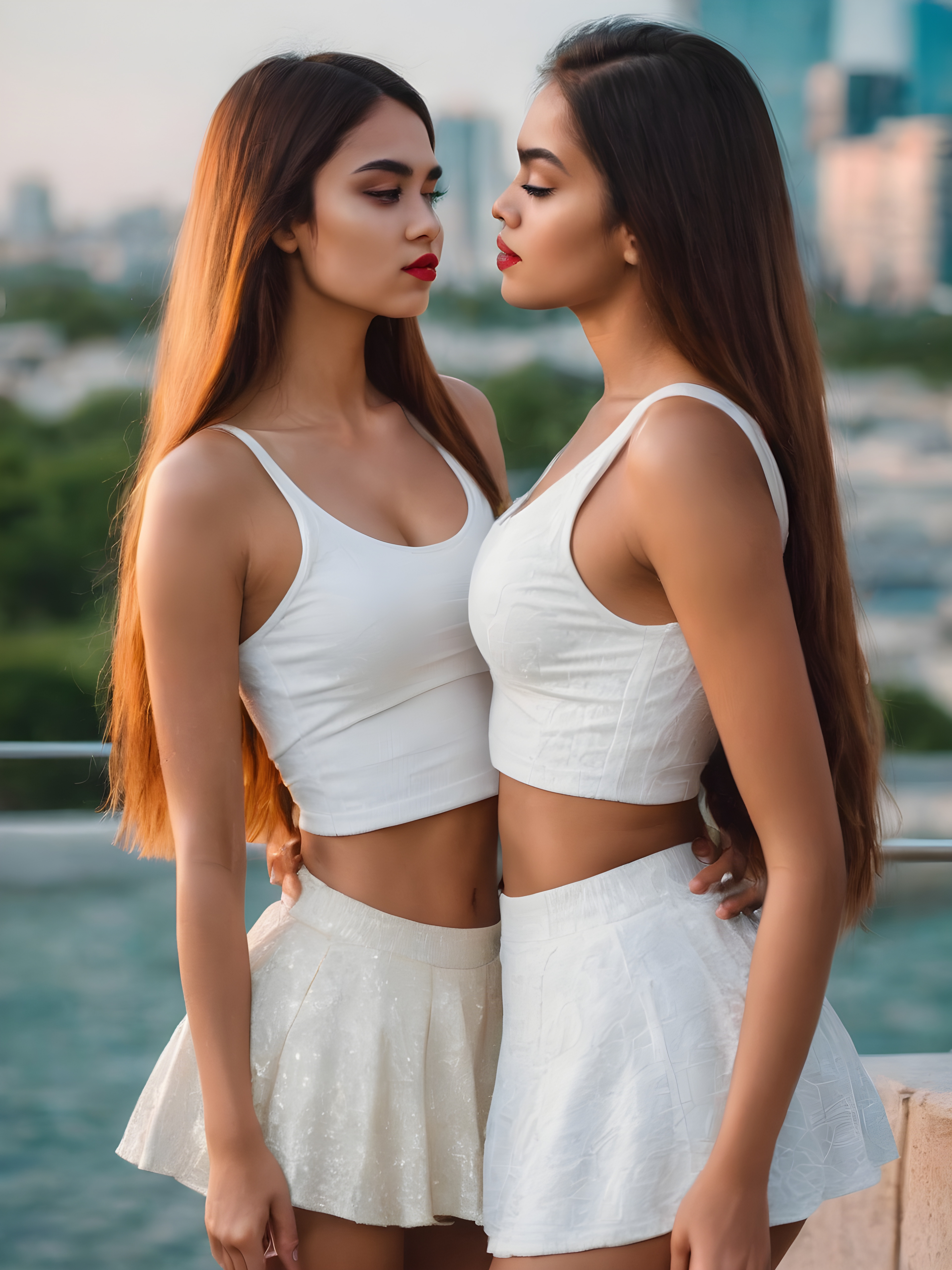 (((cute))) (((gorgeous))) ((female model)) ((stunning)) ((two very pretty young teen girls)), straight hair, perfect realistic body, dressed in a form-fitting low cut white crop top, super short mini skirt, ((about to a passionate kiss))