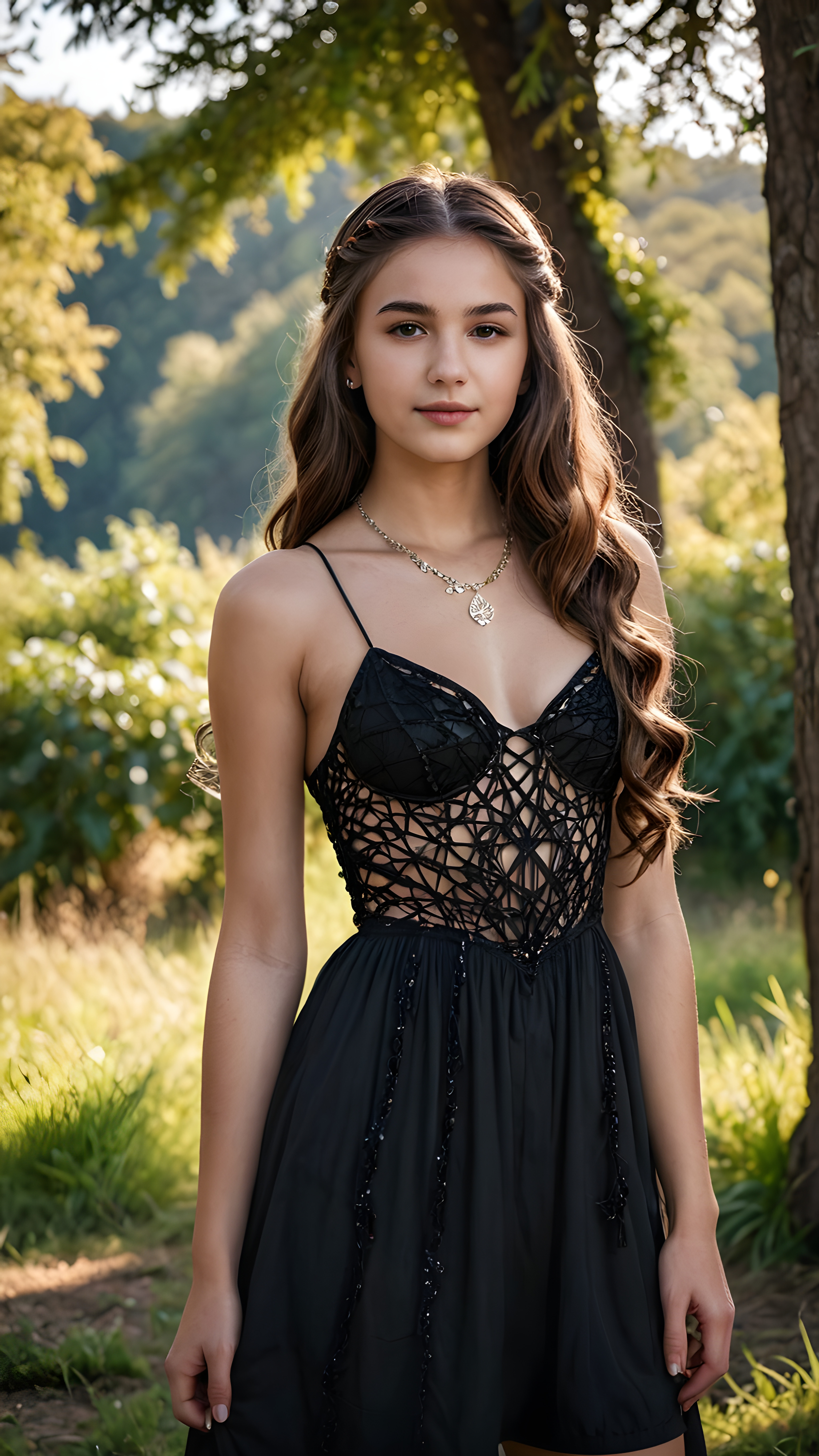 A (((young beautiful young teenage girl))), with long, flowing, voluminous, dark brown hair featuring intricate braids and curls, complemented by full, thick, pouting lips and a seductive smile, (((standing at a mere 161 cm and 40 cm))), weighing 40 kg, dressed in a (((black string art dress))), with shiny, glossy skin and a (((beautiful, delicate, thin necklace))), all set against a backdrop of a (serene, natural landscape)