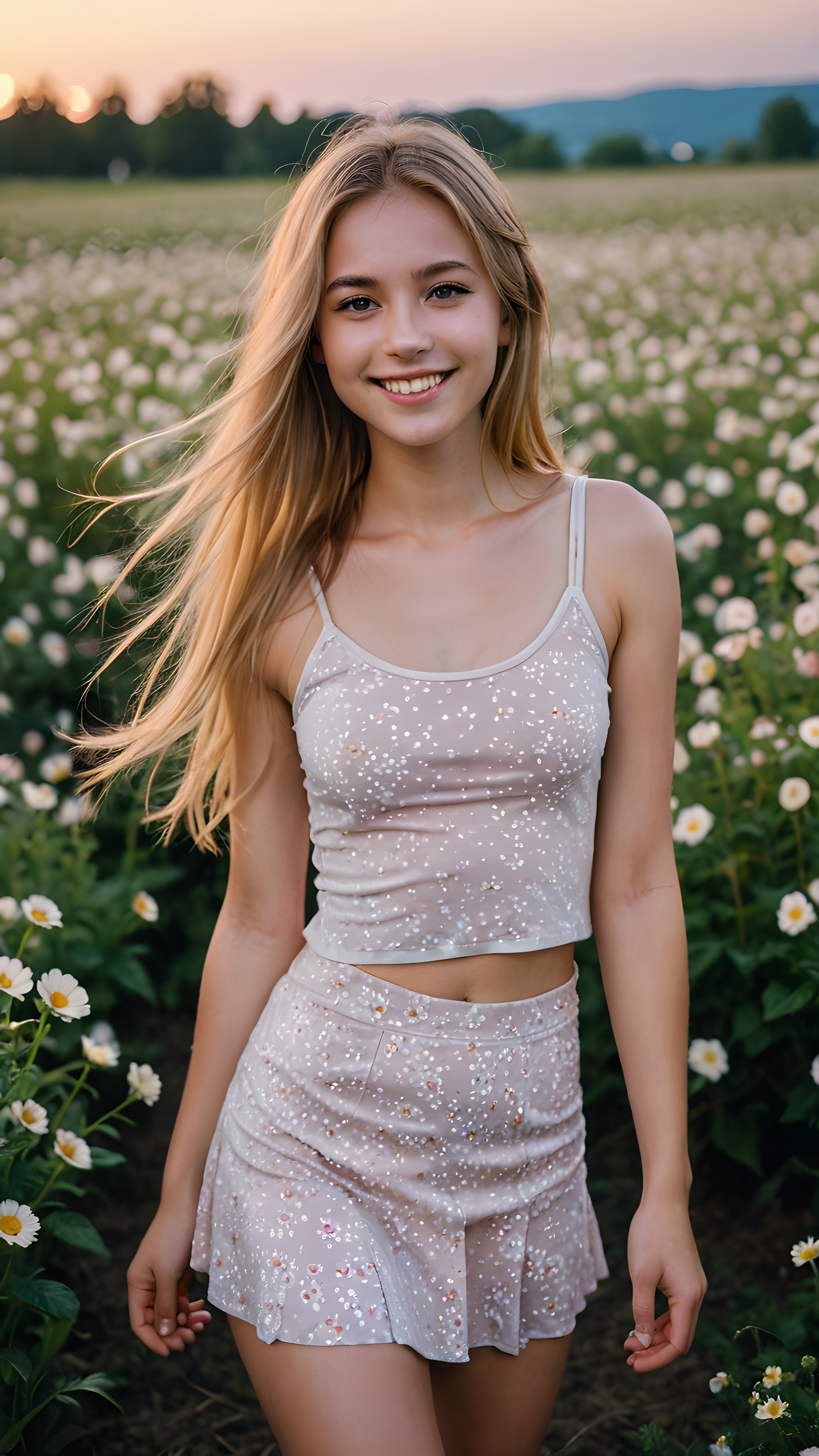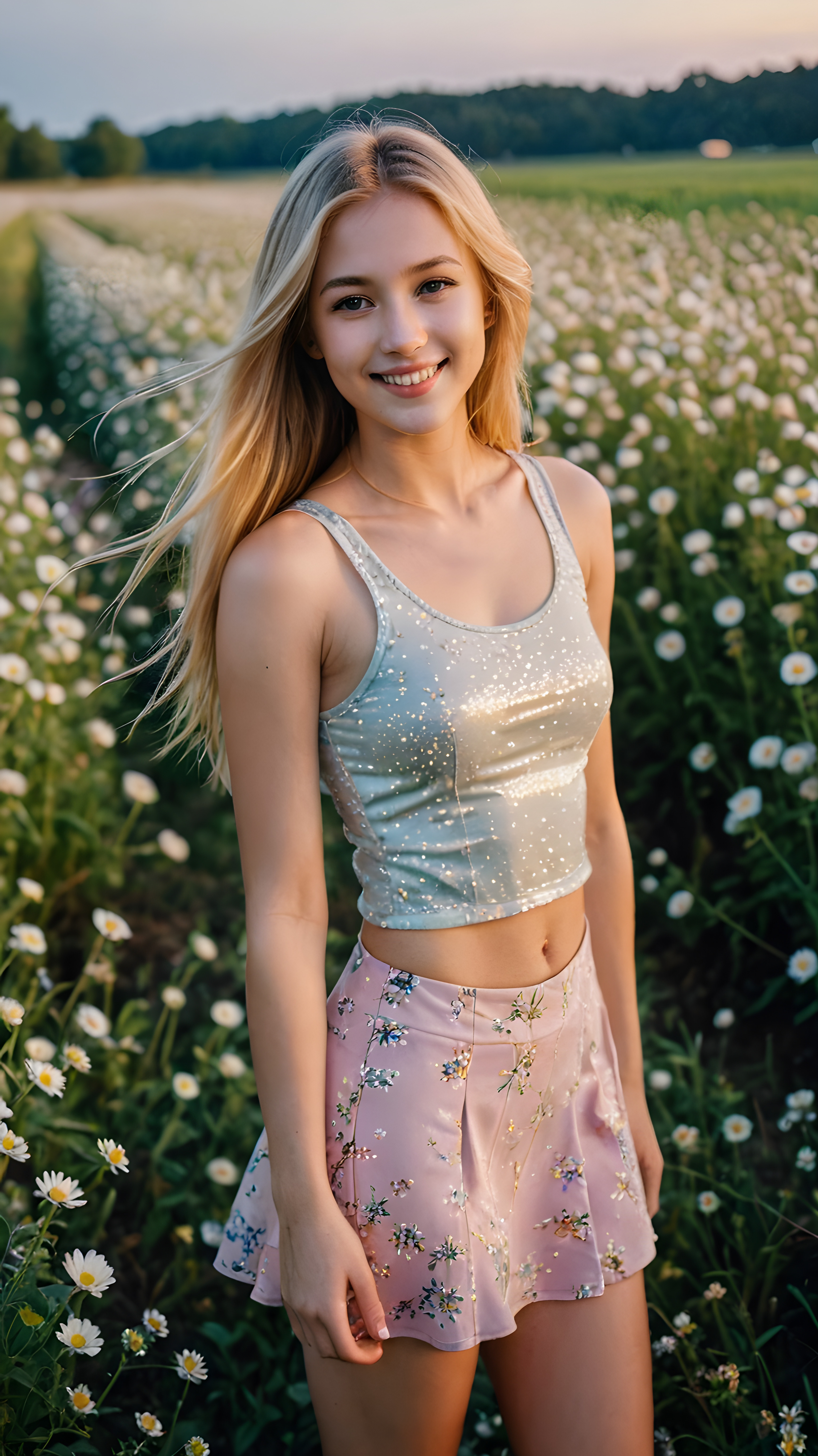 a cute young girl with long flowing straight soft gold hair, wearing a pastel cropped tank top, miniskirt, in a field of flowers. She has a sweet smile on her face, the scene is set at night. The sky is glowing in the moonlight. The image is cute.