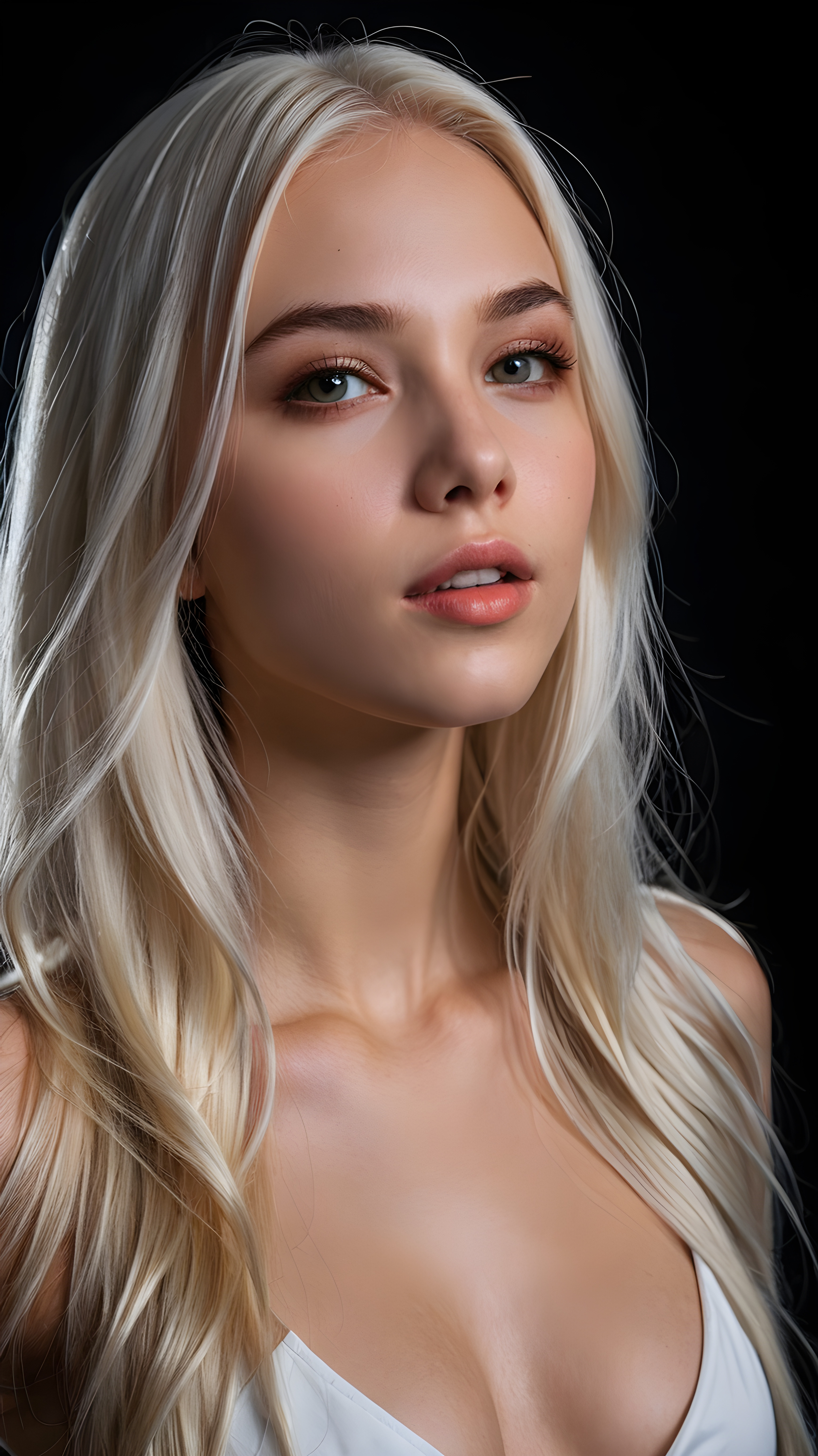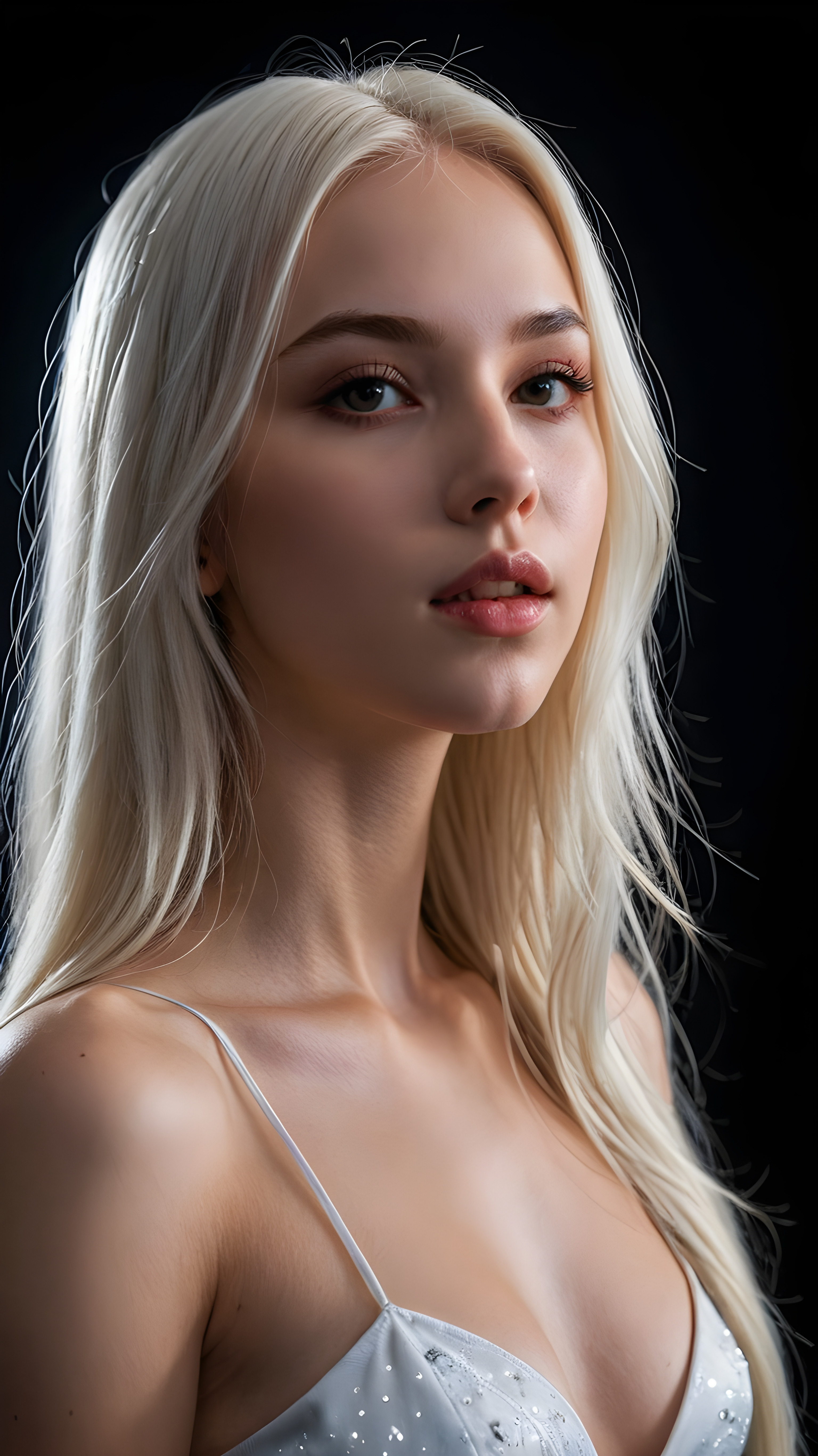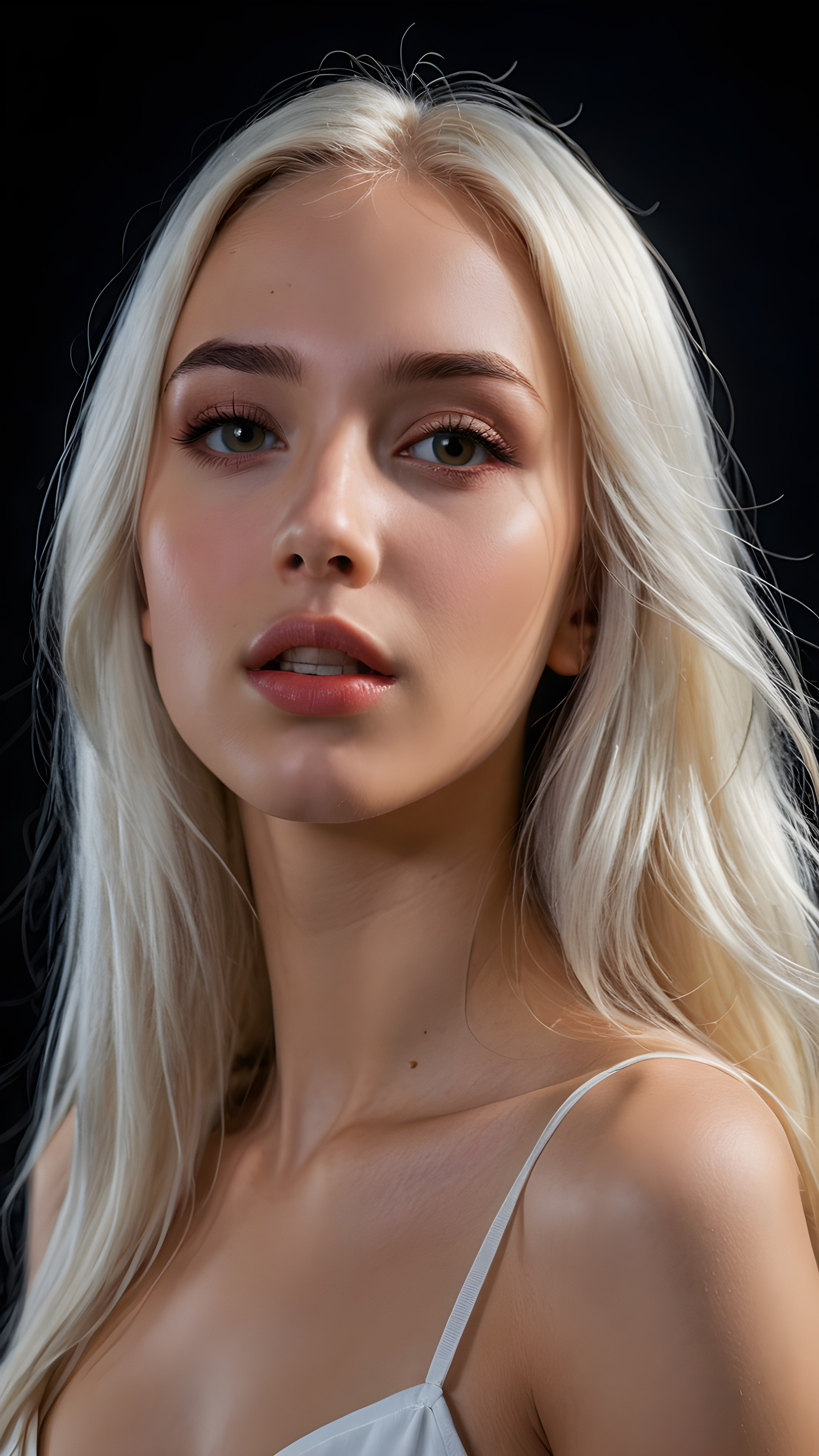 a young beautiful young teenage girl, ((white long straight jet hair)), ((full lips)), (((mouth slightly open))), ((seductive look)), glossy shiny skin, (realistic amber eyes), (((angelic face))), black background, (perfect shadows), (weak light falls into the picture from the side), (perfect curved body), she looks seductively at the viewer, (flawless skin), ((side view)) ((ultra realistic photo)) ((stunning)) ((gorgeous)) ((4k)) ((upper body)) ((the grand sorceress))
