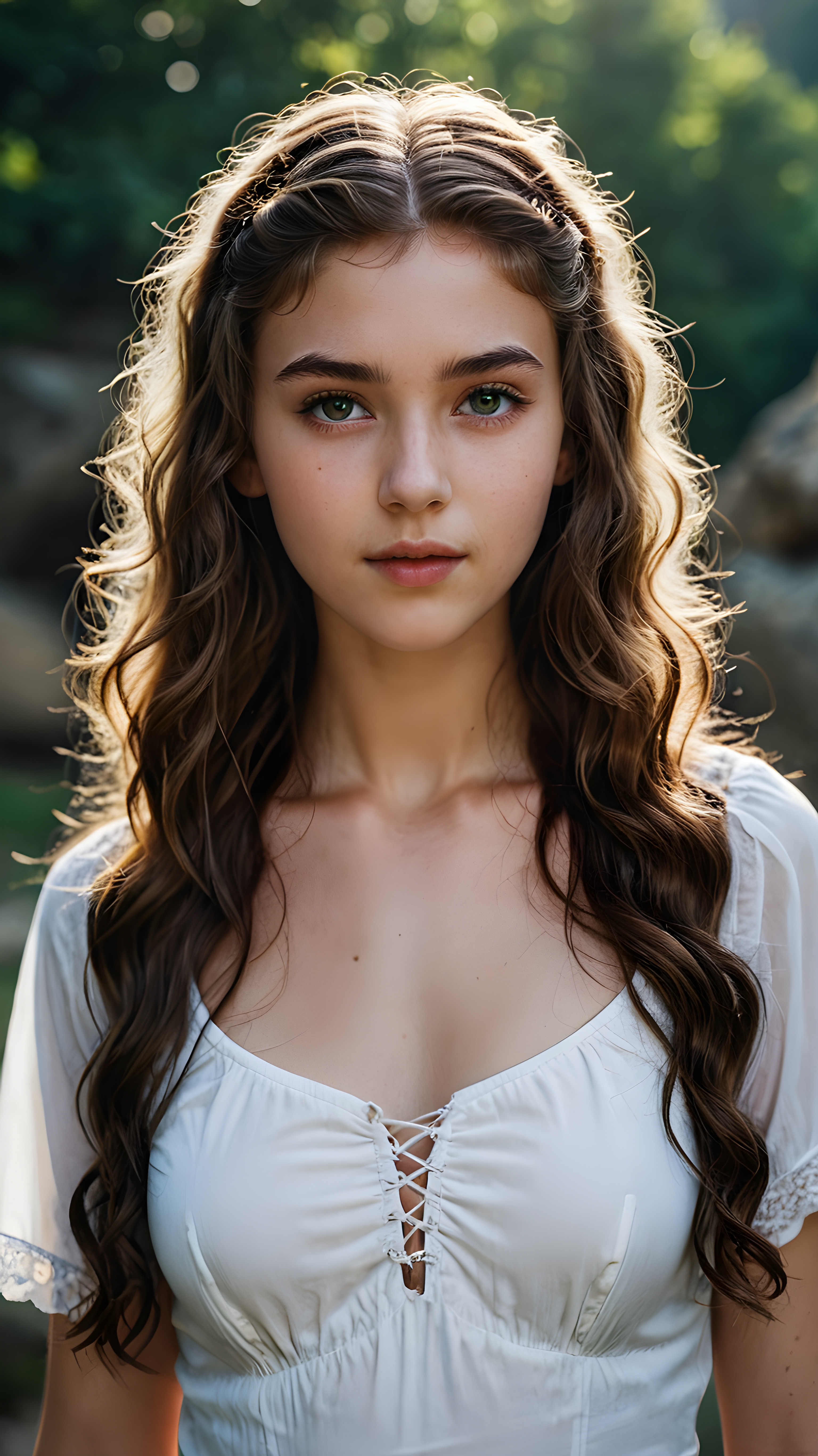 a young teen girl, ((detailed wavy hair)), perfect face, white cropped top, ((the grand sorceress))