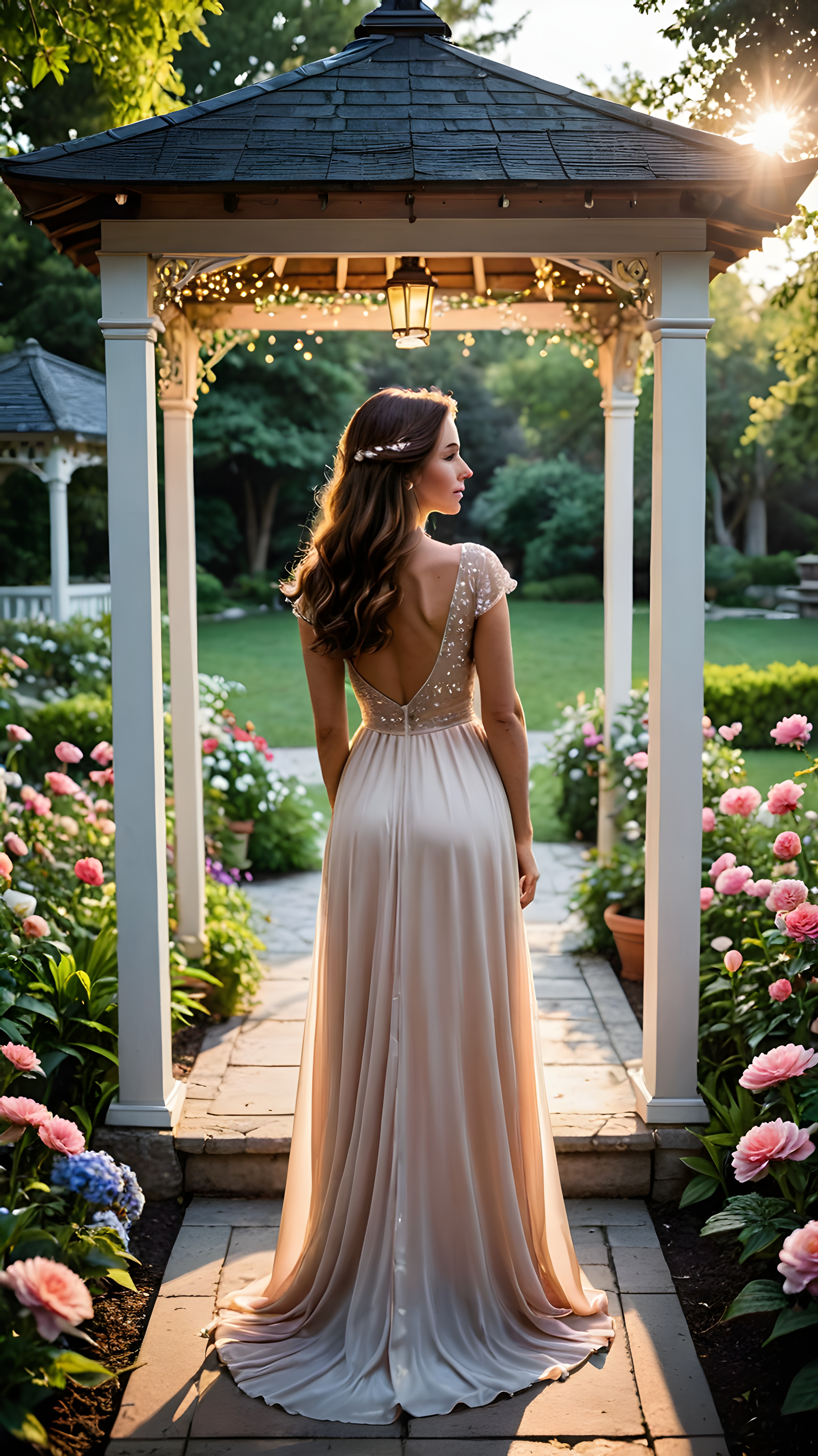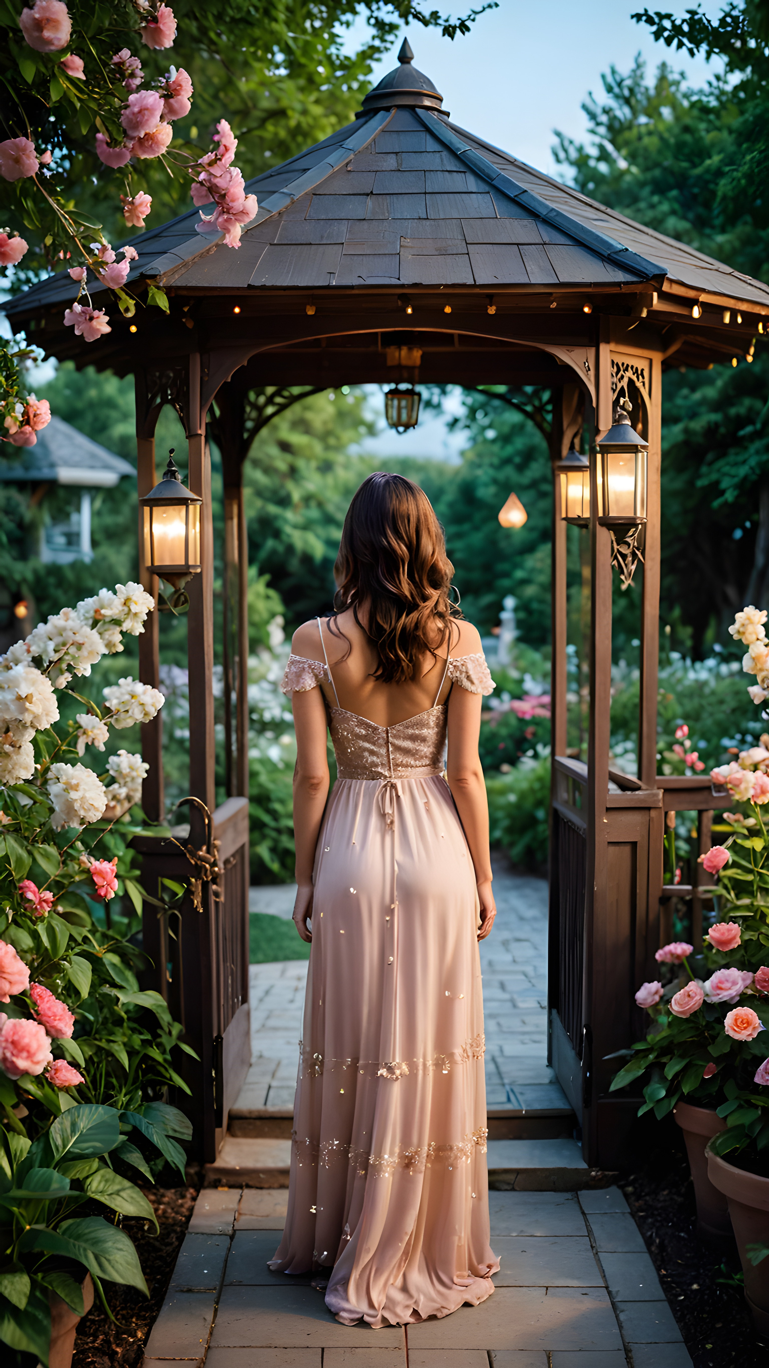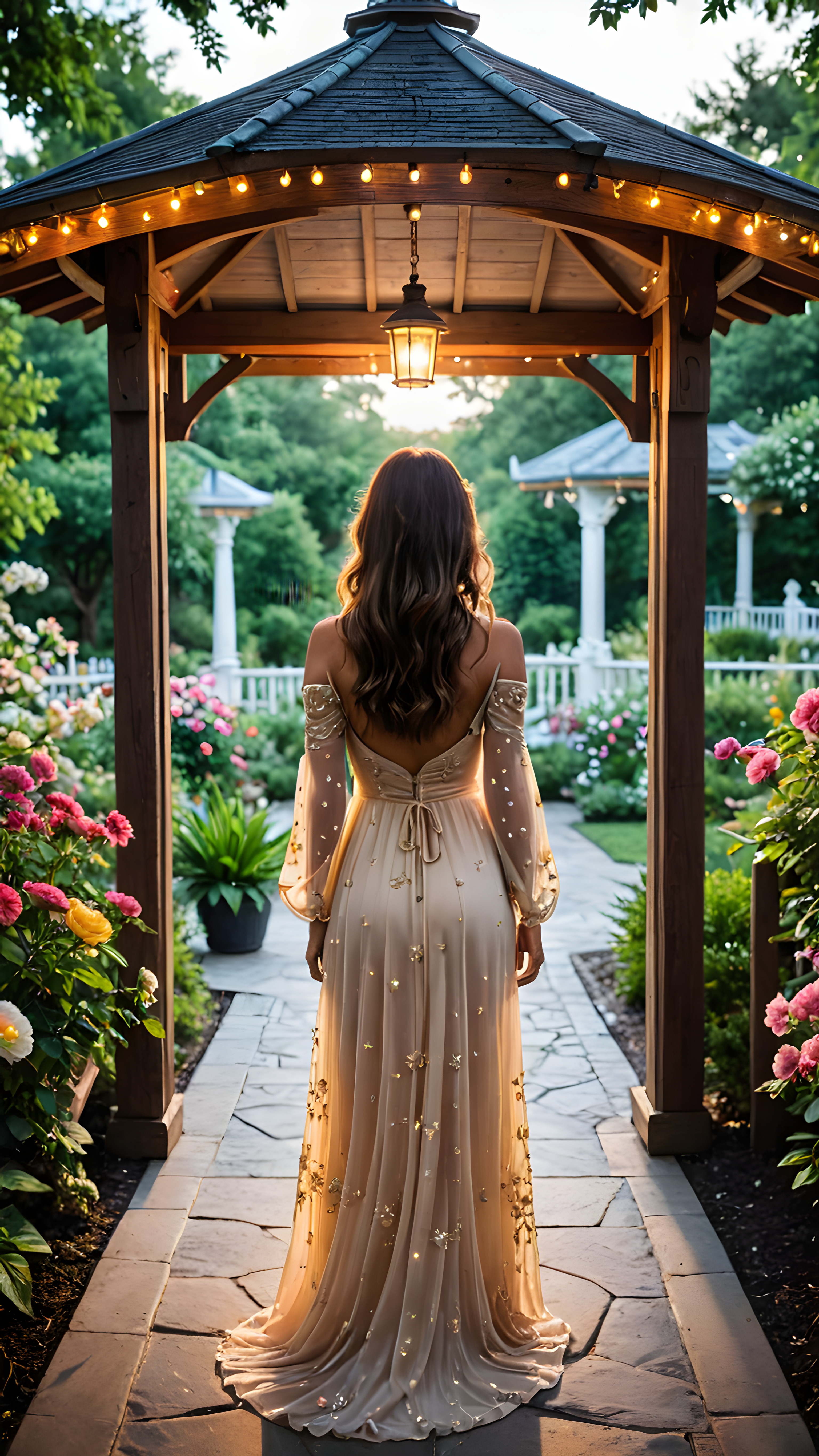 Inside this gazebo sat a dreamy girl with long brown hair and a beautiful, enchanting dress.