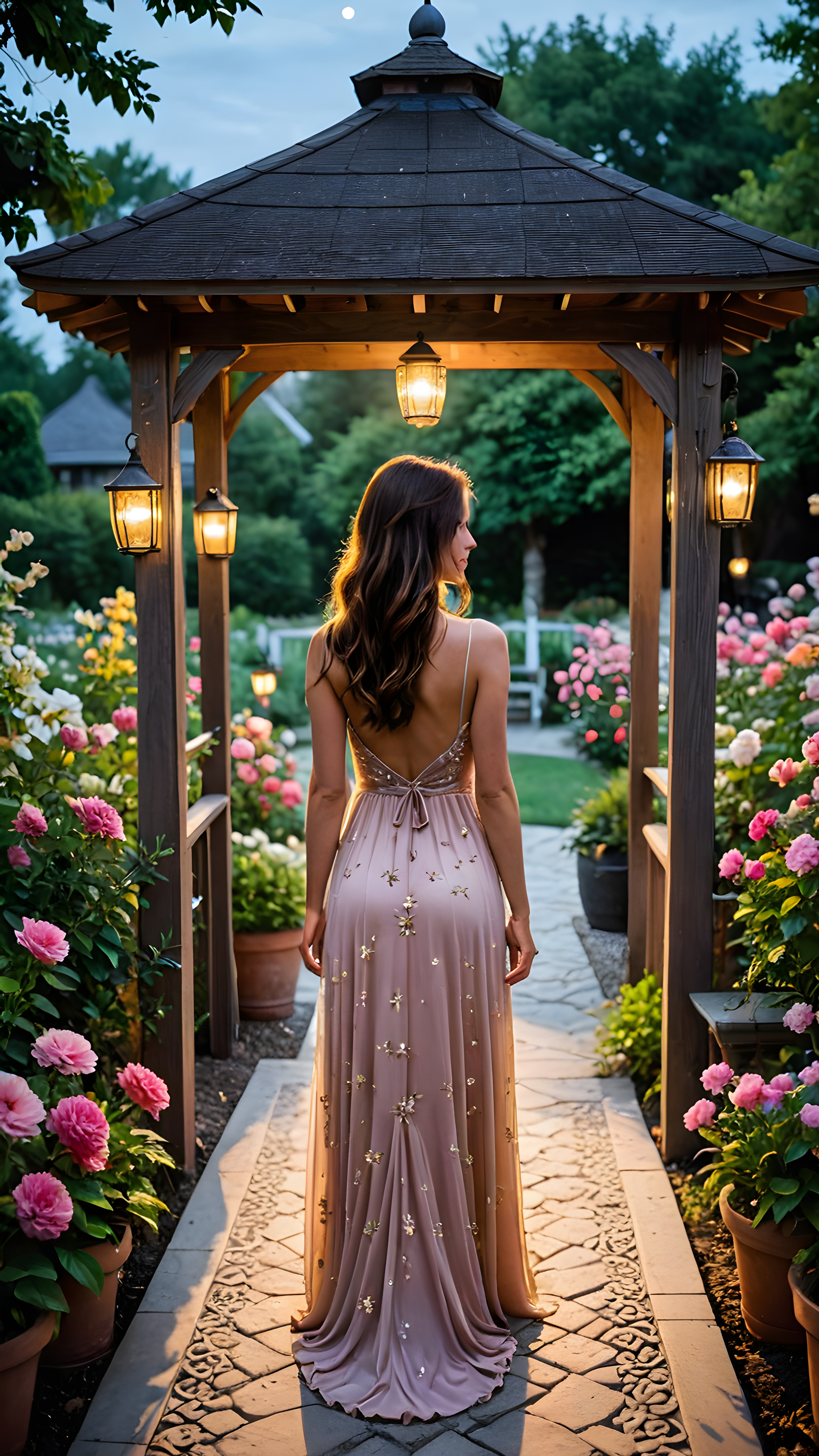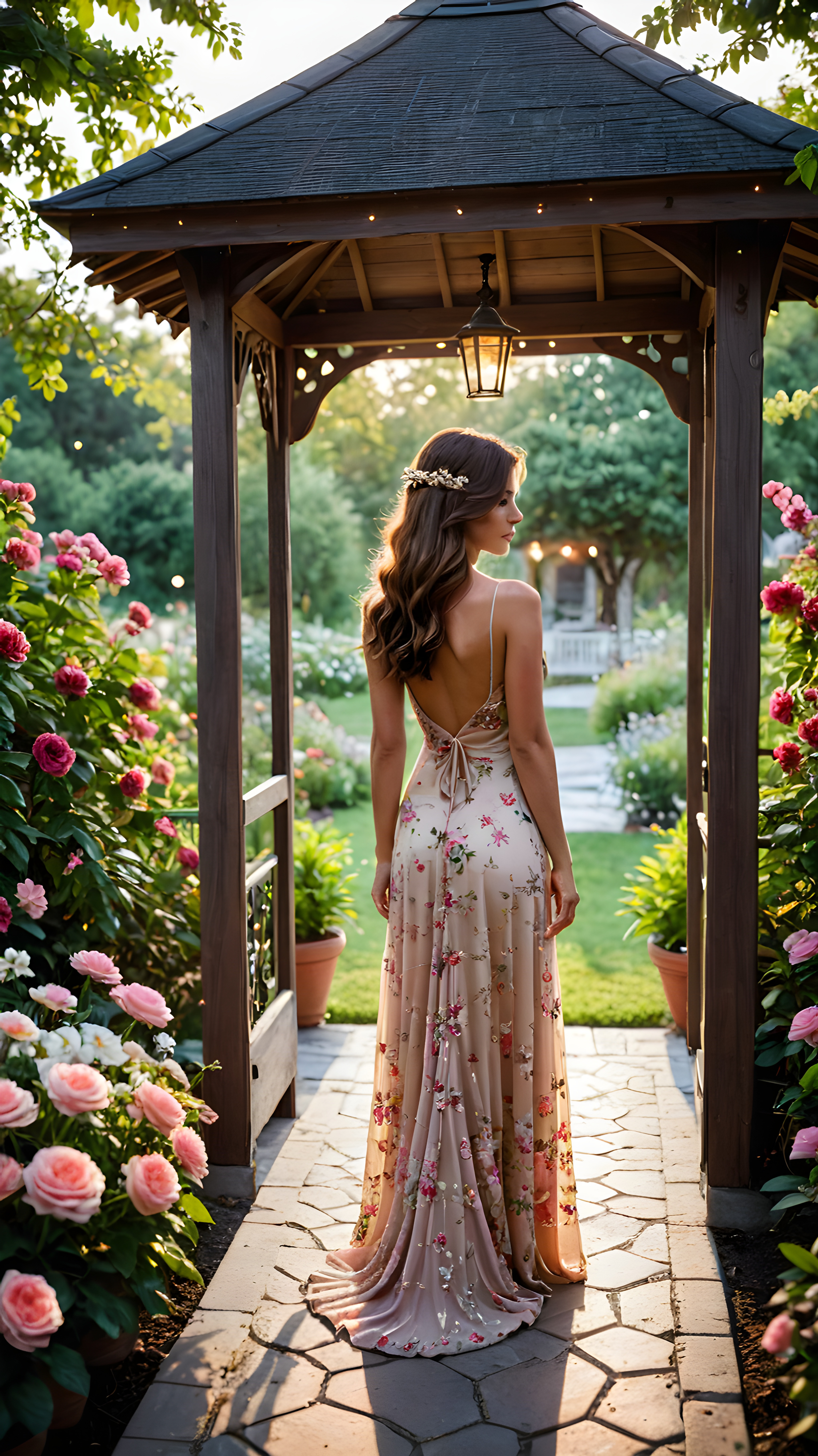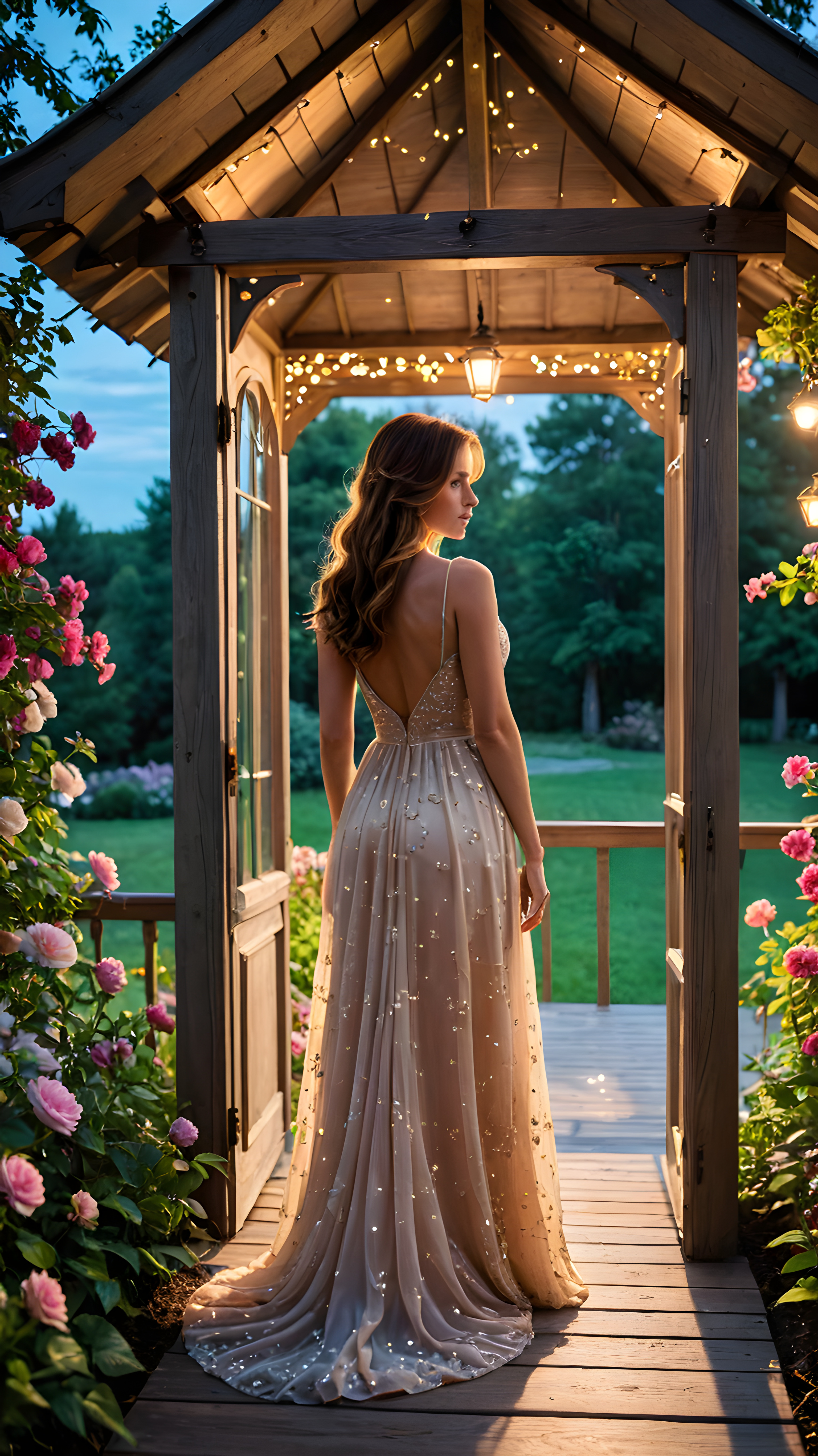 Inside this gazebo sat a dreamy girl with long brown hair and a beautiful, enchanting dress.