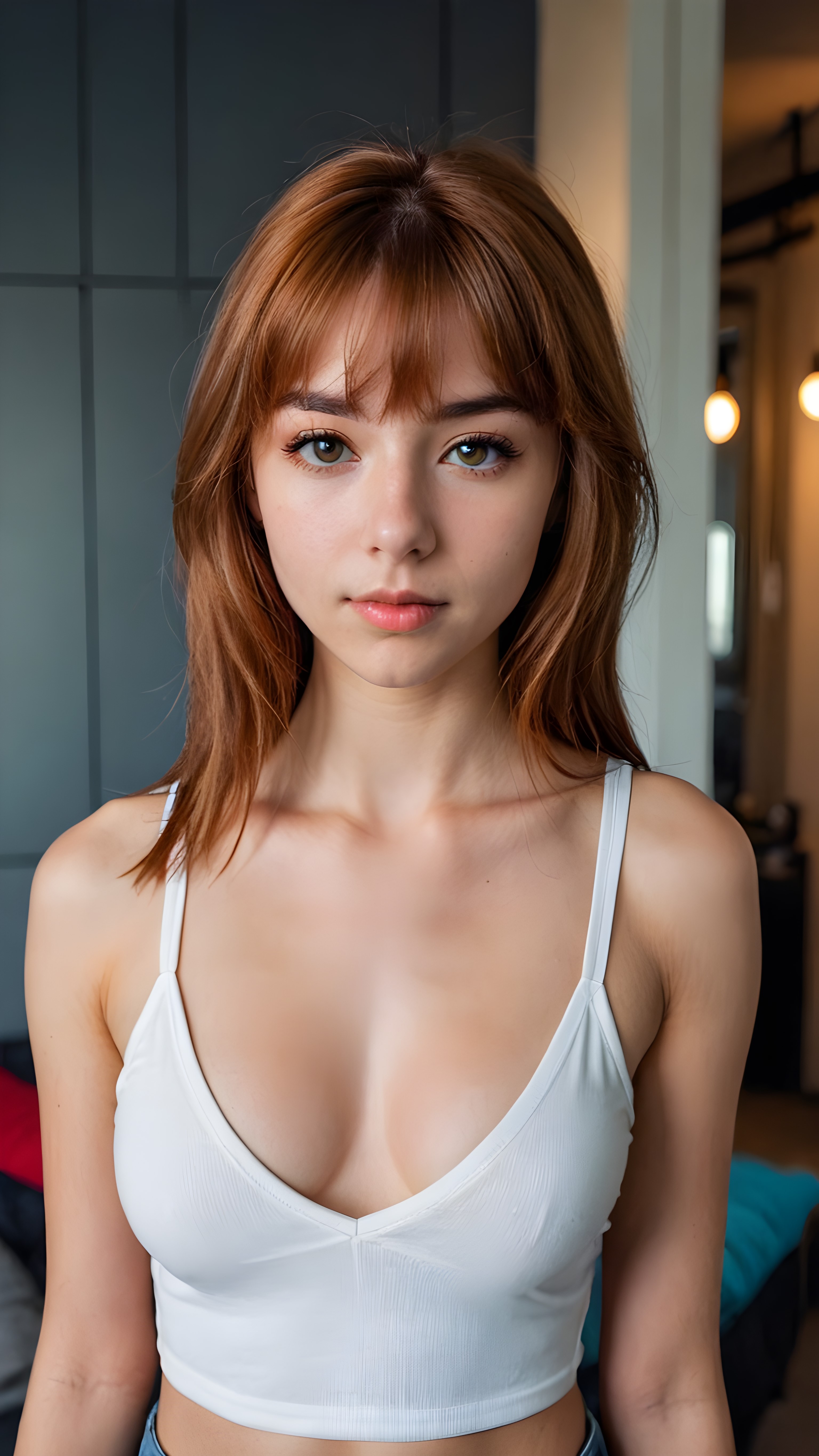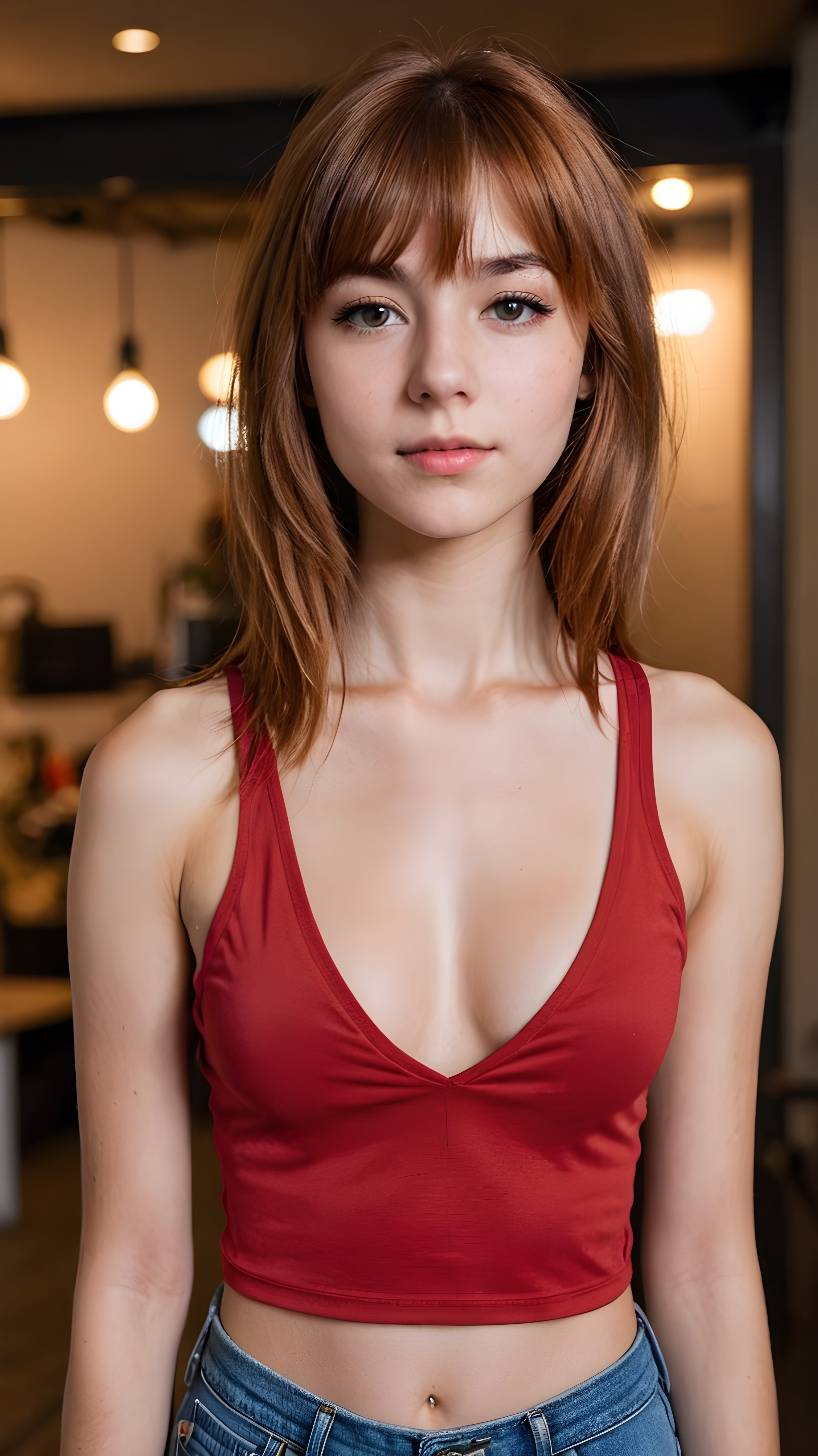 a thoughtful (((young cute and petite teen model girl))) with long soft, red straight hair framing her face, bangs, caught off guard as it cascades down her shoulders and covers her upper body in a in a plunge neck (((cropped low cut tank top, deep v-neck))), expressing a mix of bashfulness and embarrassment, perfect curved body
