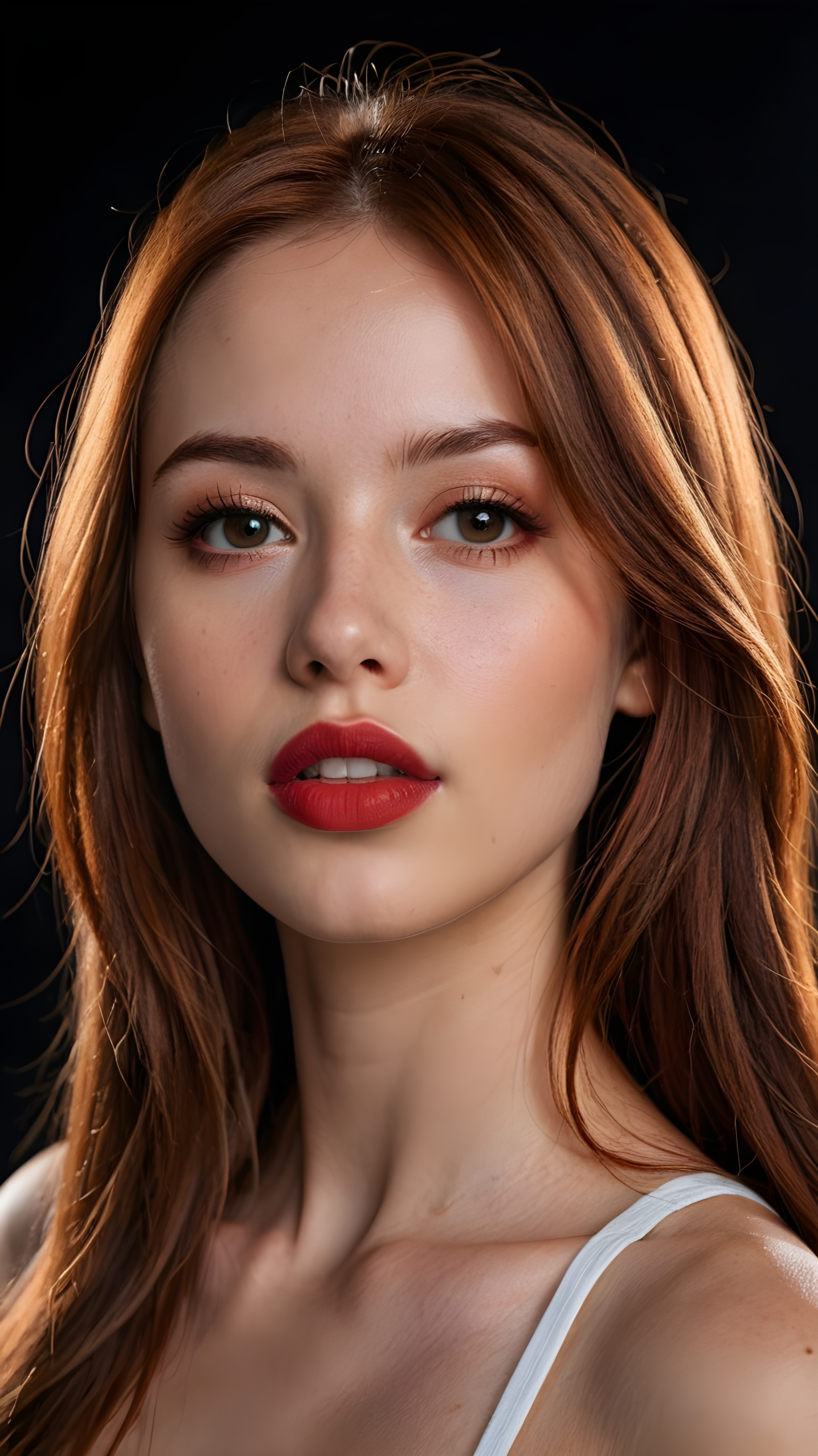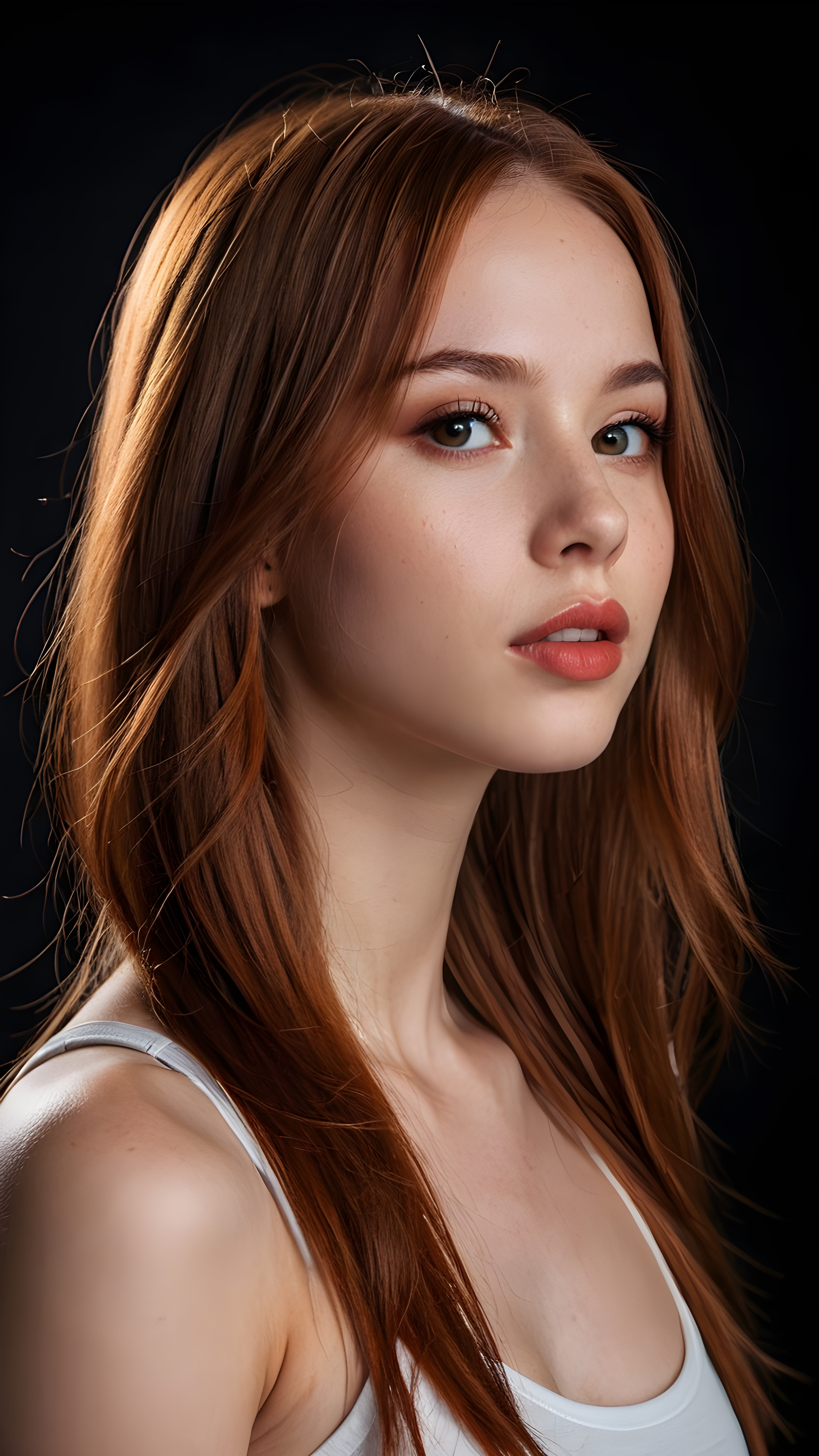 a young beautiful and cute petite girl, wears a white cropped tank top, ((amber-red long straight jet hair)), ((full lips)), (((mouth slightly open))), ((seductive look)), glossy shiny skin, (realistic amber eyes), (((angelic round face))), black background, (perfect shadows), (weak light falls into the picture from the side), (perfect curved body), she looks seductively at the viewer, (flawless skin), ((side view)) ((ultra realistic photo)) ((stunning)) ((gorgeous)) ((full body))