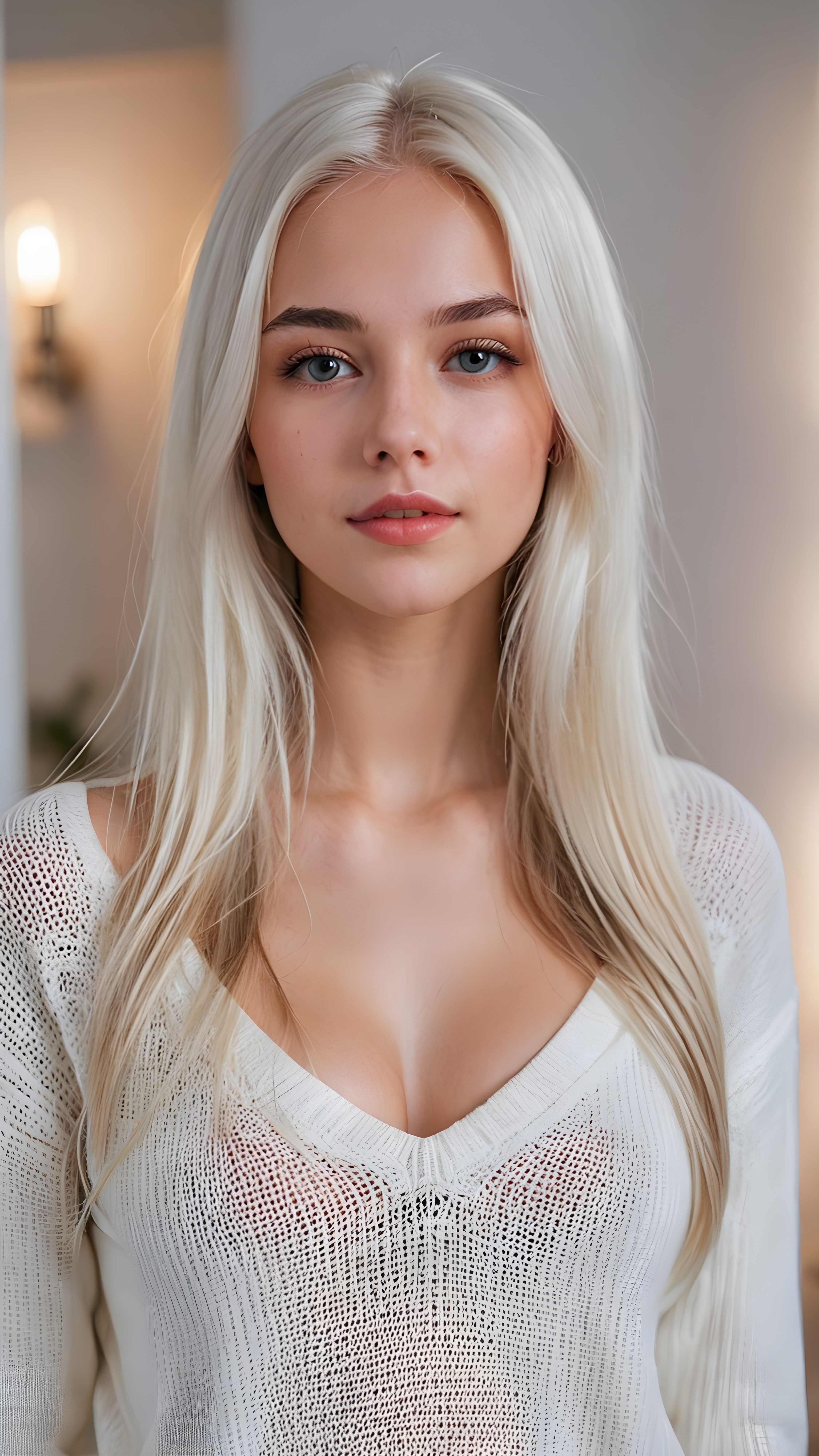 show me a super realistic, detailed portrait, a beautiful young well busty petite teen girl, perfect body, ((with long soft platinum white straight hair)), and ((full lips)), looks sweetly into the camera, she wears a thin crop ((white sweater with deep v-neck)) against ((light background))