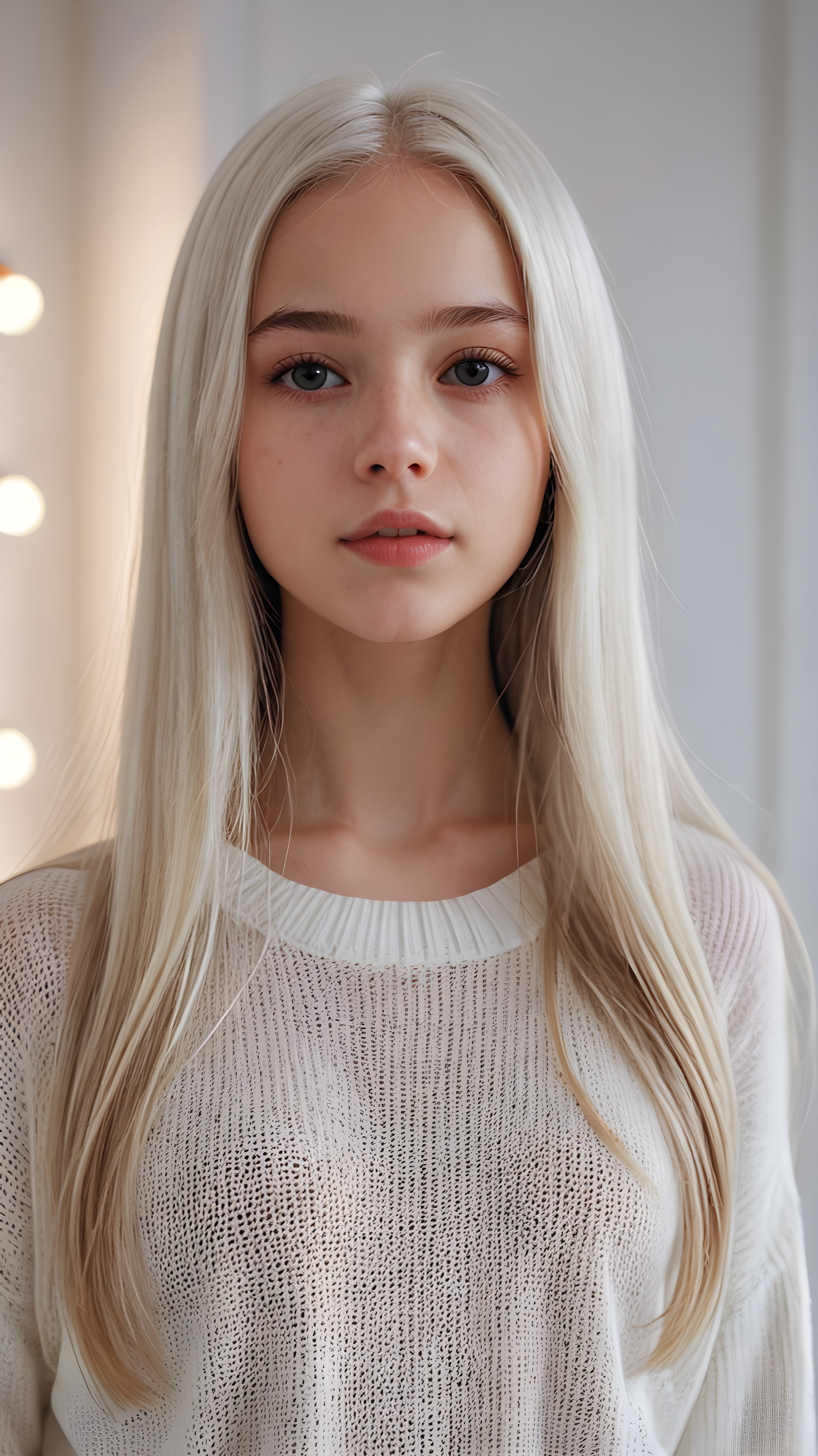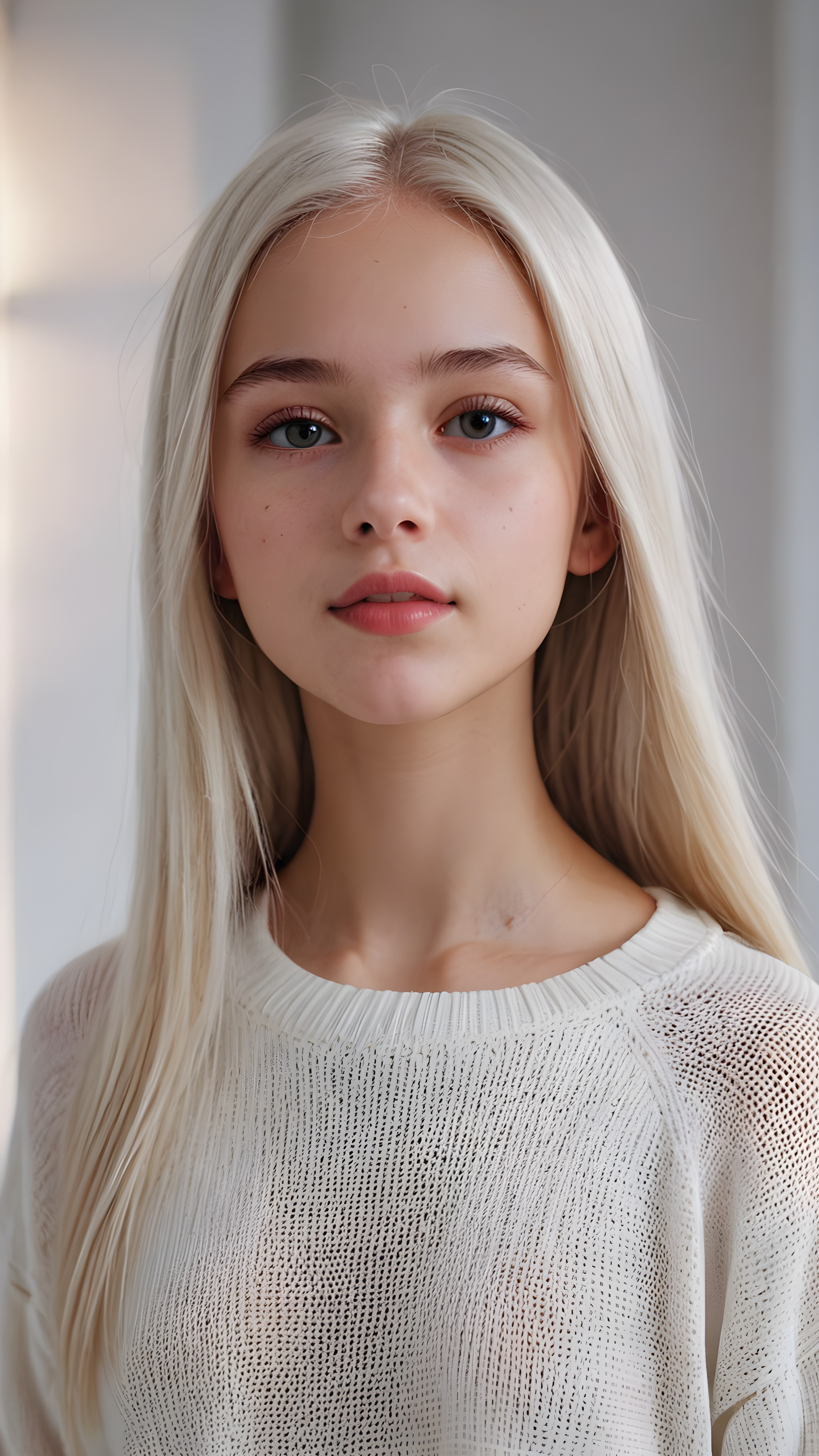super realistic, detailed portrait, a beautiful young petite teen girl, 14 years old, perfect body, ((with long soft white straight hair)), and ((full lips)), looks sweetly into the camera, she wears a thin crop ((white sweater)) against ((light background))