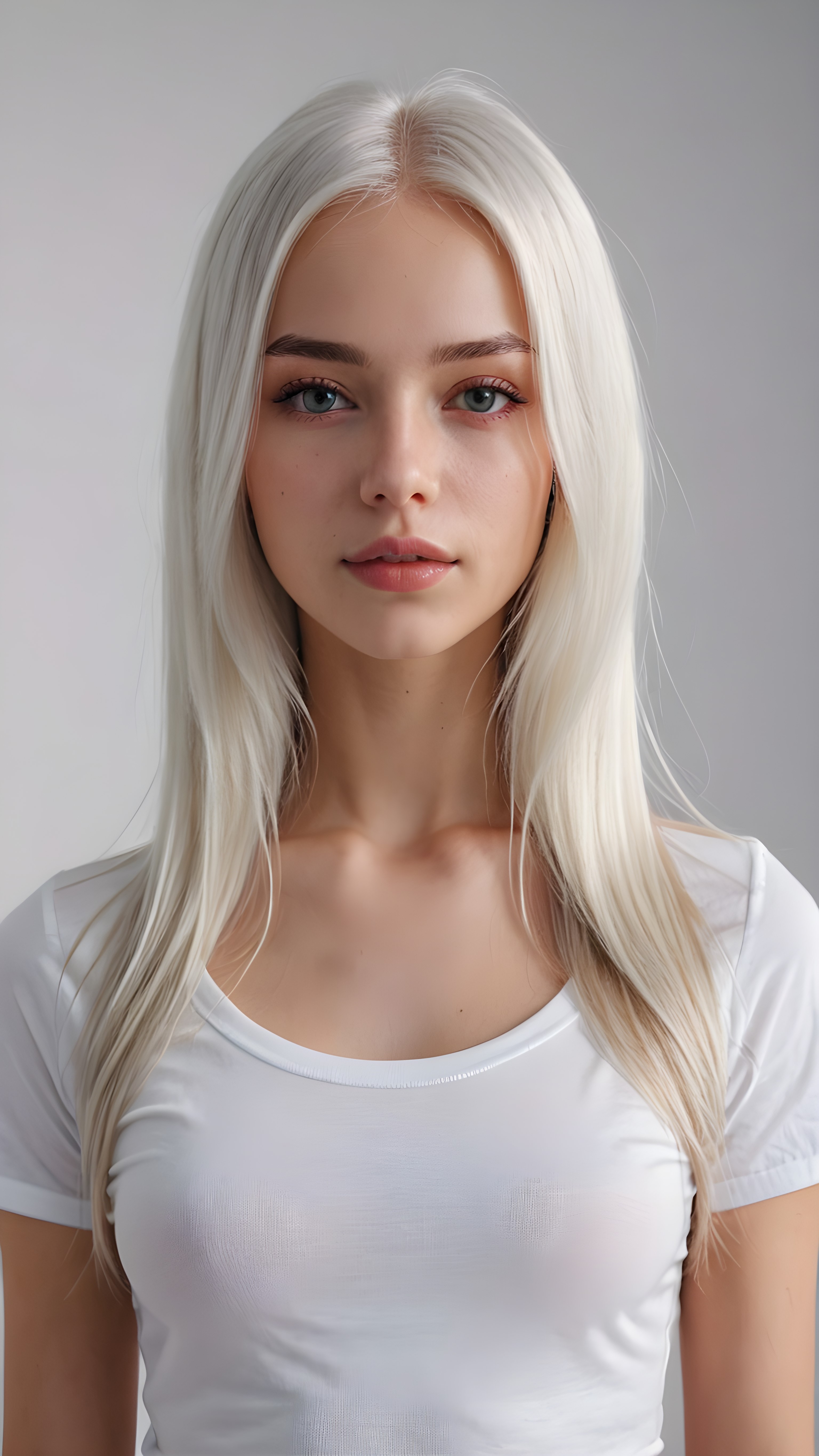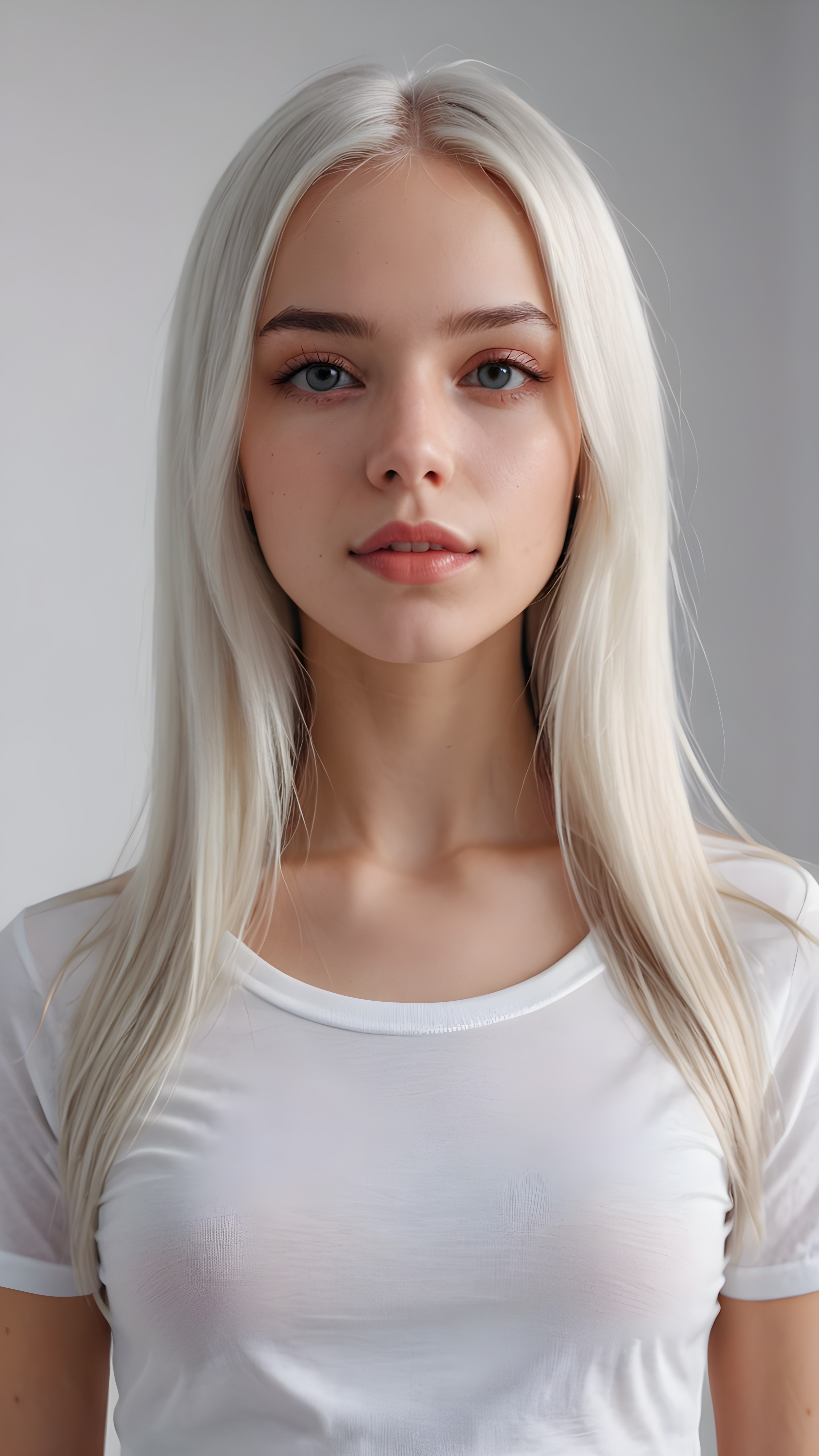 super realistic, detailed upper-body portrait, a beautiful young and petite girl, perfect body, ((with long soft platinum white straight hair)), and ((full lips)), looks sweetly into the camera, she wears a thin ((white crop t-shirt)) against ((light background))
