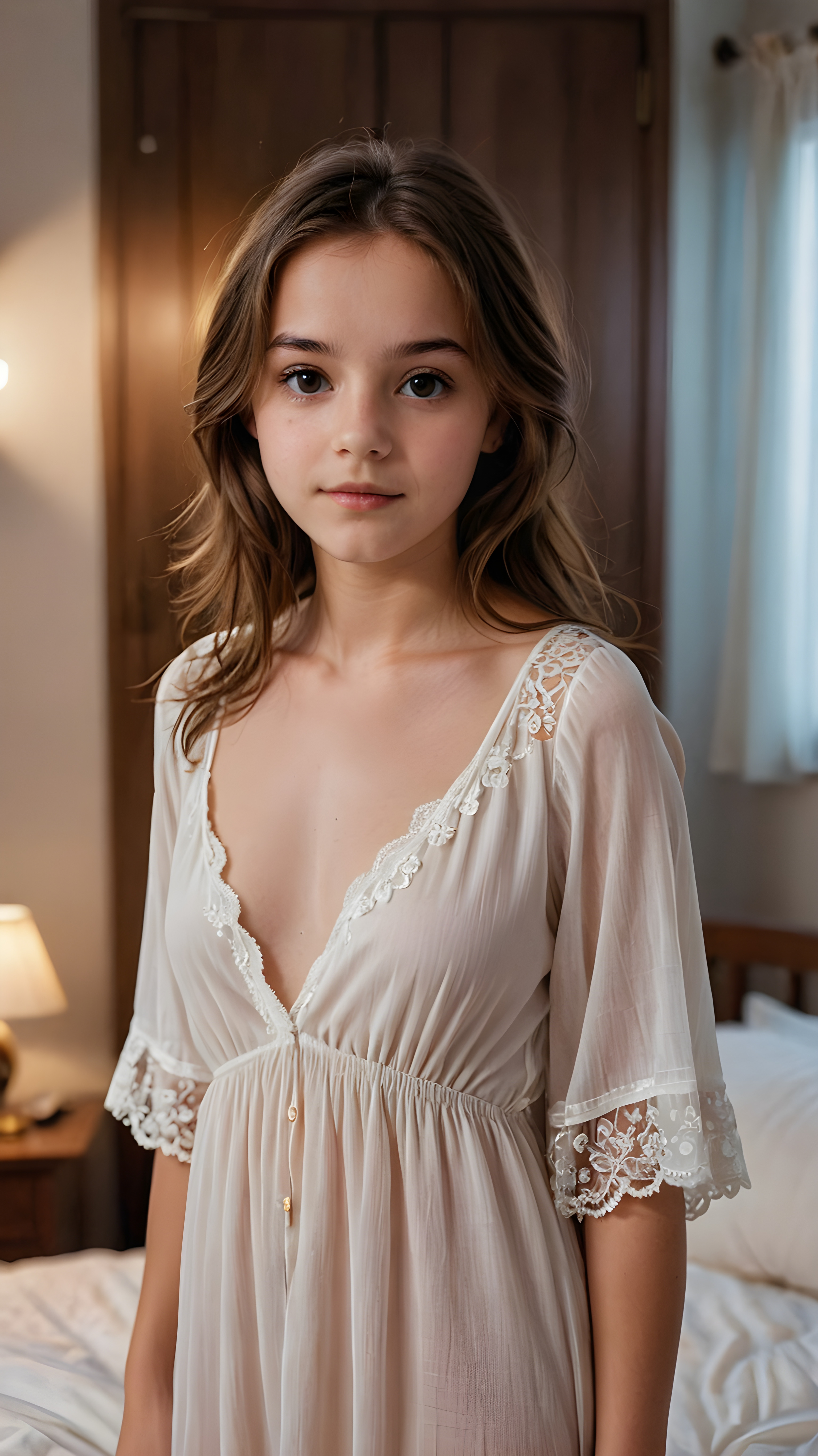 a cute young teenage girl, detailed brown hair, (viewed from front), perfect anatomy, wear only a thin nightgown