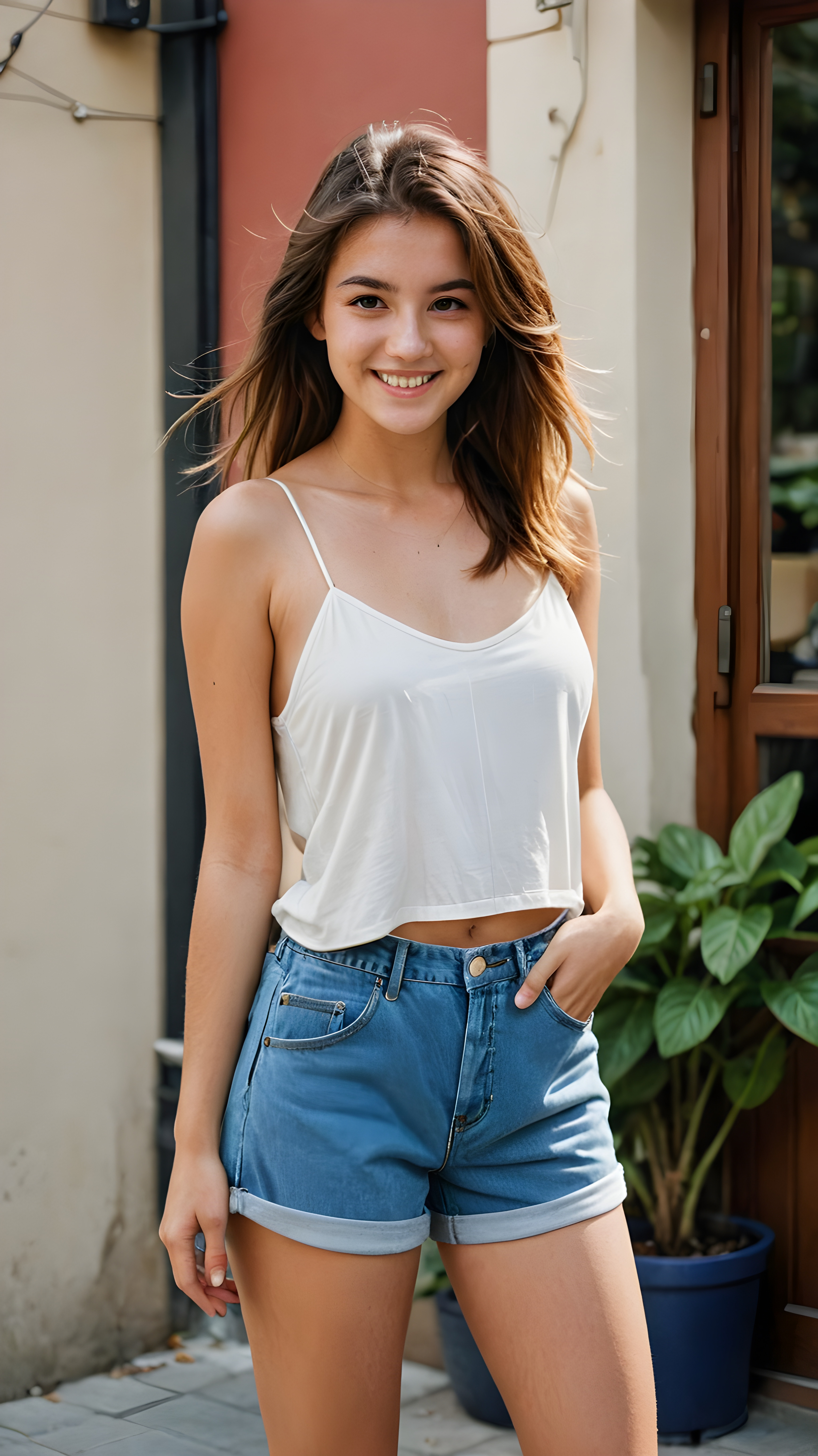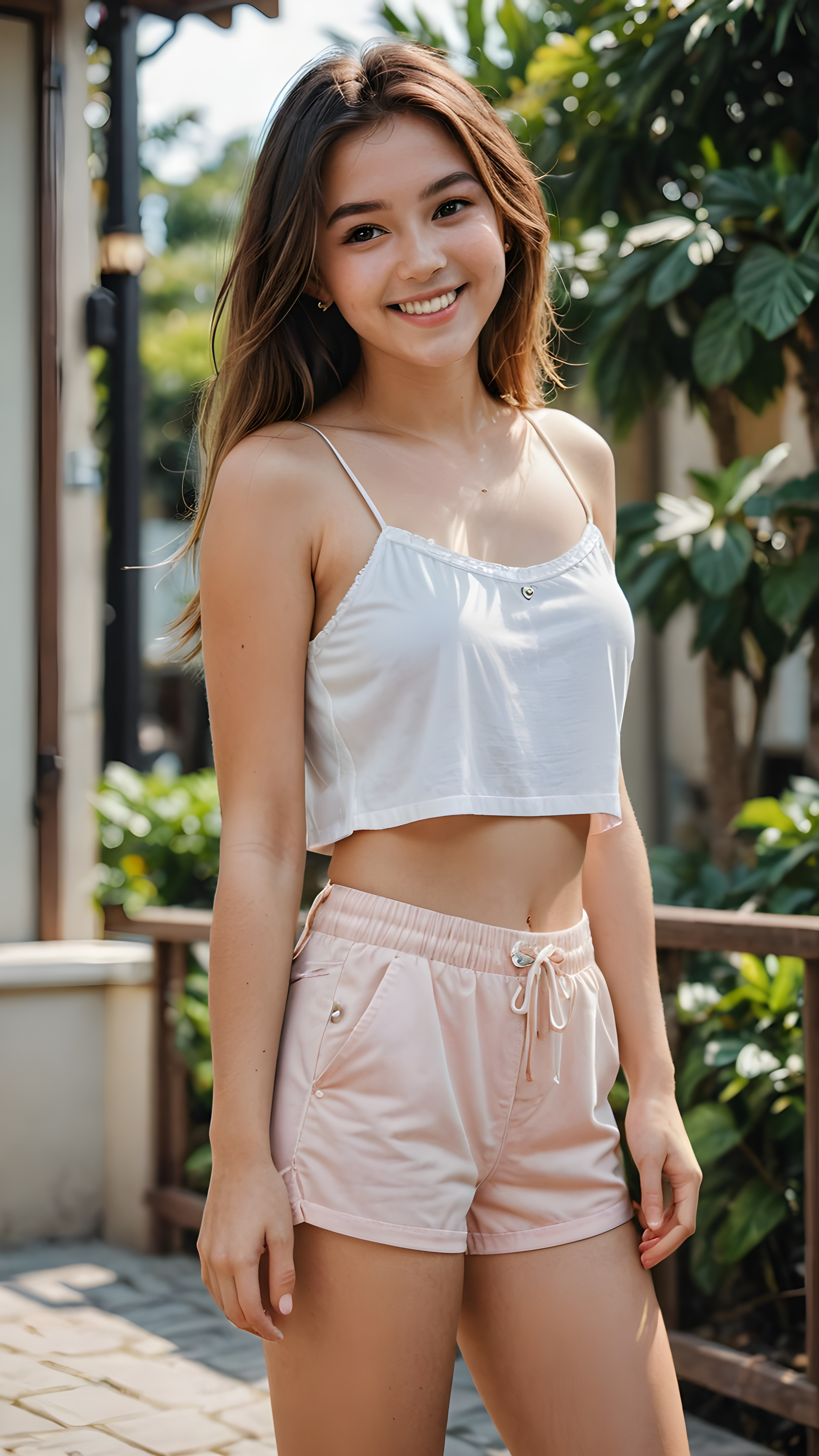 capture a beautifully drawn (((photo))) that exudes a playful essence, featuring a (((tomboy))) with loose-fitting spaghetti straps and shorts, confidently posing with a smile while flirting, with long, flowing straight hair and a figure that oozes (((stunning gorgeousness))), against a backdrop that complements her personality