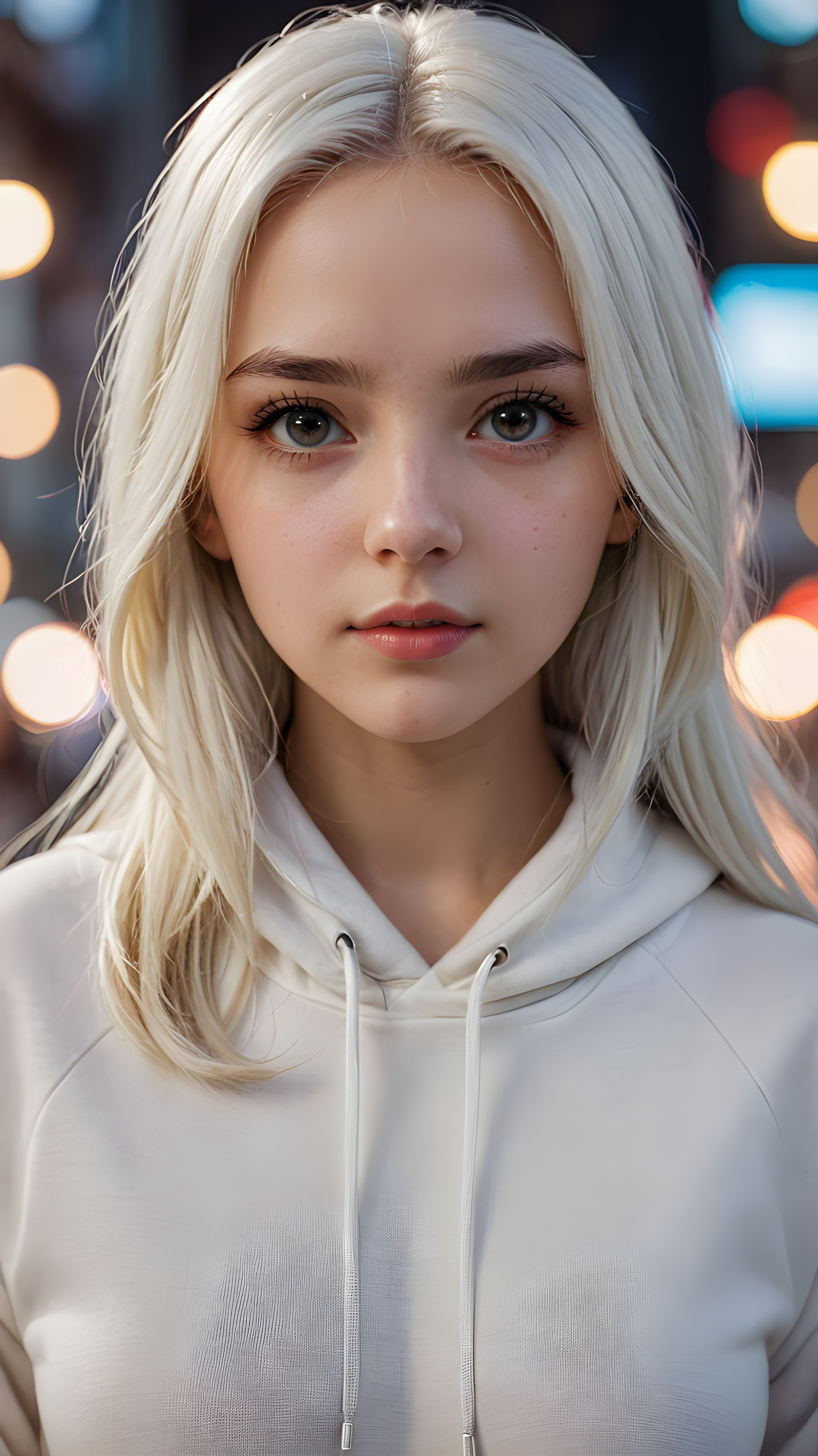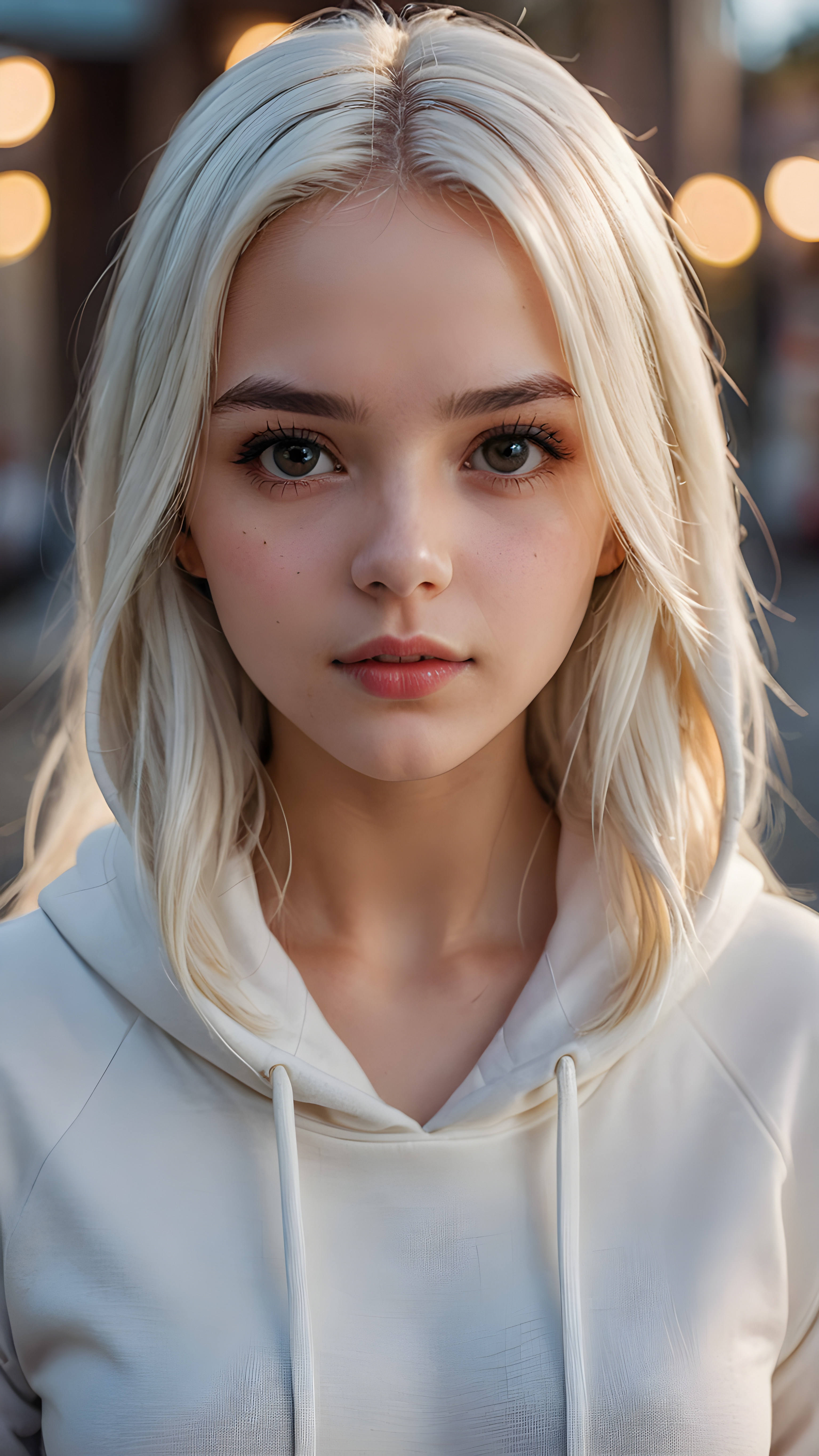 a hyper-realistic, highly detailed, vivid portrait of a young girl, long straight soft white hair, white thin hoodie, round detailed face, full lips