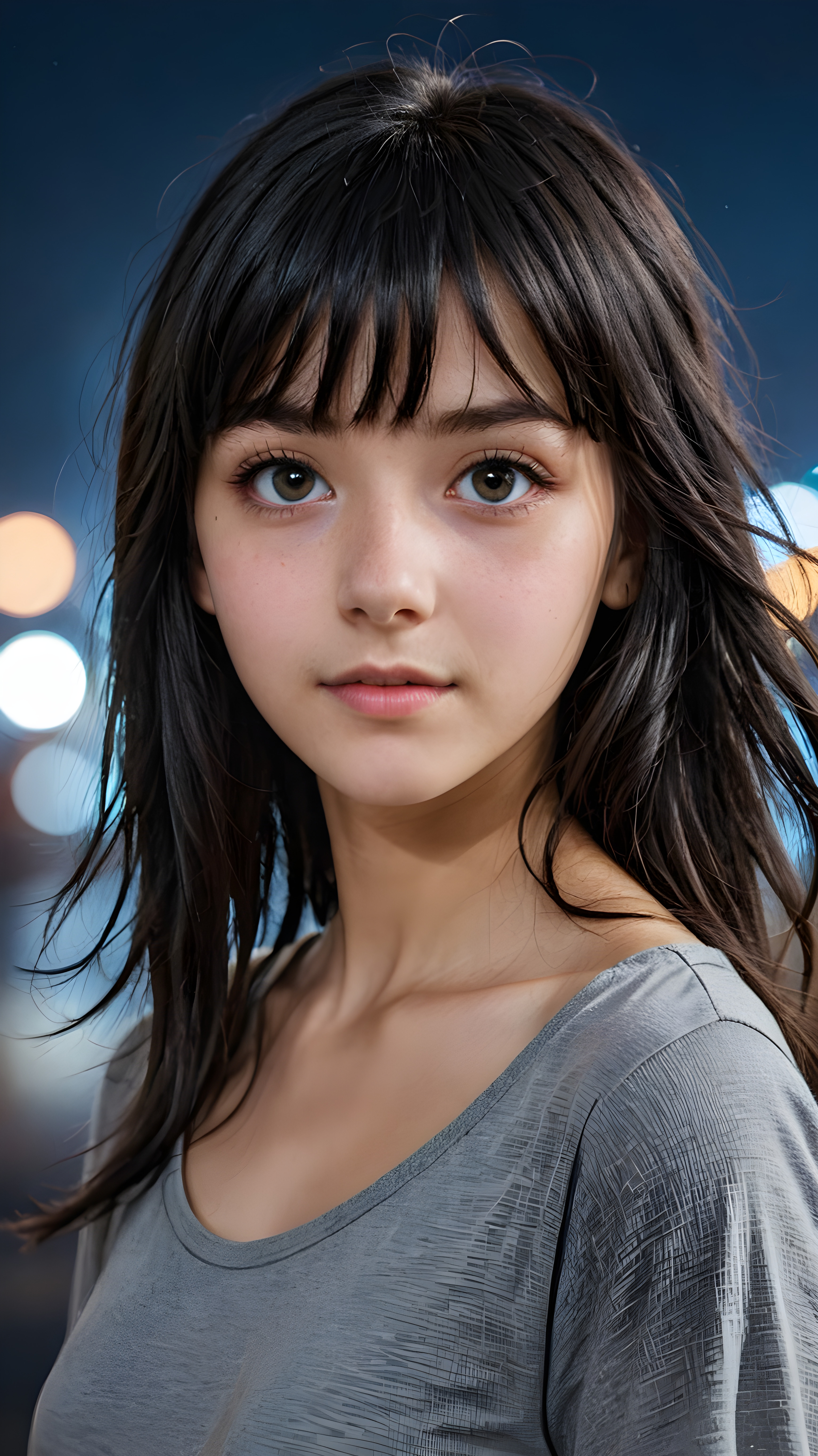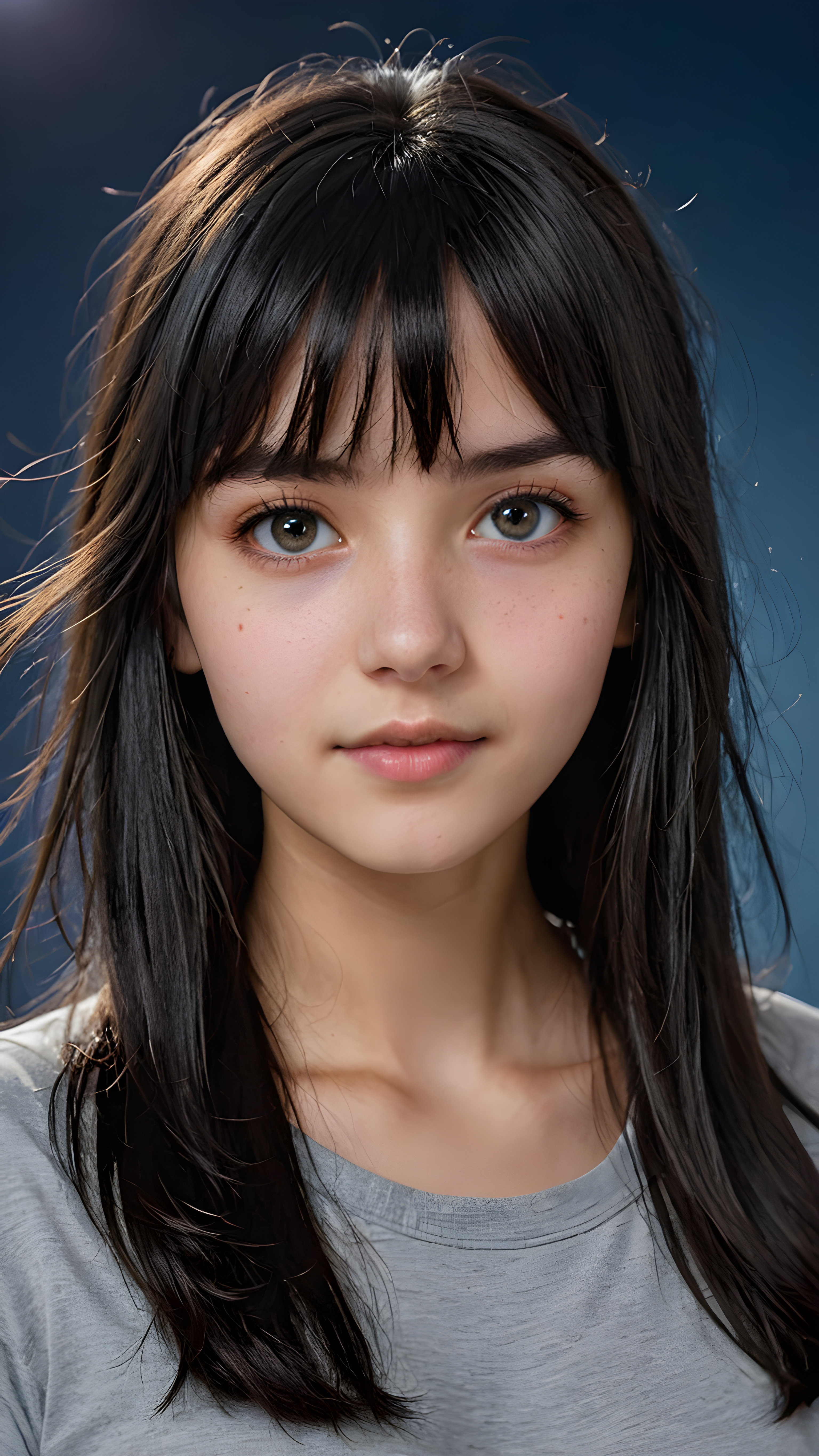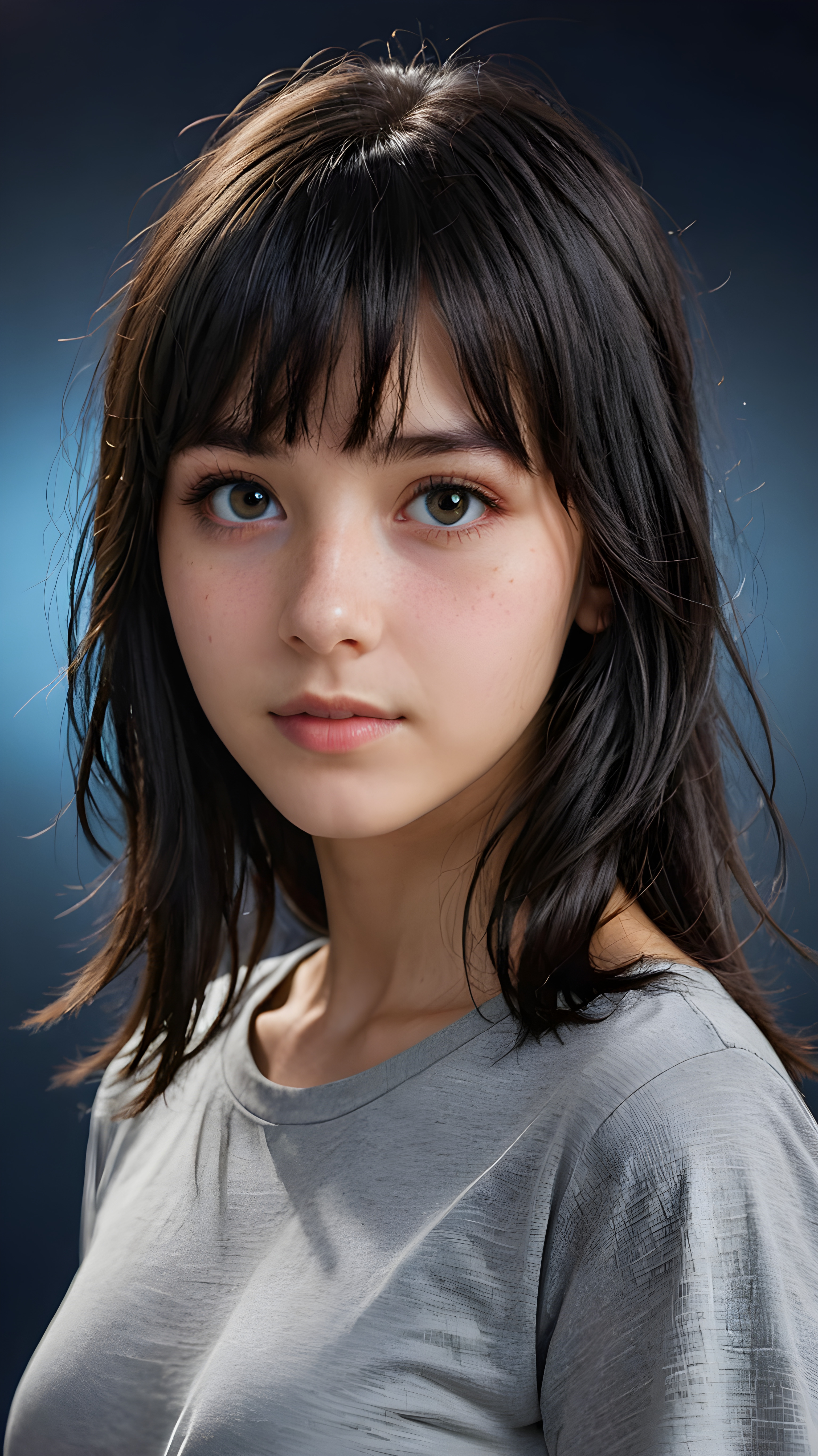 a (((teen girl with bangs cut))), (((vividly drawn long, straight soft messy black hair))) that reflects the light in a (((professional night photograph))), age 13, is depicted with exquisite detail, her face softly angelic yet realistically defined, big round eyes, wearing a (super short, sleek grey T-shirt, perfect curved body) against a blue backdrop, ((side view))