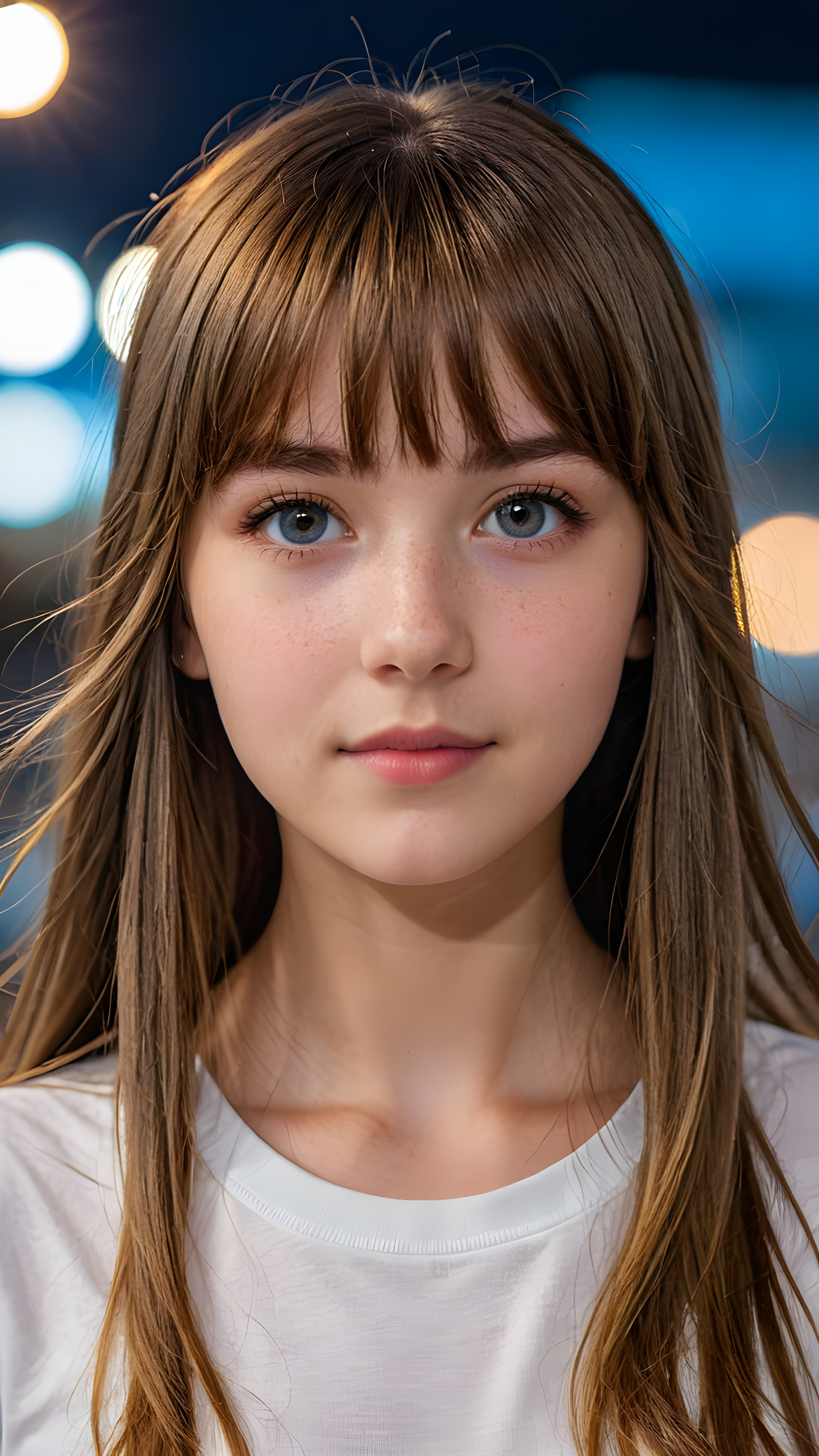 a (((teen girl with bangs cut))), (((vividly drawn long, straight soft hazel hair))) that reflects the light in a (((professional night photograph))), age 13, is depicted with exquisite detail, her face softly angelic yet realistically defined, big round eyes, wearing a (super short, sleek white T-shirt) against a blue backdrop, ((side view))