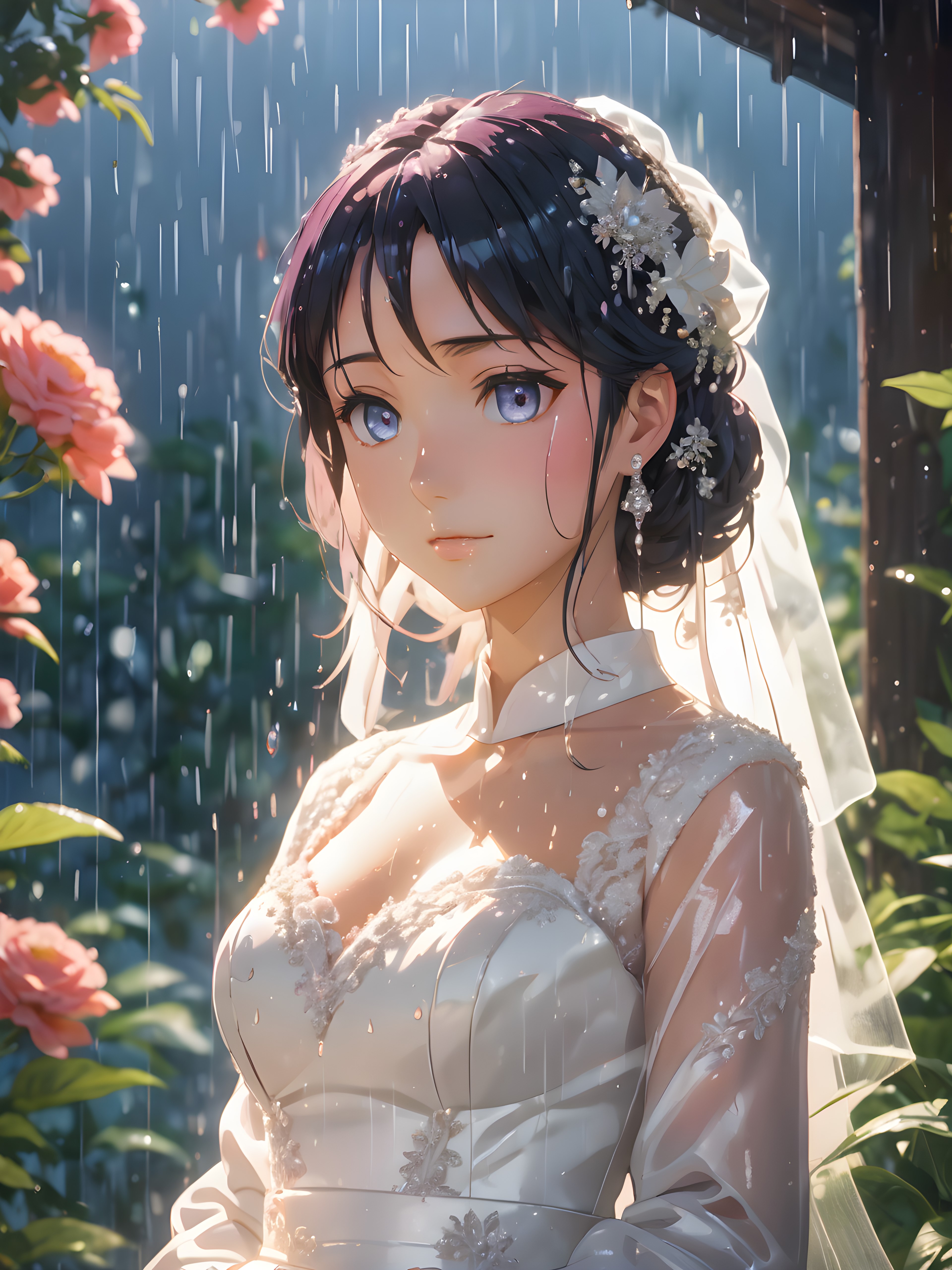 a (((bride-to-be))) standing patiently underneath a gently drizzling (((garden))), her face streaked with heartbreaking tears, encapsulating a profoundly sorrowful atmosphere despite the (((soft rain))) falling around her