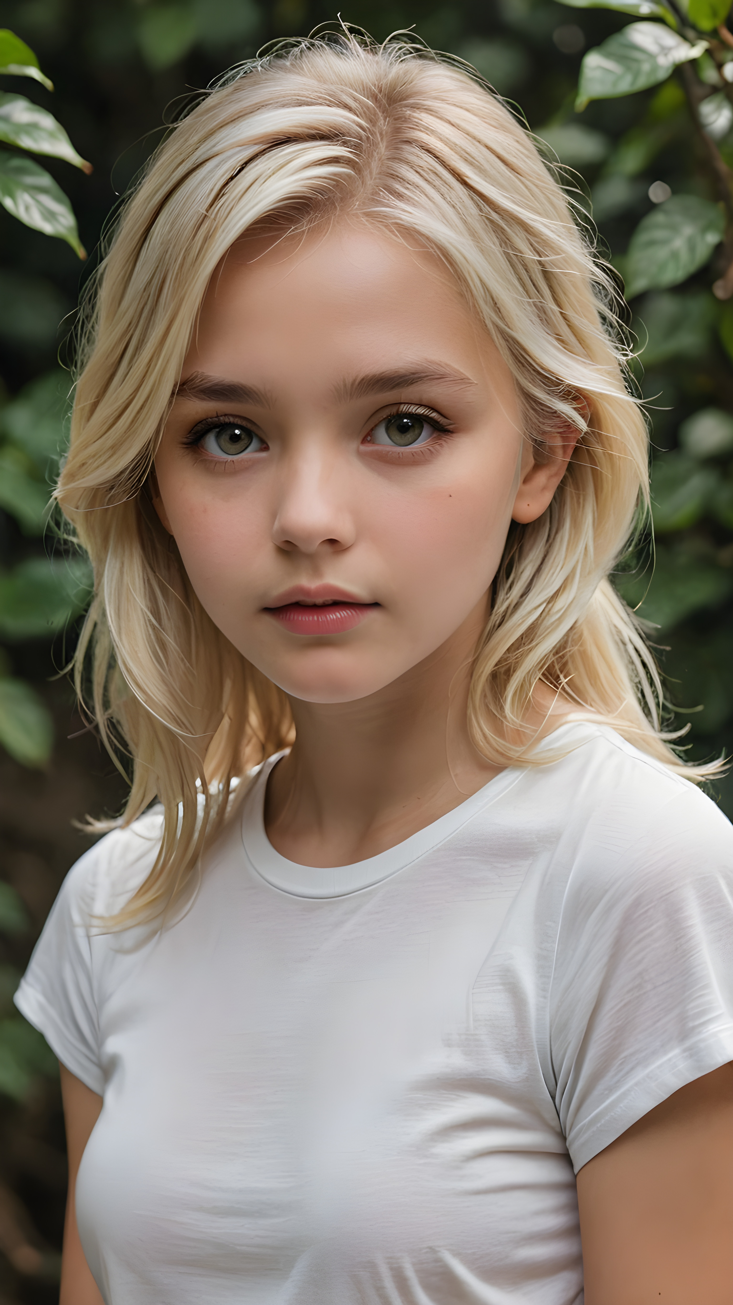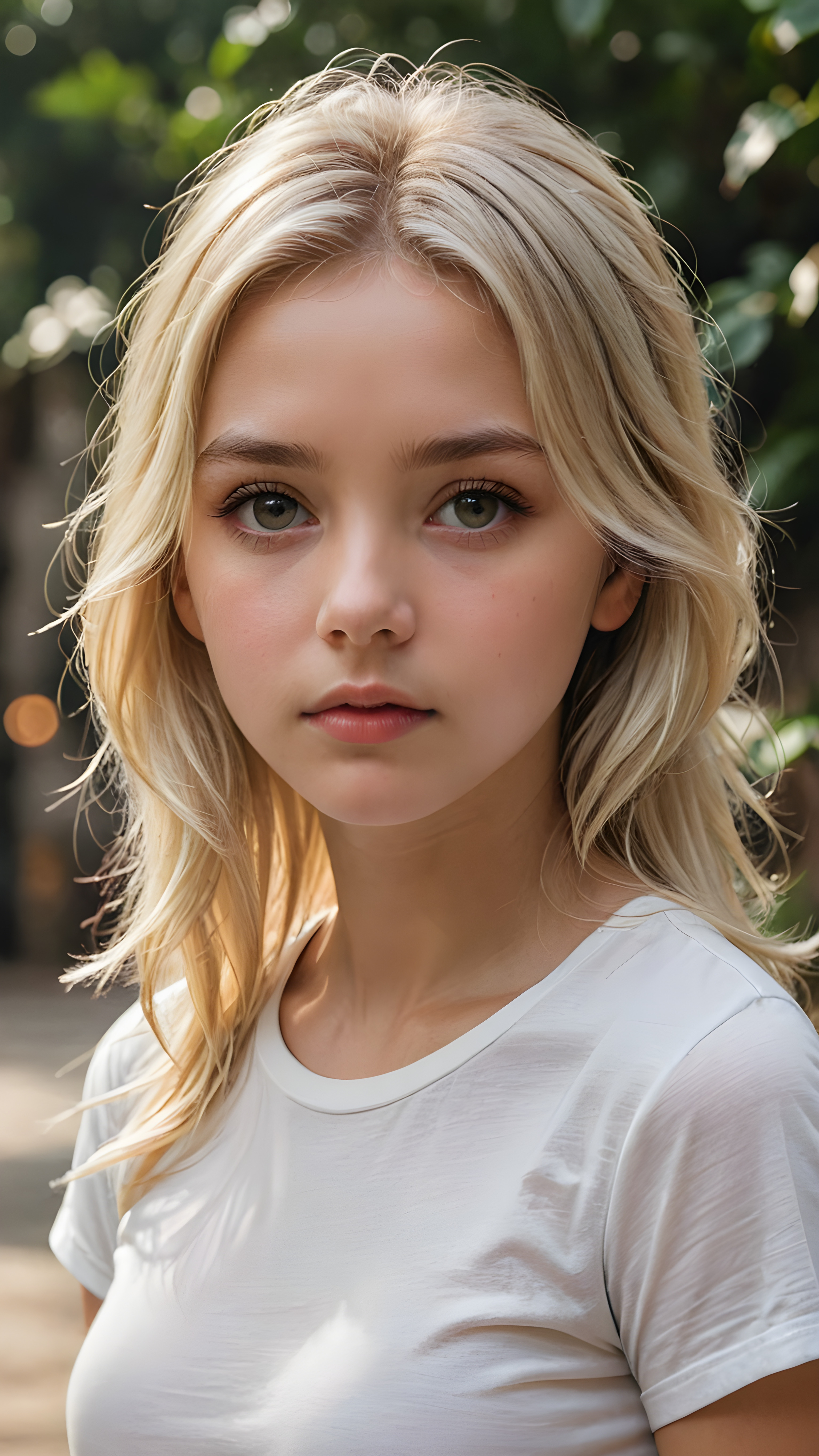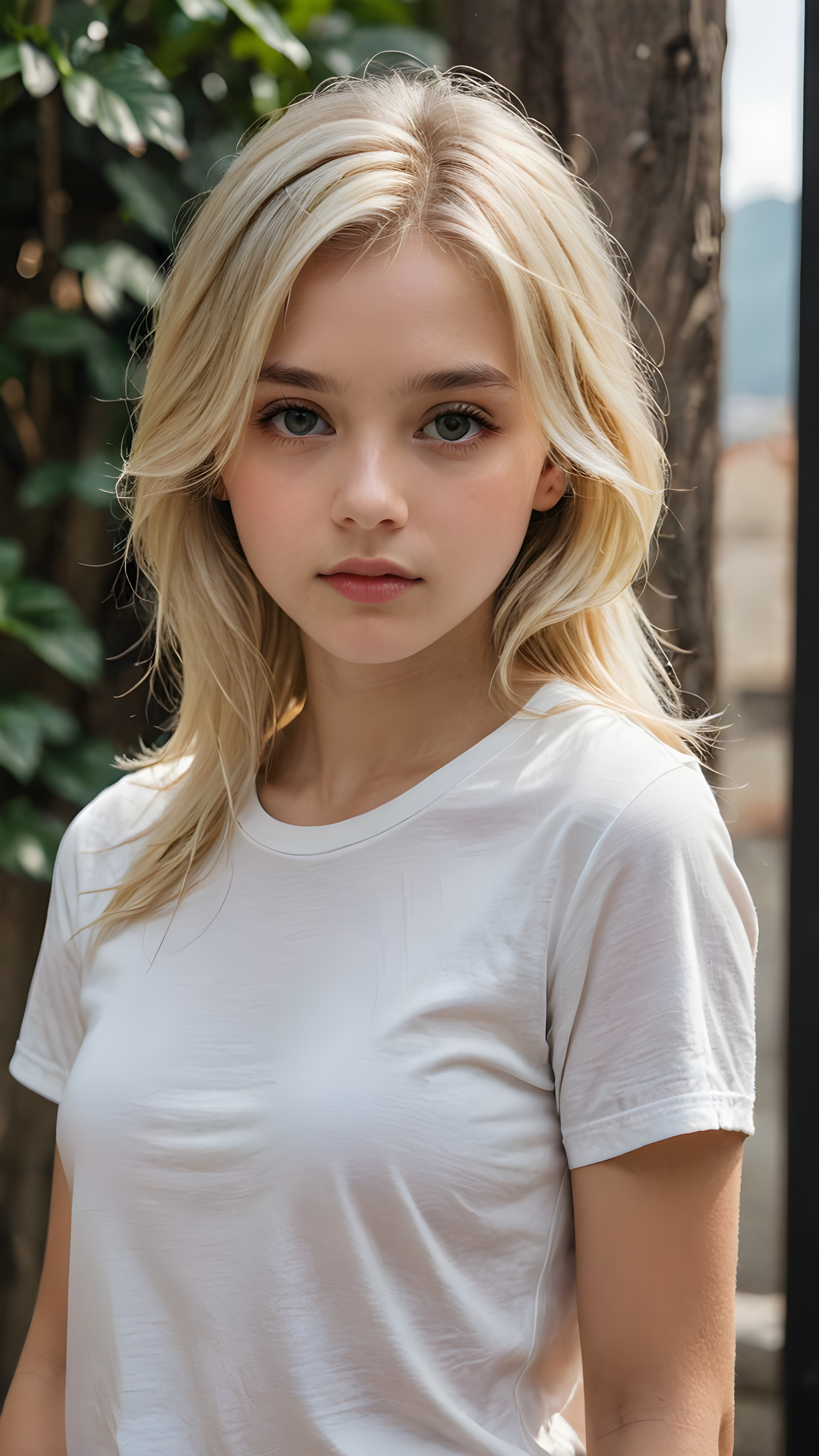 a breathtakingly detailed and hyperrealistic (((professional photograph))), portraying an intensely sorrowful expression on the face of a young girl with luxuriantly flowing, untamed, straight, silky white blonde hair cascading down her shoulders, despite its perfect length and texture suggesting advanced age, paired with a minimalist ((white short sleeve T-shirt))