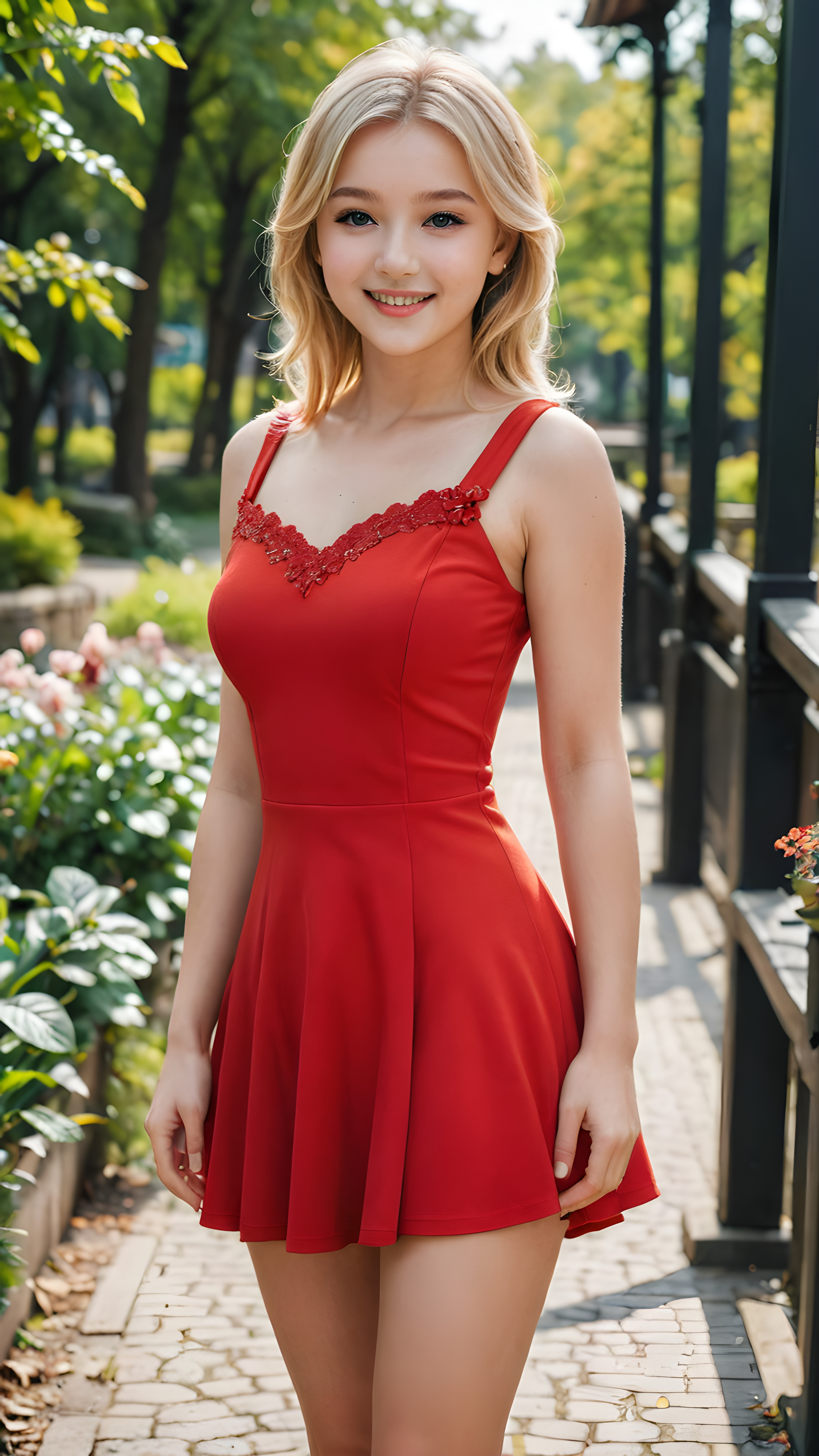 ((gorgeous)) ((stunning)) an ultra high definition, intricate details that make the scene feel hyper-realistic, with a close-up full body shot of a (((cute girl))), 17 years old, blond hair, showing off her legs as (((fully clothed))) while maintaining a playful smile, wears a elegant dress in red, stand in a field