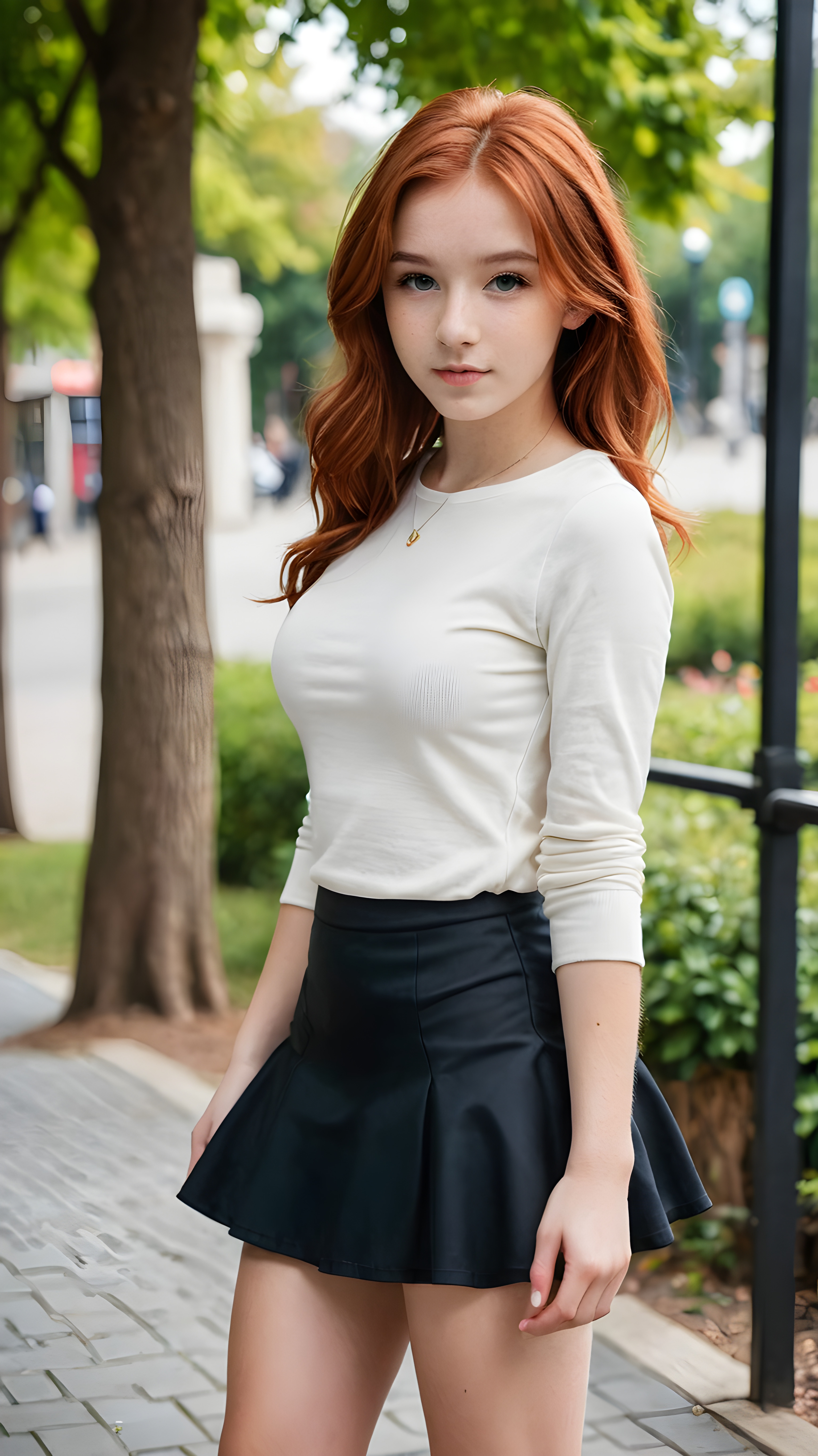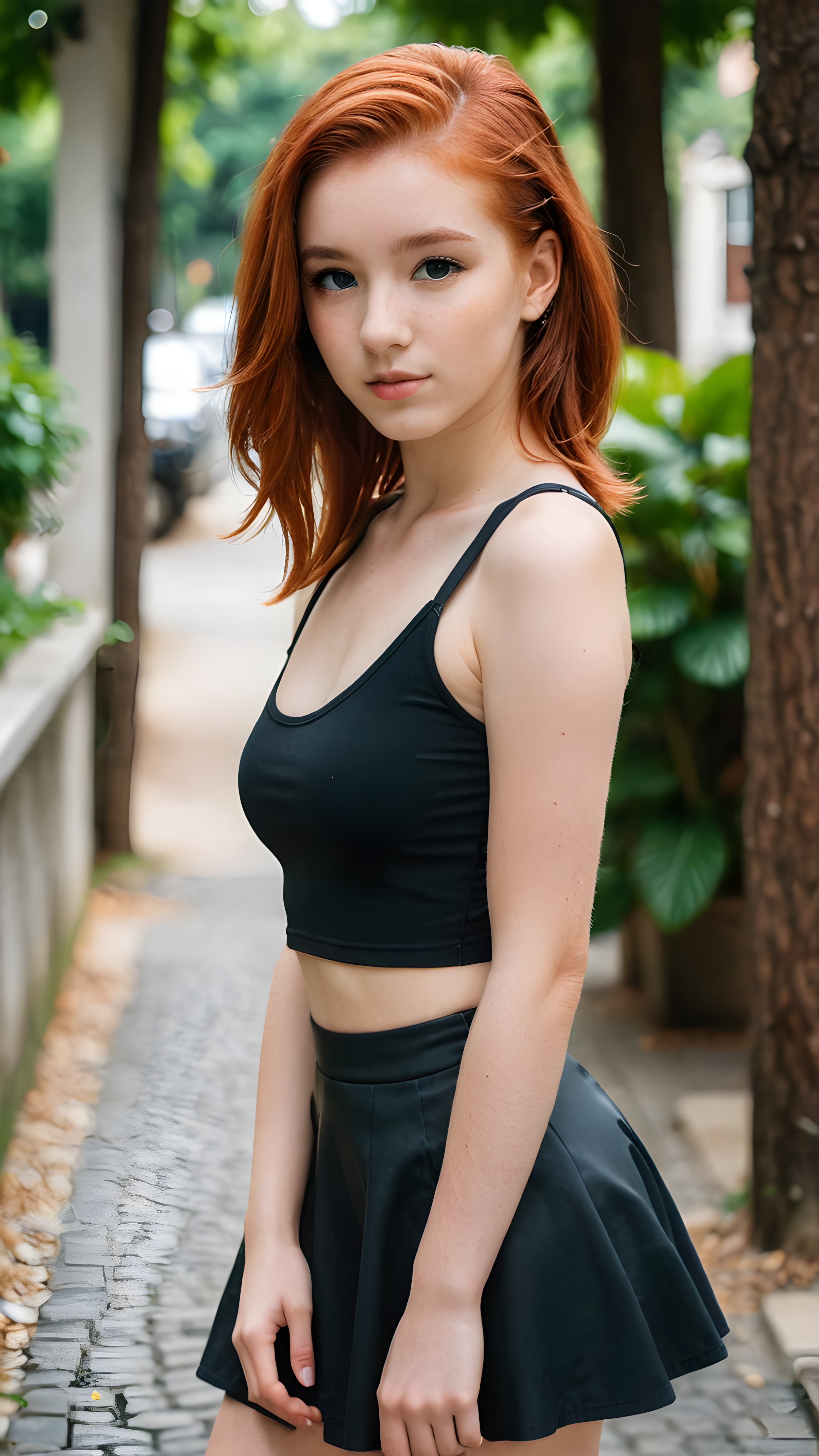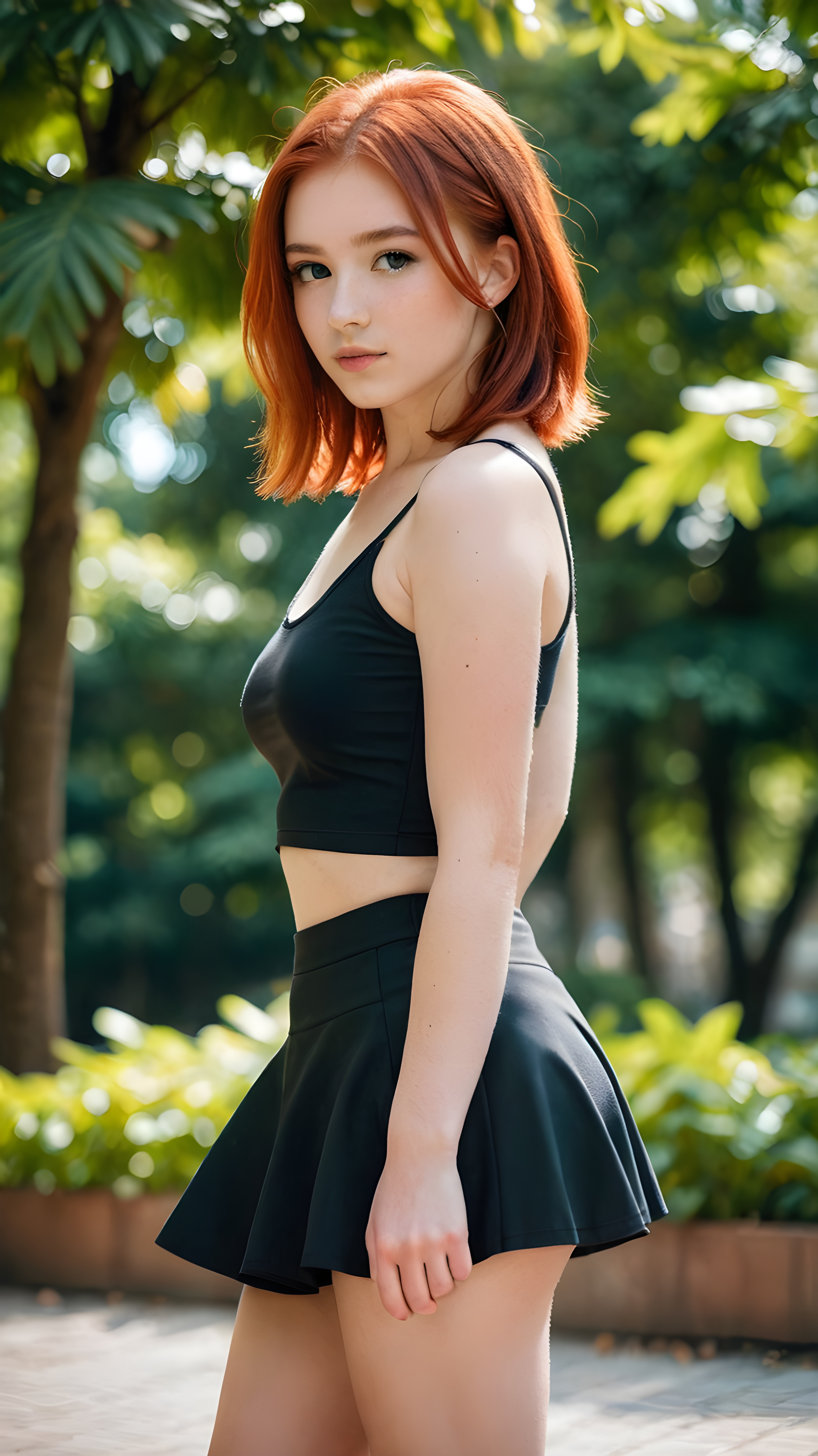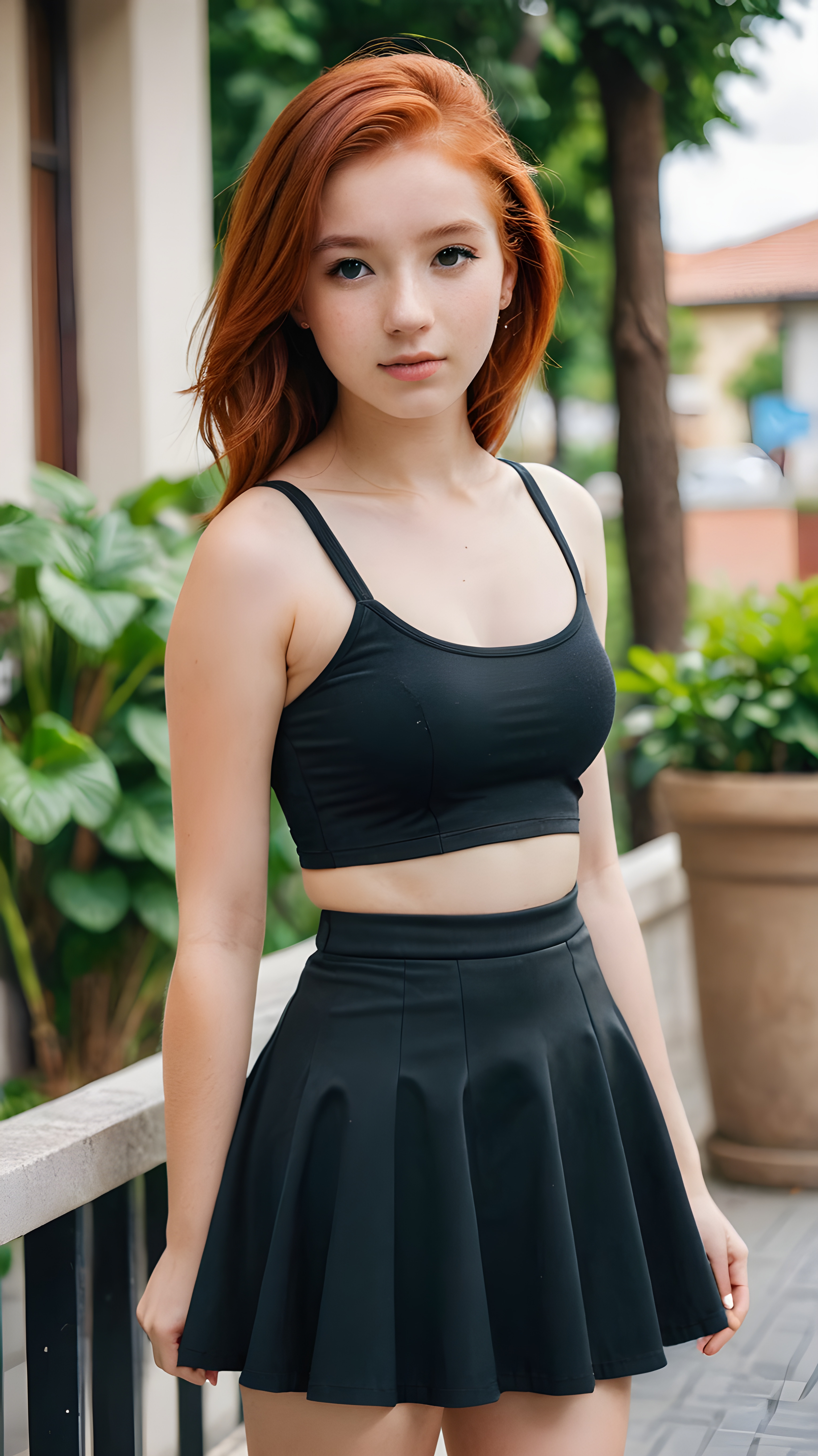 a stunningly beautiful (((young teen girl with red hair and a black, sleek round mini skirt and thin super short crop tank top))) who exudes an air of sophistication and elegance, with flawless skin and a slender figure