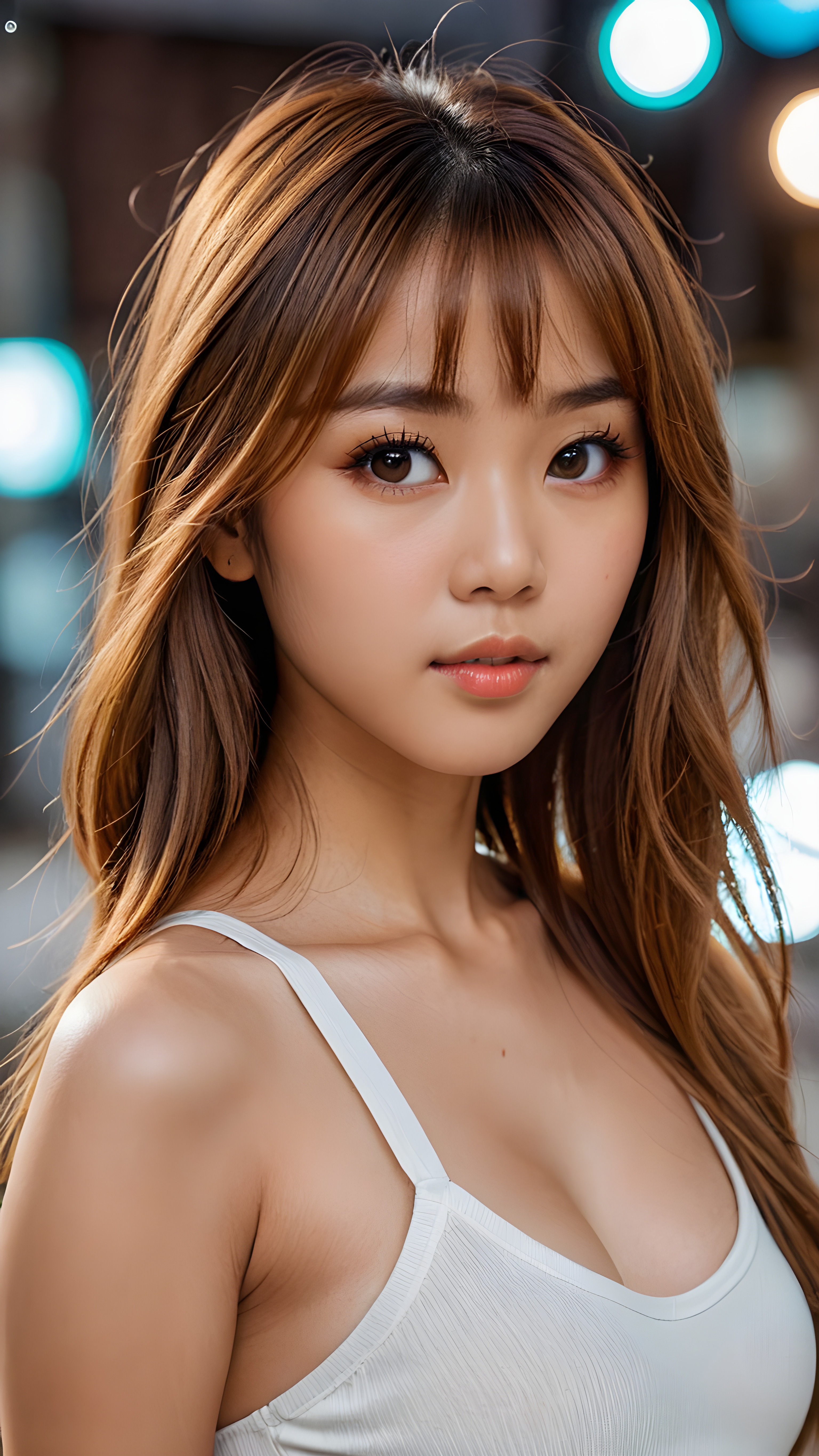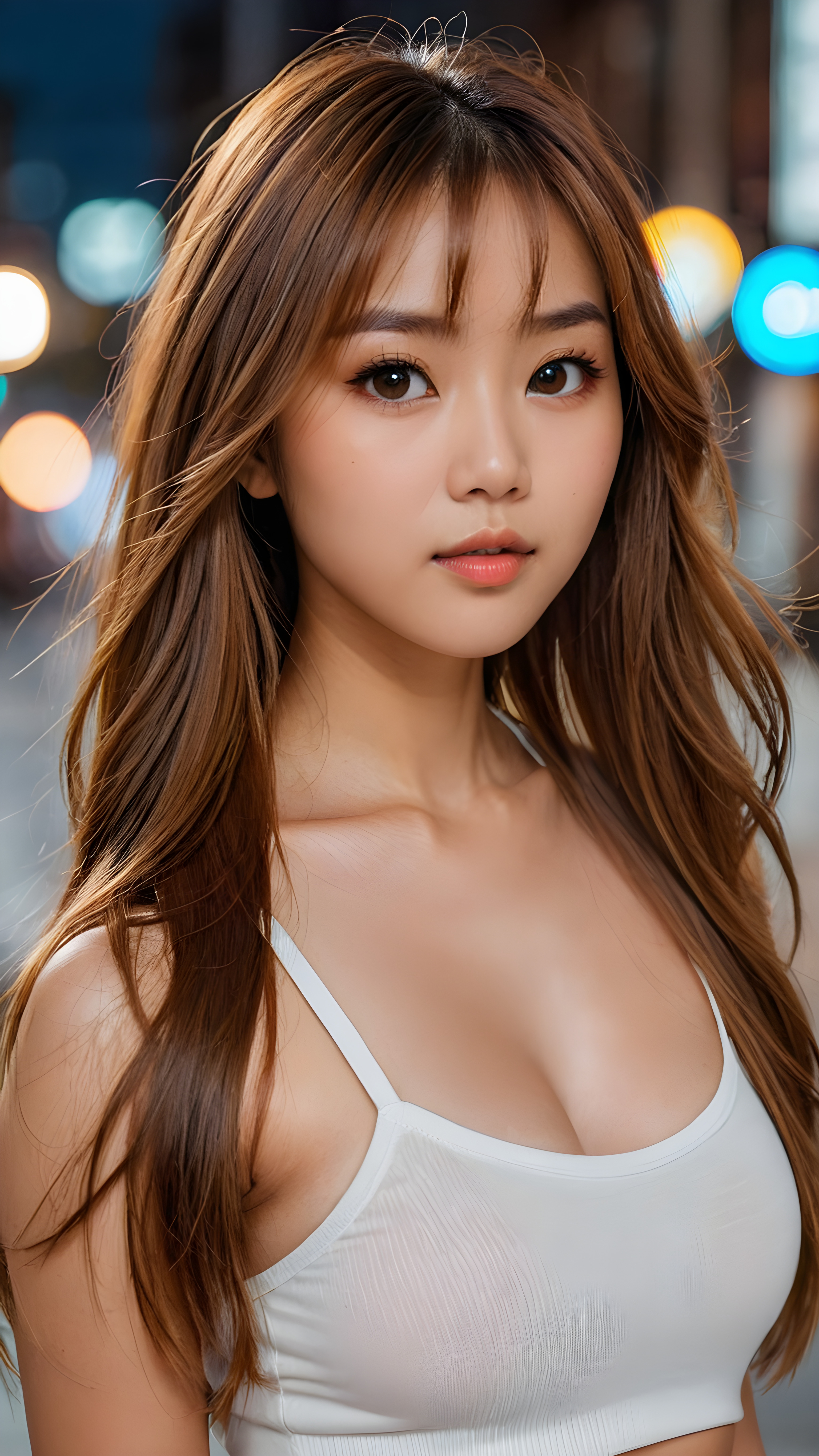 a (((long, straight hazelnut hair))) ((stunning)) beautifully realistic, cinematic lights, ((hot busted Asian woman)), bangs cut, realistic detailed angelic round face, ((realistic detailed hazelnut eye)) looks sadly at the camera, portrait shot, perfect curved body, (wears a tight (white crop top)), perfect anatomy, side perspective
