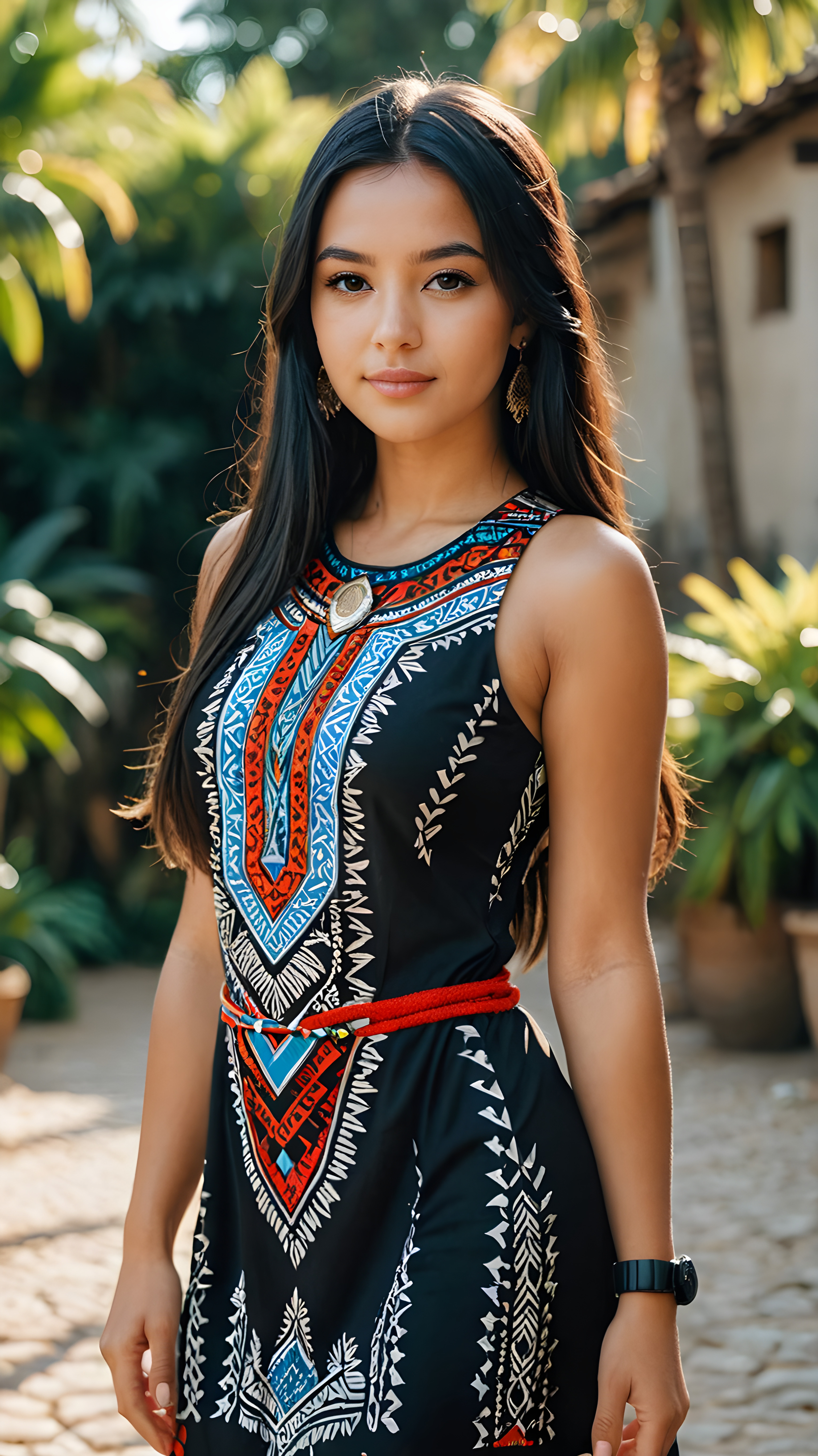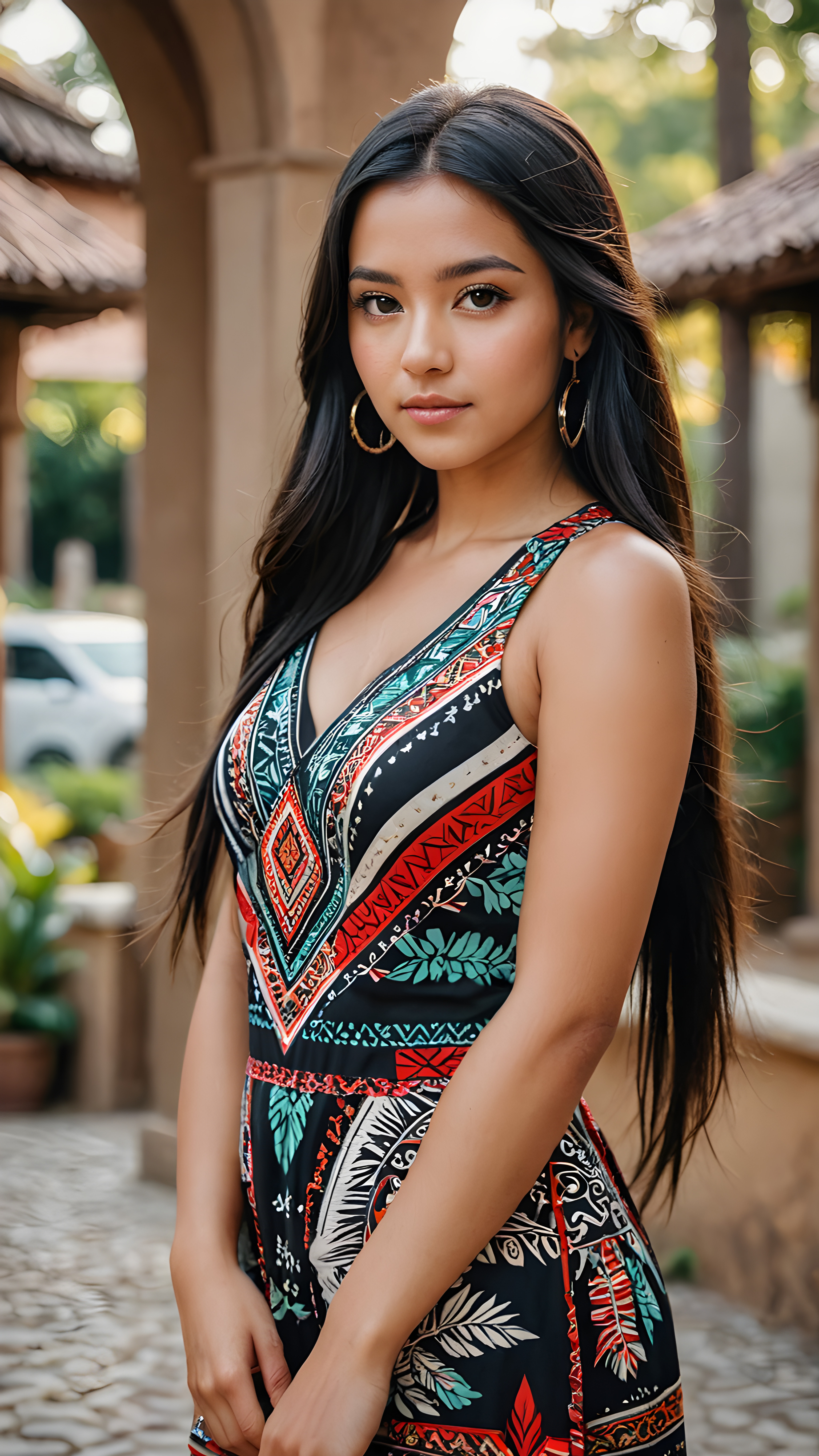 a beautiful Latino girl with long straight black hair wearing a tribal print dress