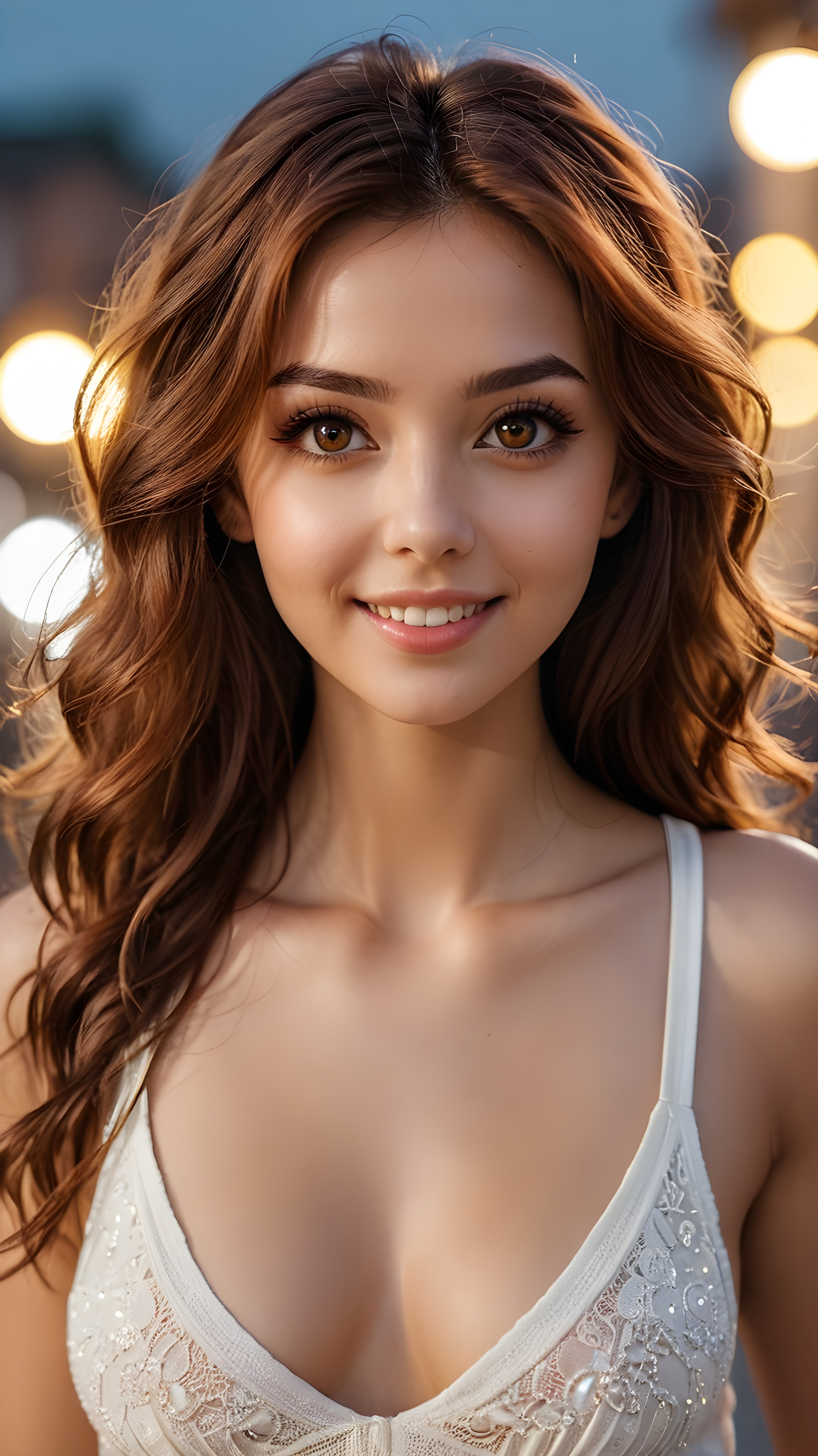 a hyper-realistic, highly-detailed, vivid ((full body)) photo), of a beautiful, stunning, ((slender)), ((fit body)), ((cute girl, wears a thin tank top with a deep v-neck)), ((very long very thick very wavy auburn hair)), ((natural light makeup)), and ((detailed eyes)), (((amber eyes))), ((catch lights in both eyes)), ((matching eyes)), ((playful coy smile)), ((perfect teeth)), ((face illuminated))