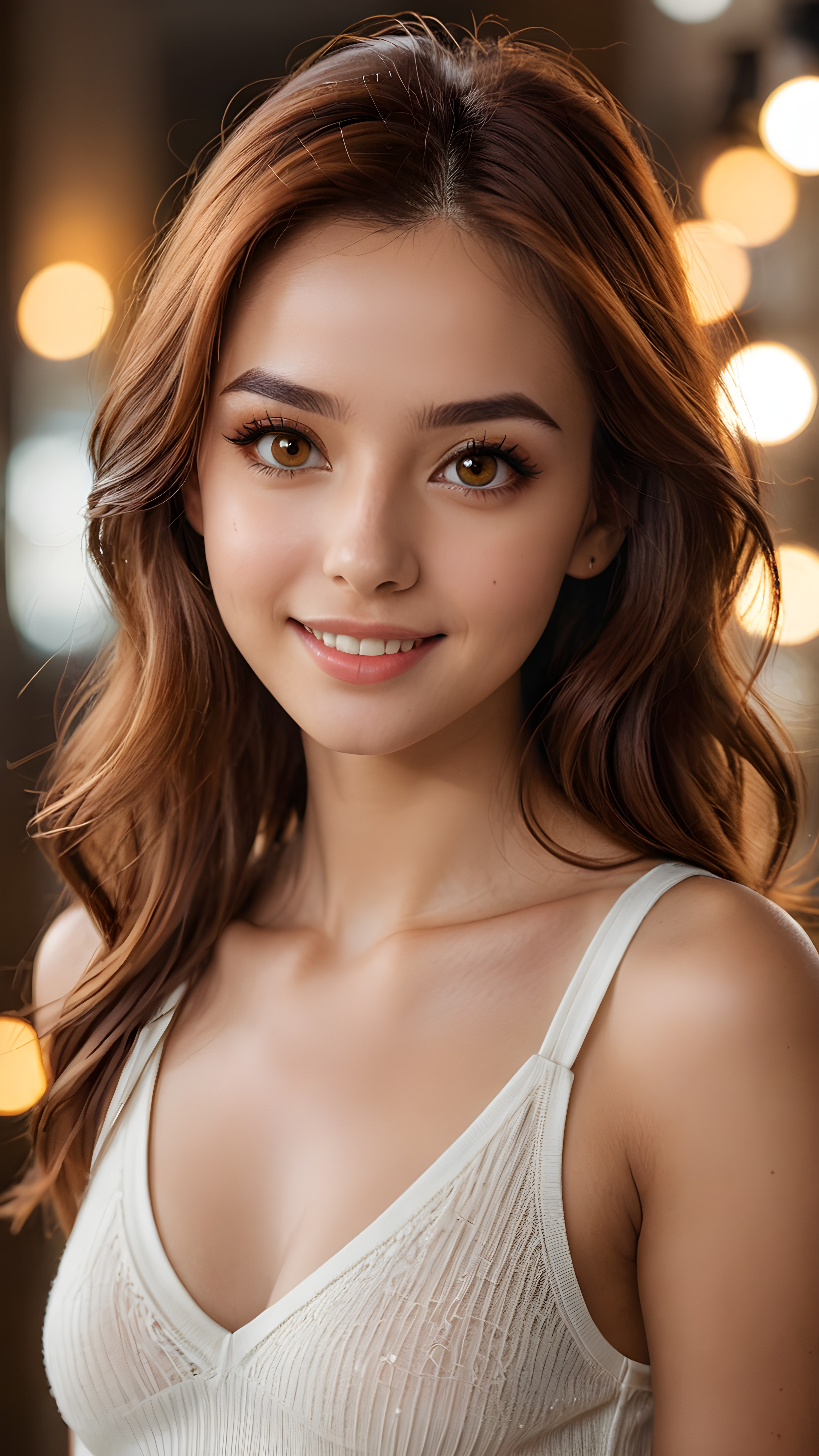 a hyper-realistic, highly-detailed, vivid ((full body)) photo), of a beautiful, stunning, ((slender)), ((fit body)), ((cute girl, wears a thin tank top with a deep v-neck)), ((very long very thick very straight auburn soft hair)), ((natural light makeup)), and ((detailed eyes)), (((amber eyes))), ((catch lights in both eyes)), ((matching eyes)), ((playful coy smile)), ((perfect teeth)), ((face illuminated))