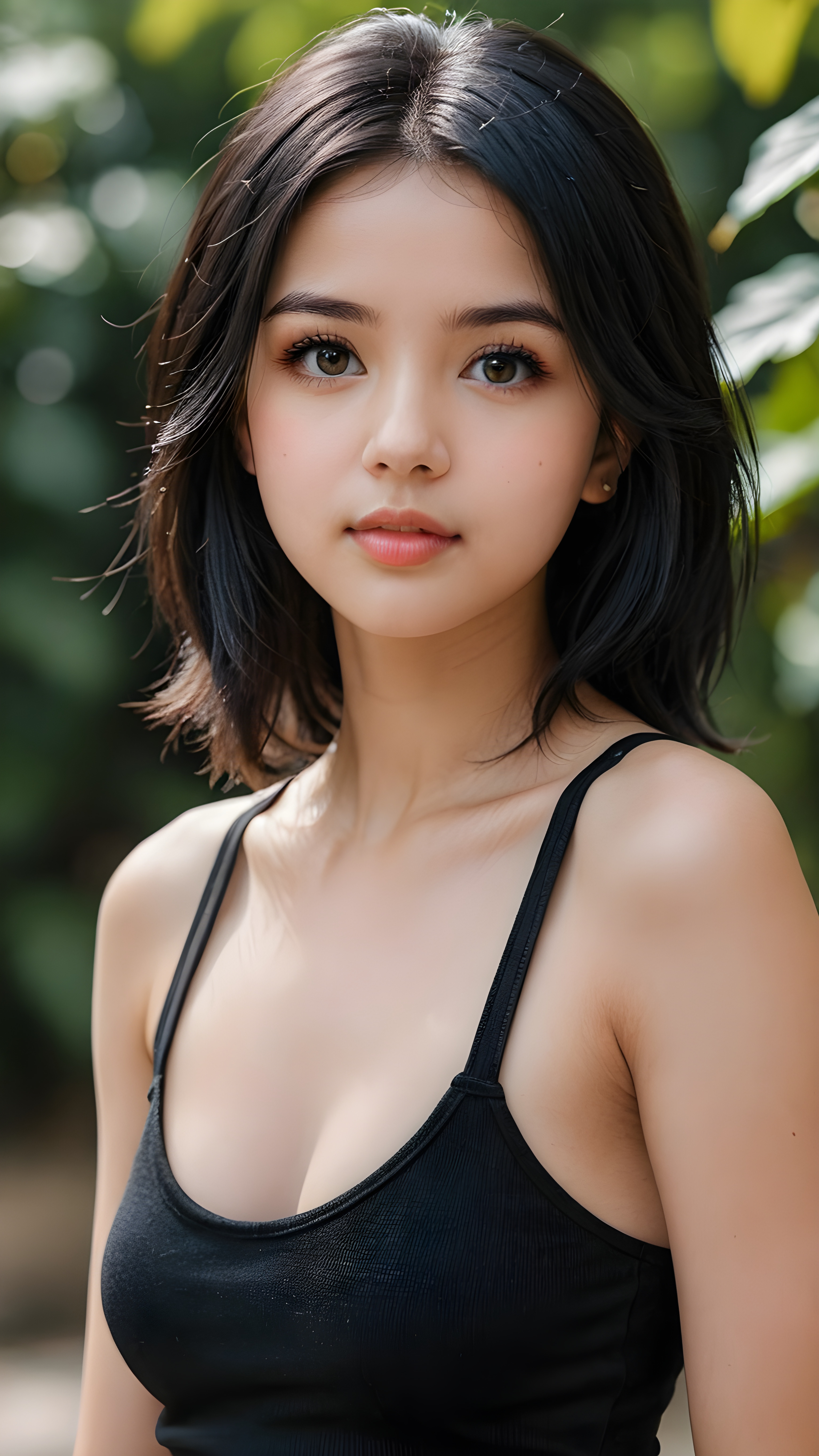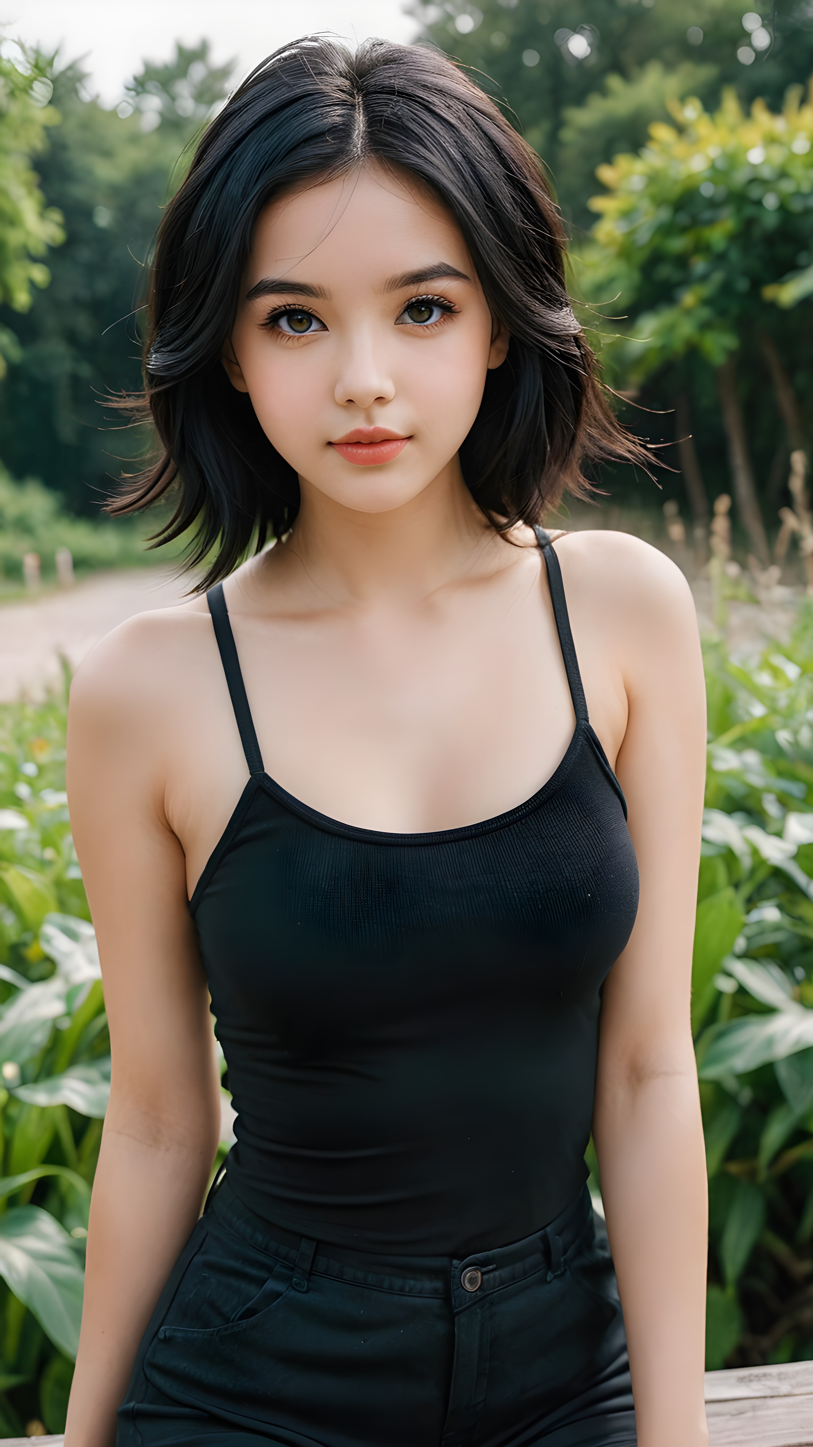 a (((young petite girlie))), wears a short cropped black tank top, straight soft long black hair, black detailed beautiful eyes, ((round face)), full kissable lips, round eyes, perfect skin