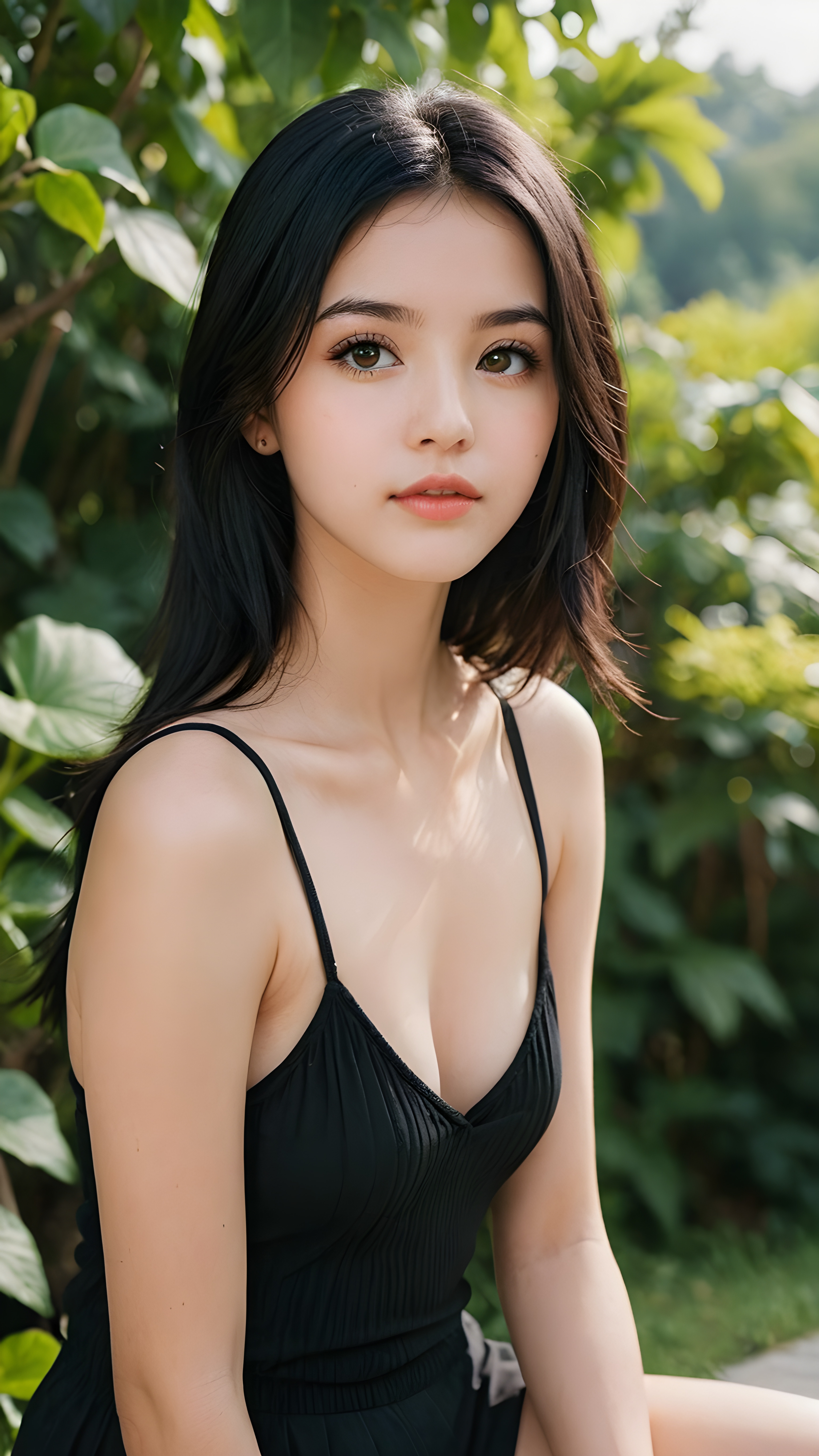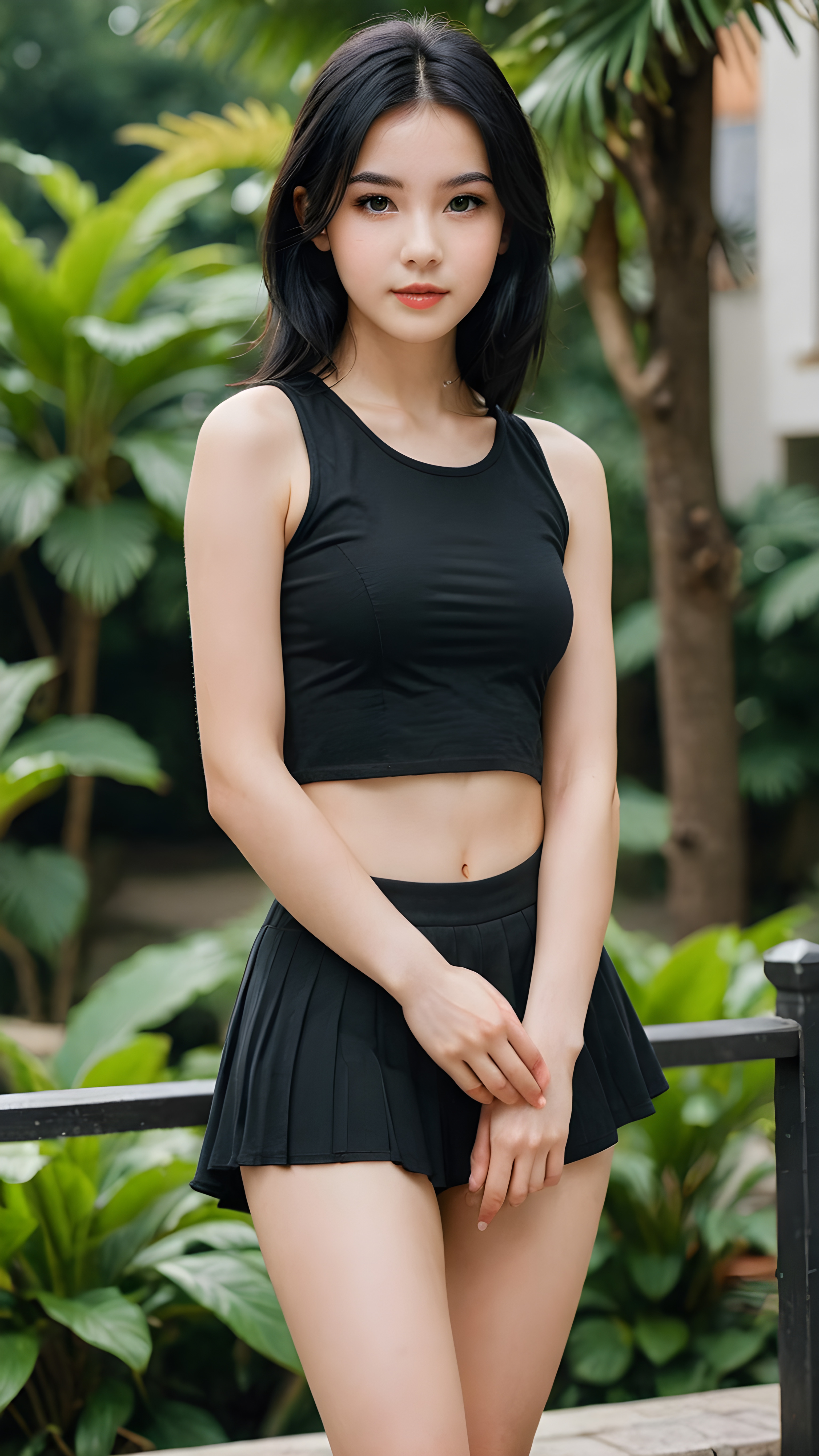 a very pretty young petite girlie, wears a very short cropped black tank top, very long soft black hair, round cheeks, pale slender legs, visible kneeks, black detailed beautiful eyes, ((round face)), full kissable lips, round eyes, perfect skin