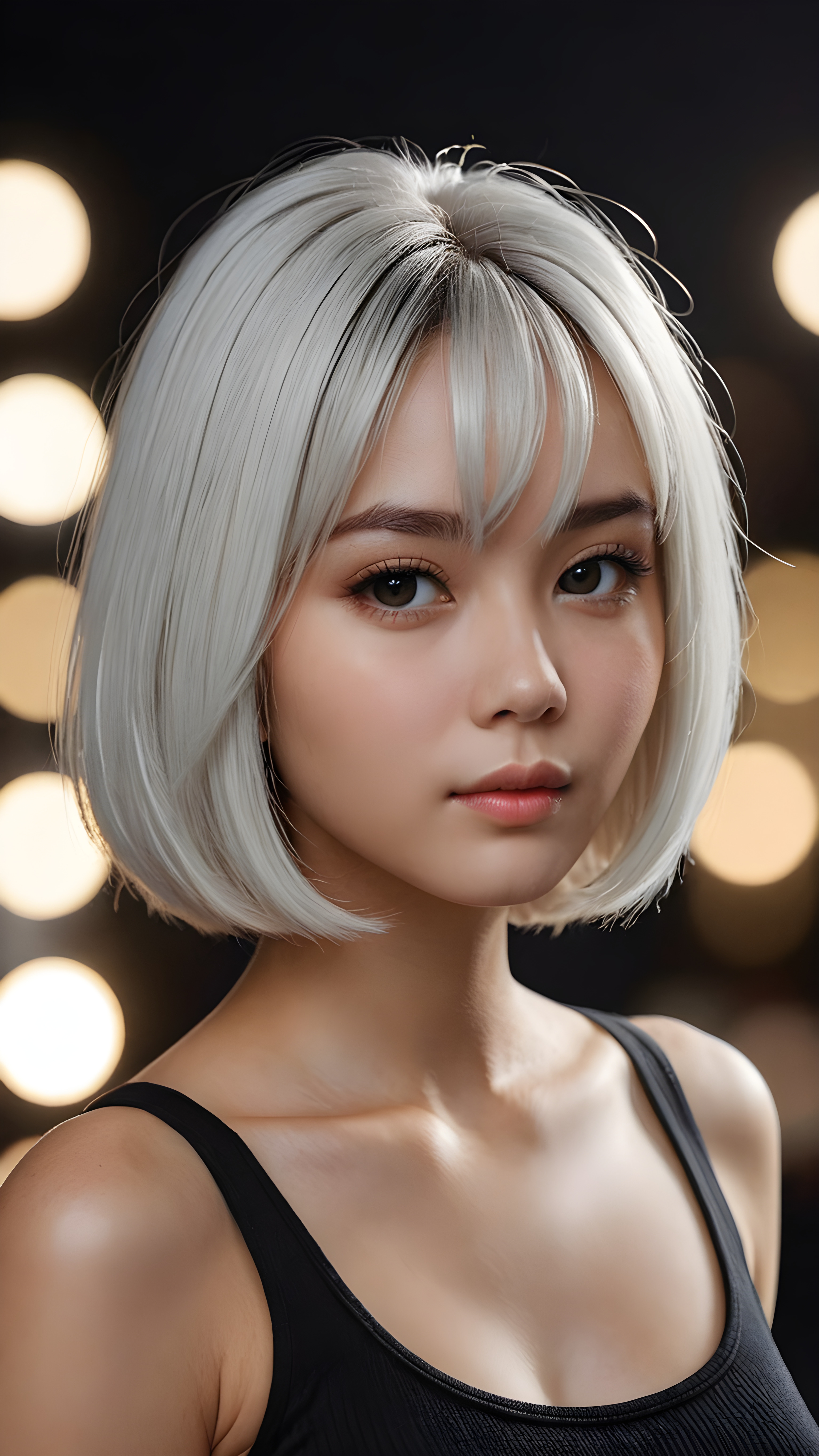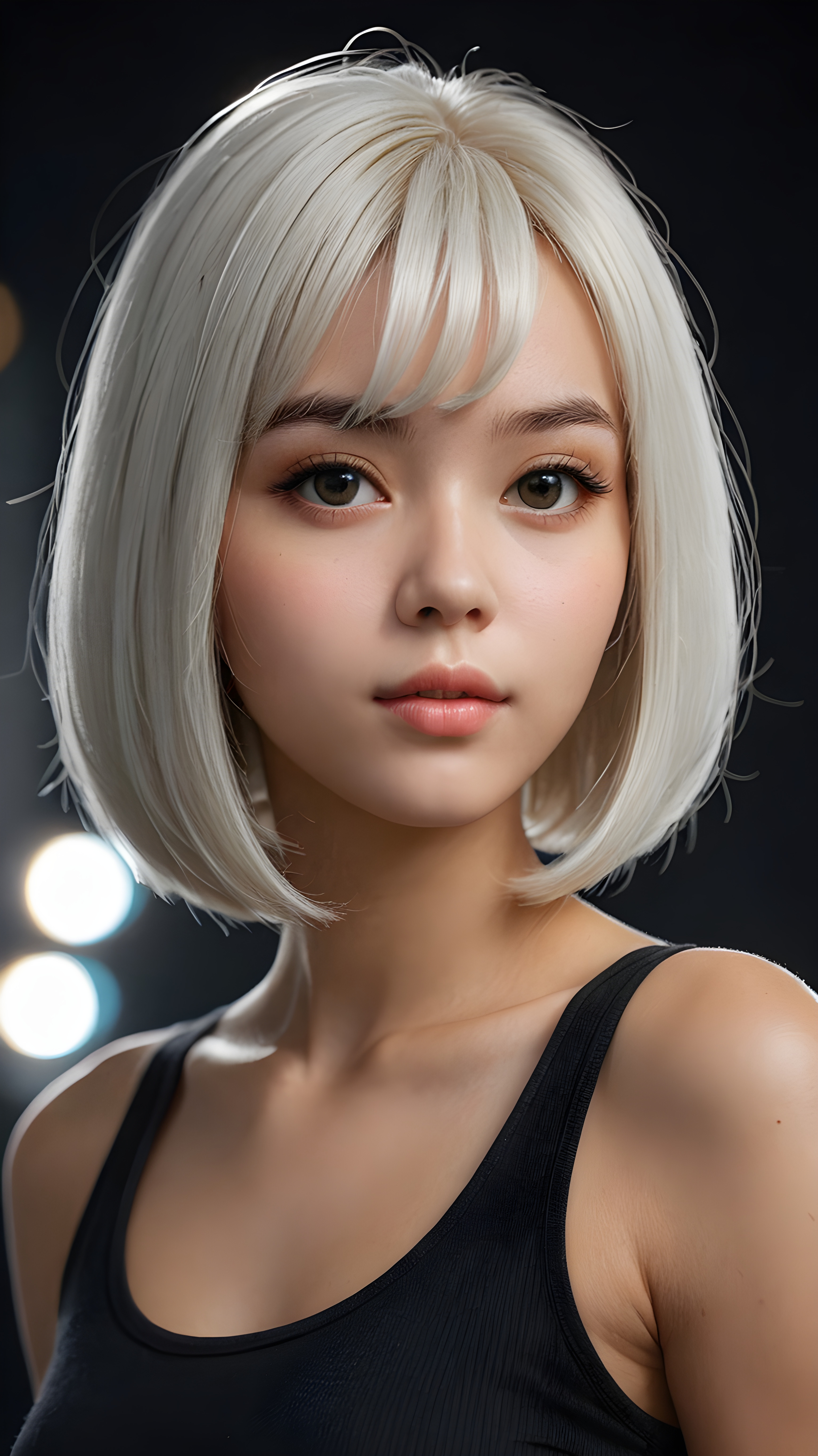 a (((beautiful girl))) with a (((bob cut hair style, soft straight white hair))), accompanied by (((volumetric lighting))) that bring out the (masterpiece) details, all against a (plain, dark backdrop) that focuses on the (face) and its intricate, (hyper-realistic) features, captures the essence of (digital art), ((black dressed in an short tank top))