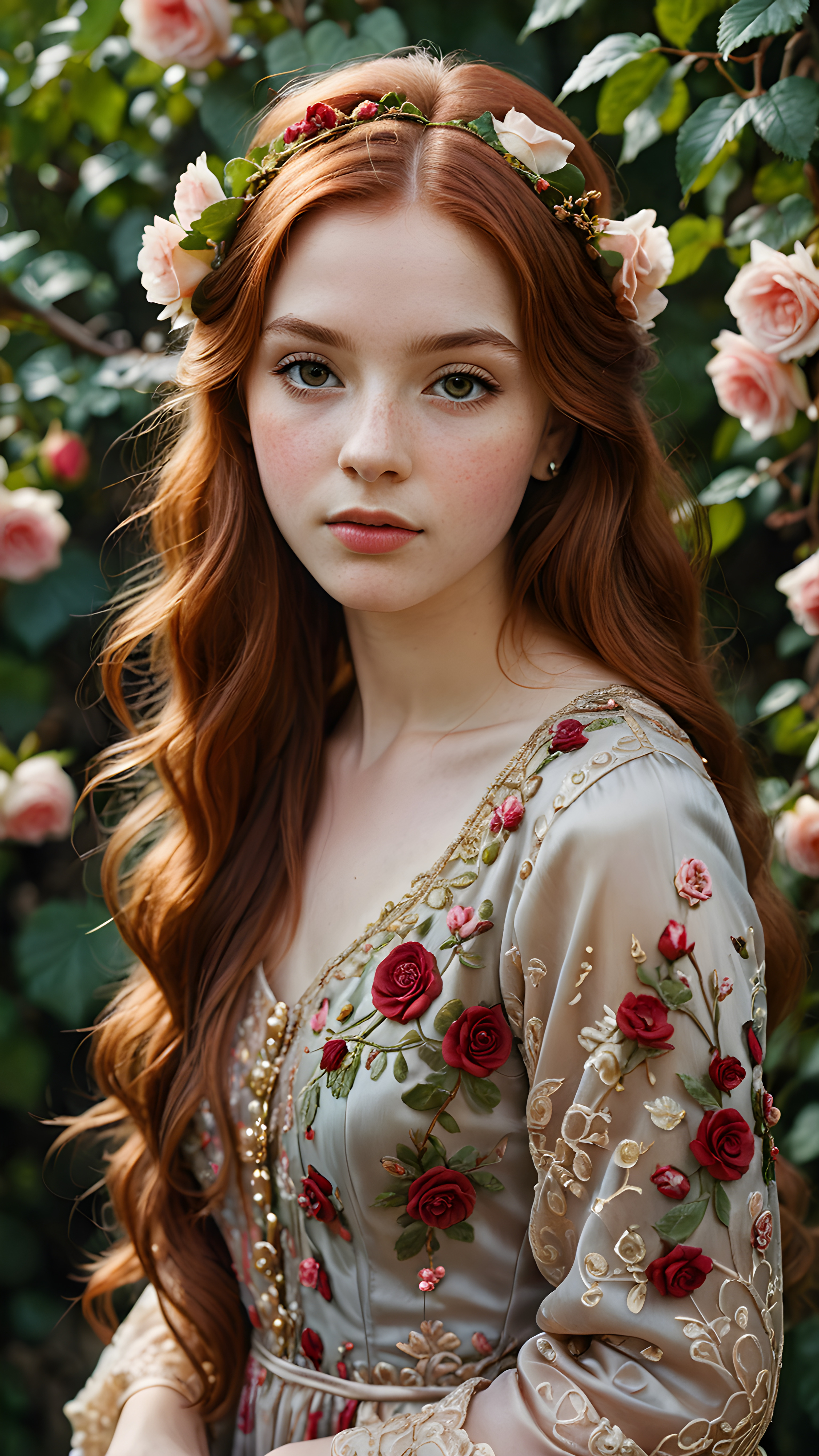 a (((beautiful oil portrait))), featuring a young girl with flowing (((long auburn hair))), intricate details drawn using shades of red wine grapes and vines interwoven with delicate ((roses)), her face captured in a serene expression, dressed in a luxurious ((long dress)) adorned with ornate patterns of roses