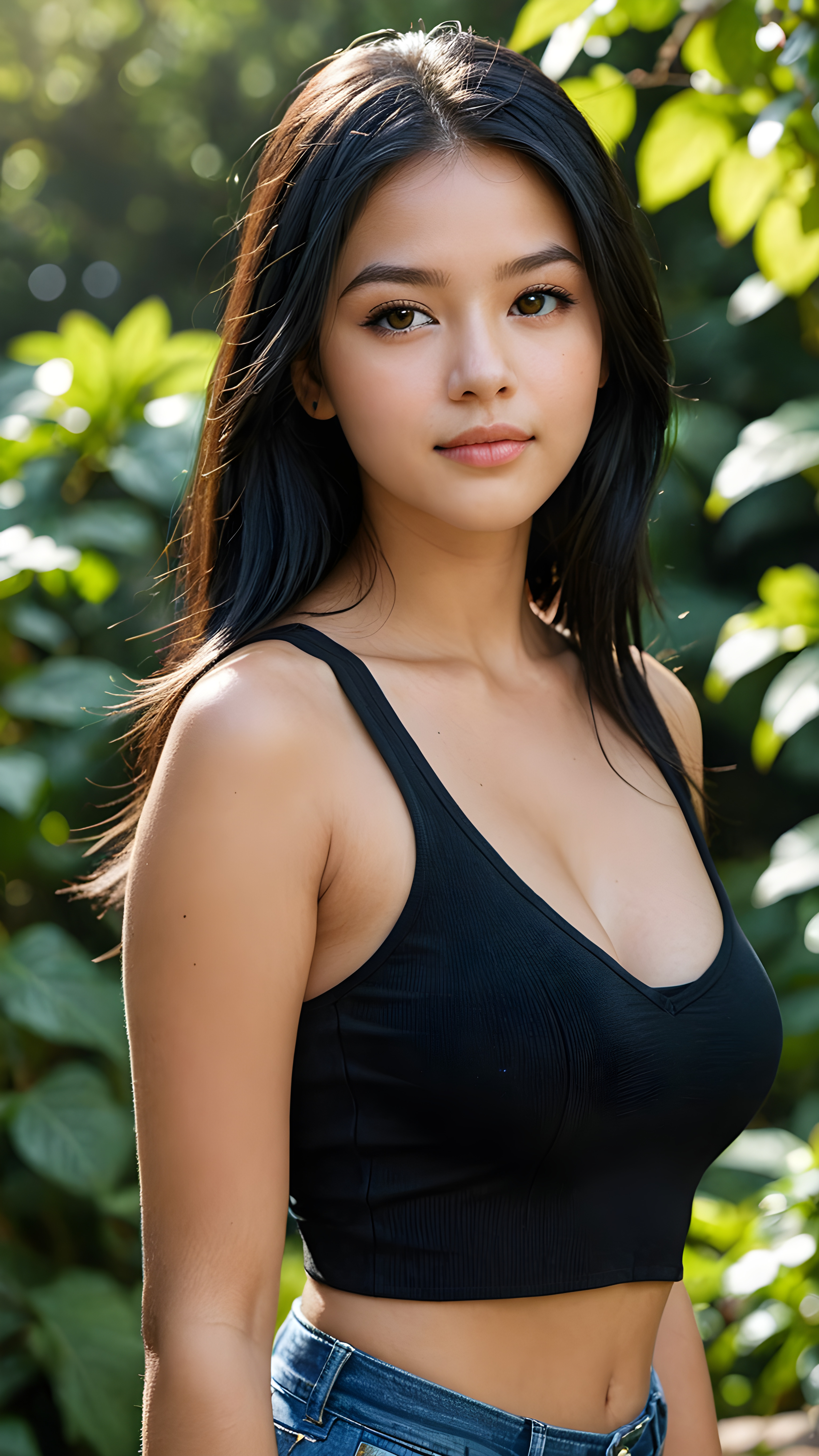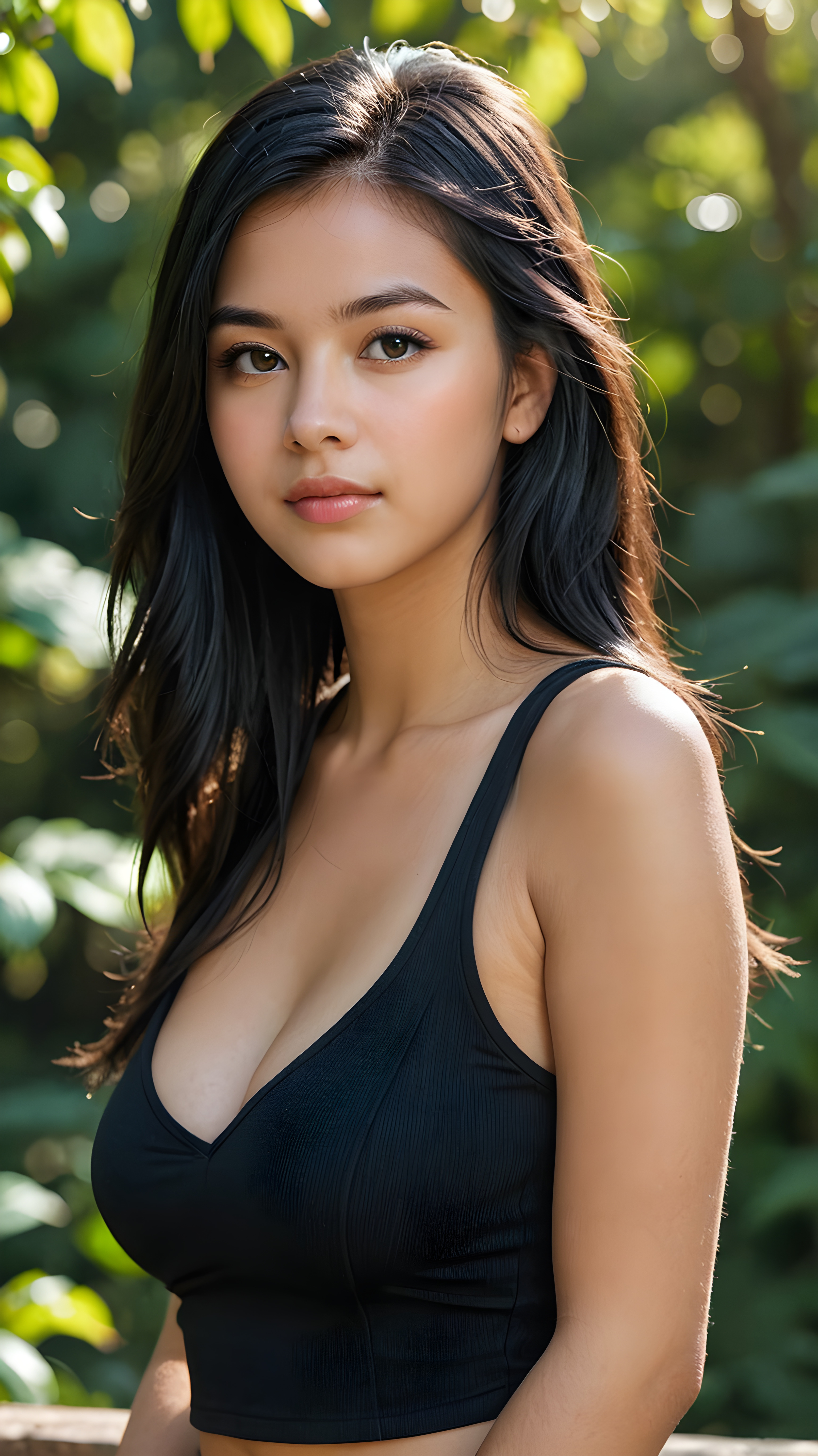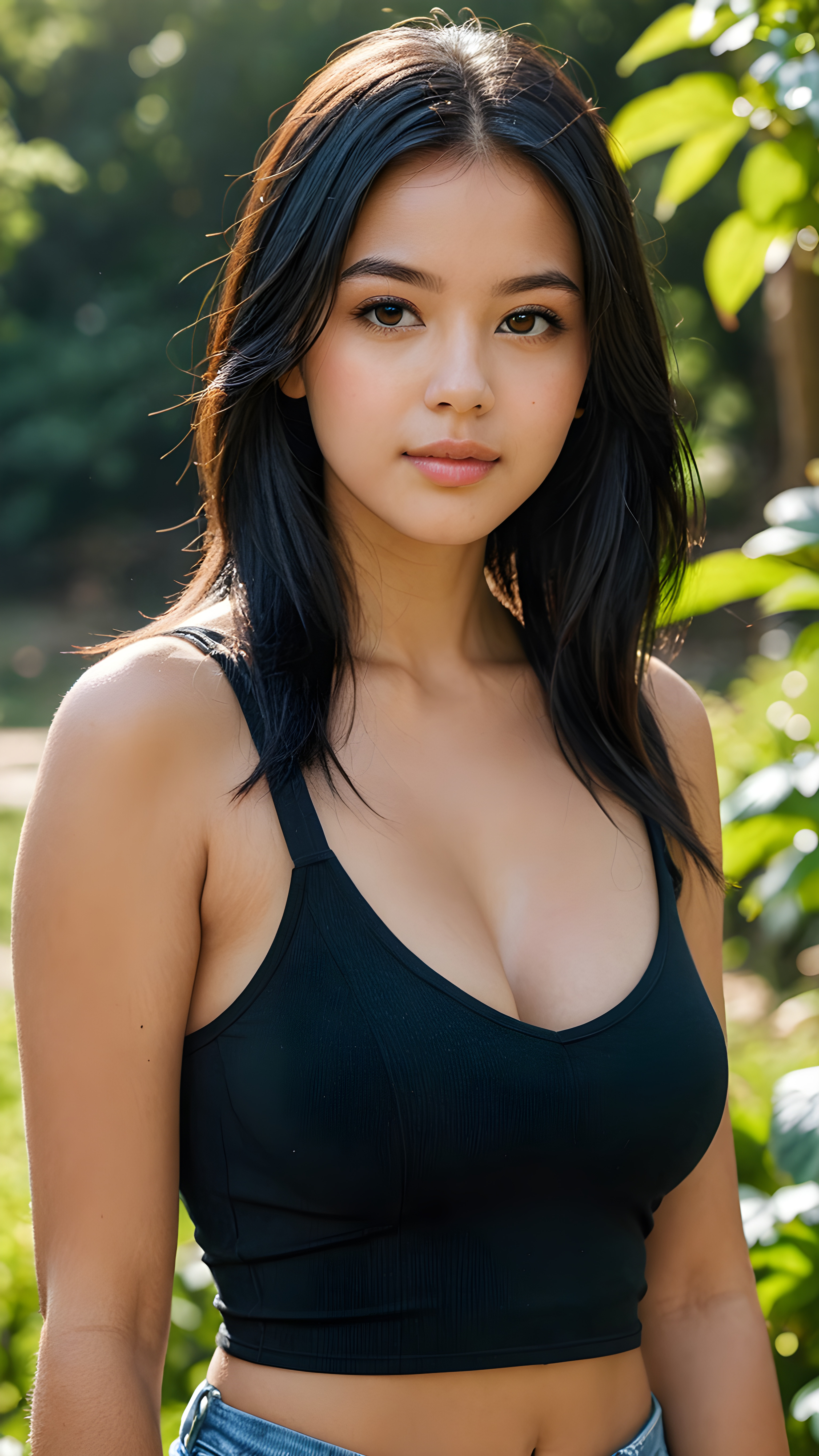a detailed and realistic photo from a (((beautiful young busty teen girl))) with ((soft straight long black hair)), accompanied by (((volumetric lighting))) that bring out the (masterpiece) details, all against a (natural green sunny backdrop), (hyper-realistic) features, captures the essence of (digital art), ((black dressed in an short cropped tank top with a deep v-neck))