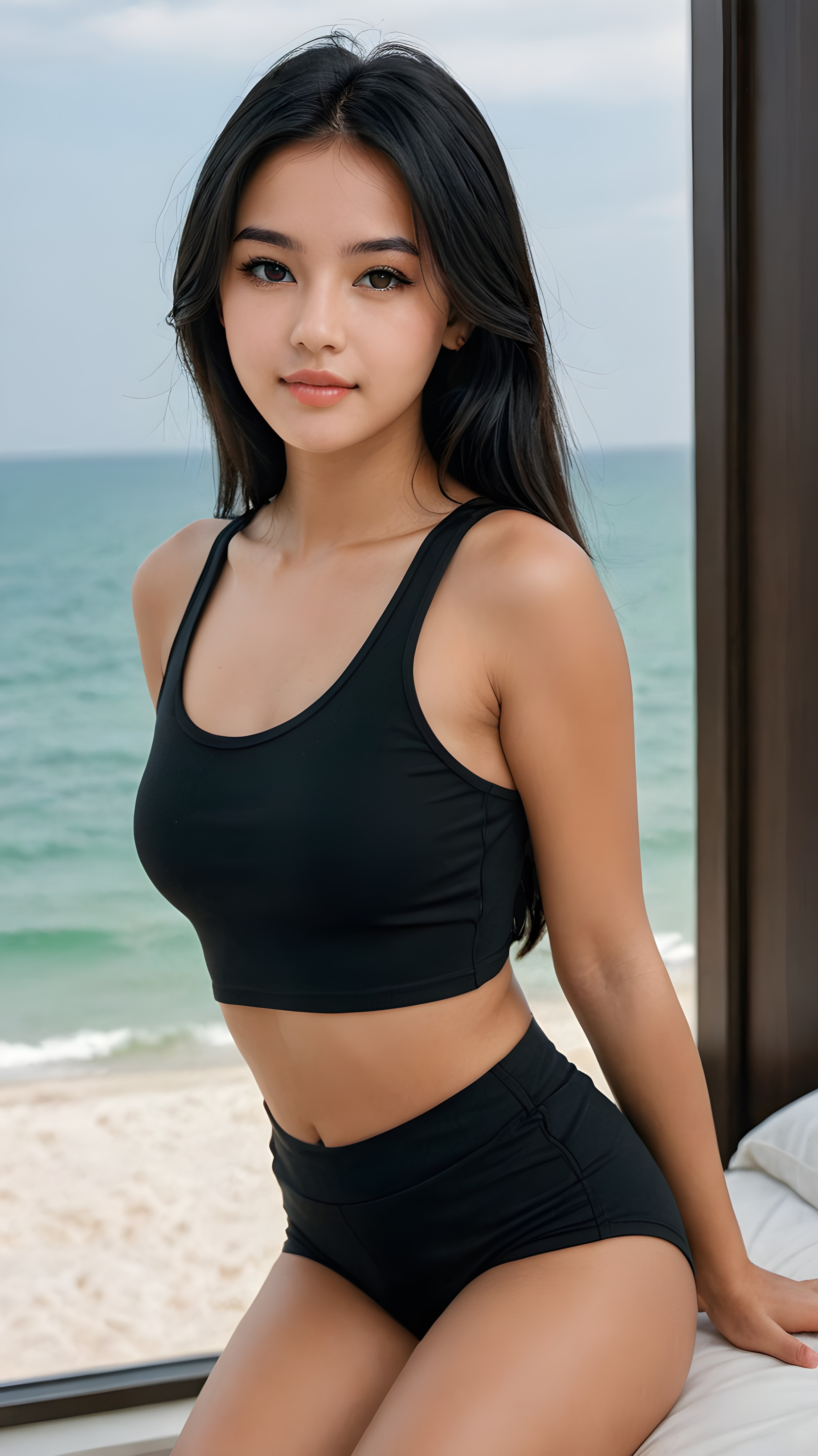 a very pretty young petite tanned girlie, wears a very short cropped black tank top, very long soft black hair, round cheeks, pale slender legs, visible kneeks, black detailed beautiful eyes, ((round face)), full kissable lips, round eyes, perfect skin