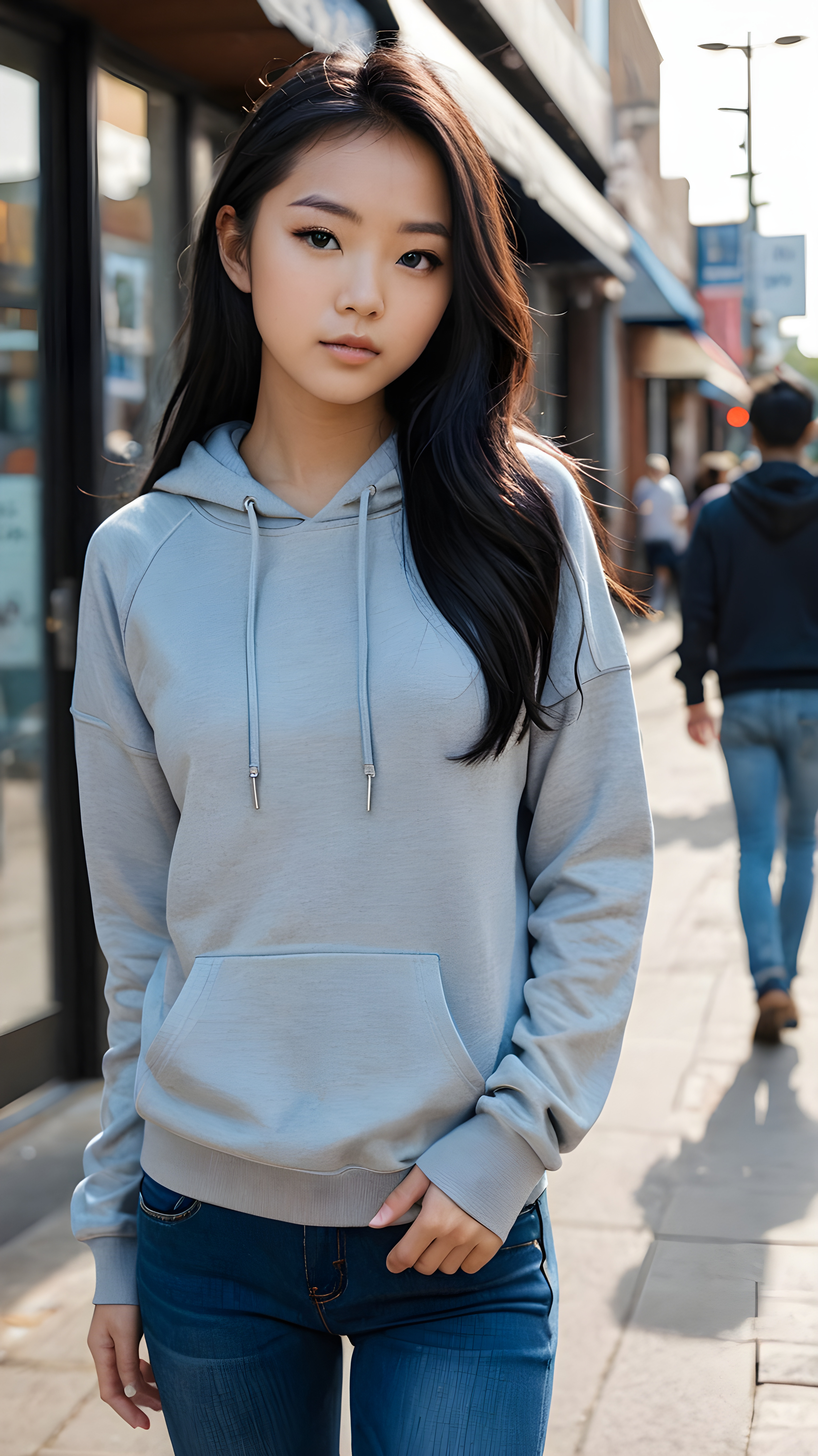 A (((detailed and realistic full-body portrait))), featuring a (((trendy young Asian teen girl))) with long, flowing (((black hair))), embodying a (((modern aesthetic))) with a (((super short, tight, thin silk grey hoodie top))), paired with a (((blue skin tight jeans))), both complemented by (((sharp, urban street photography-inspired accessories))), like a (((Yoji Shinkawa-inspired sleek, minimalist handbag))) and (((stunningly detailed, realistic eyes))), with highly detailed (((pupils))), that draw the viewer in for an intense close-up