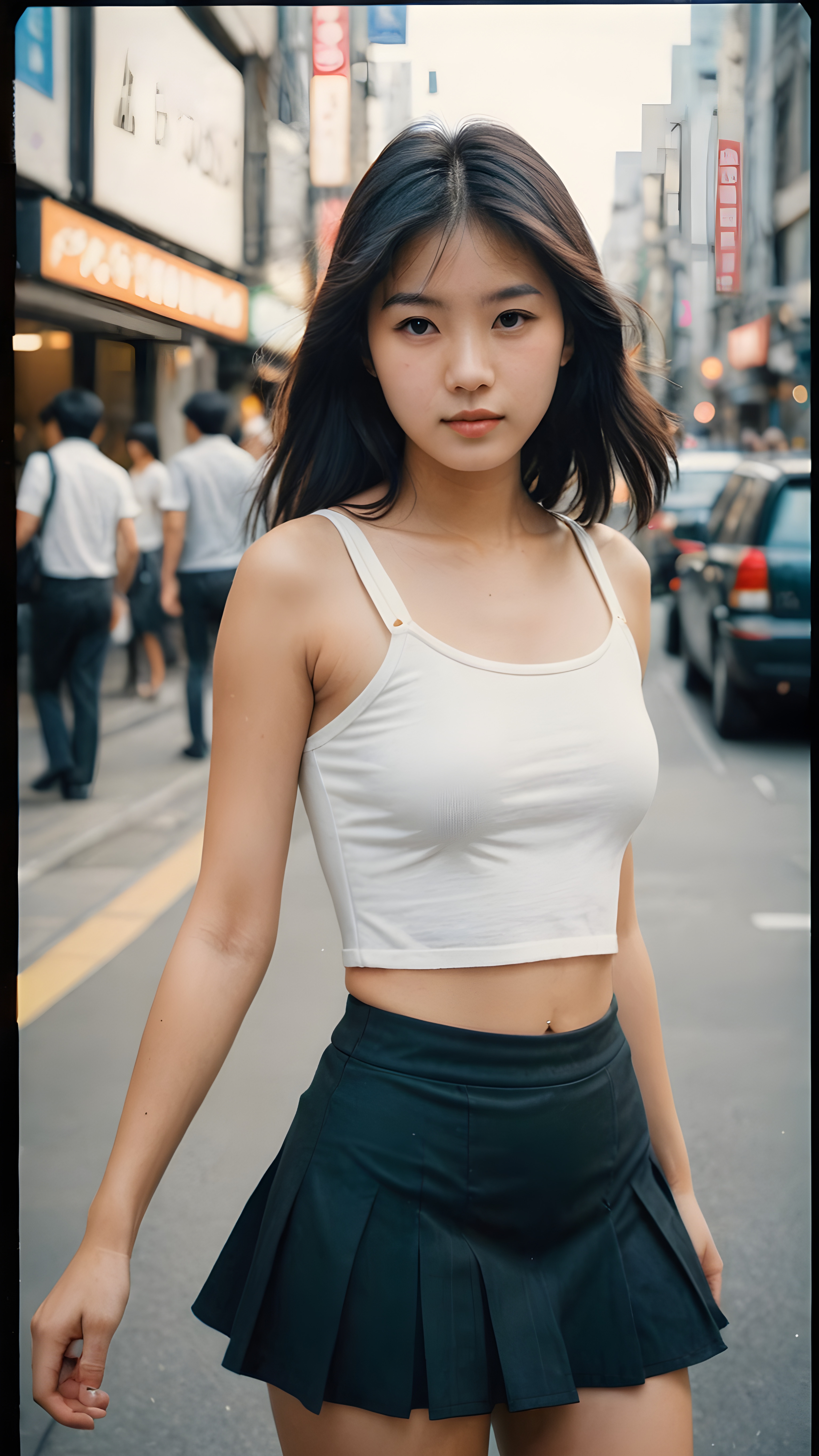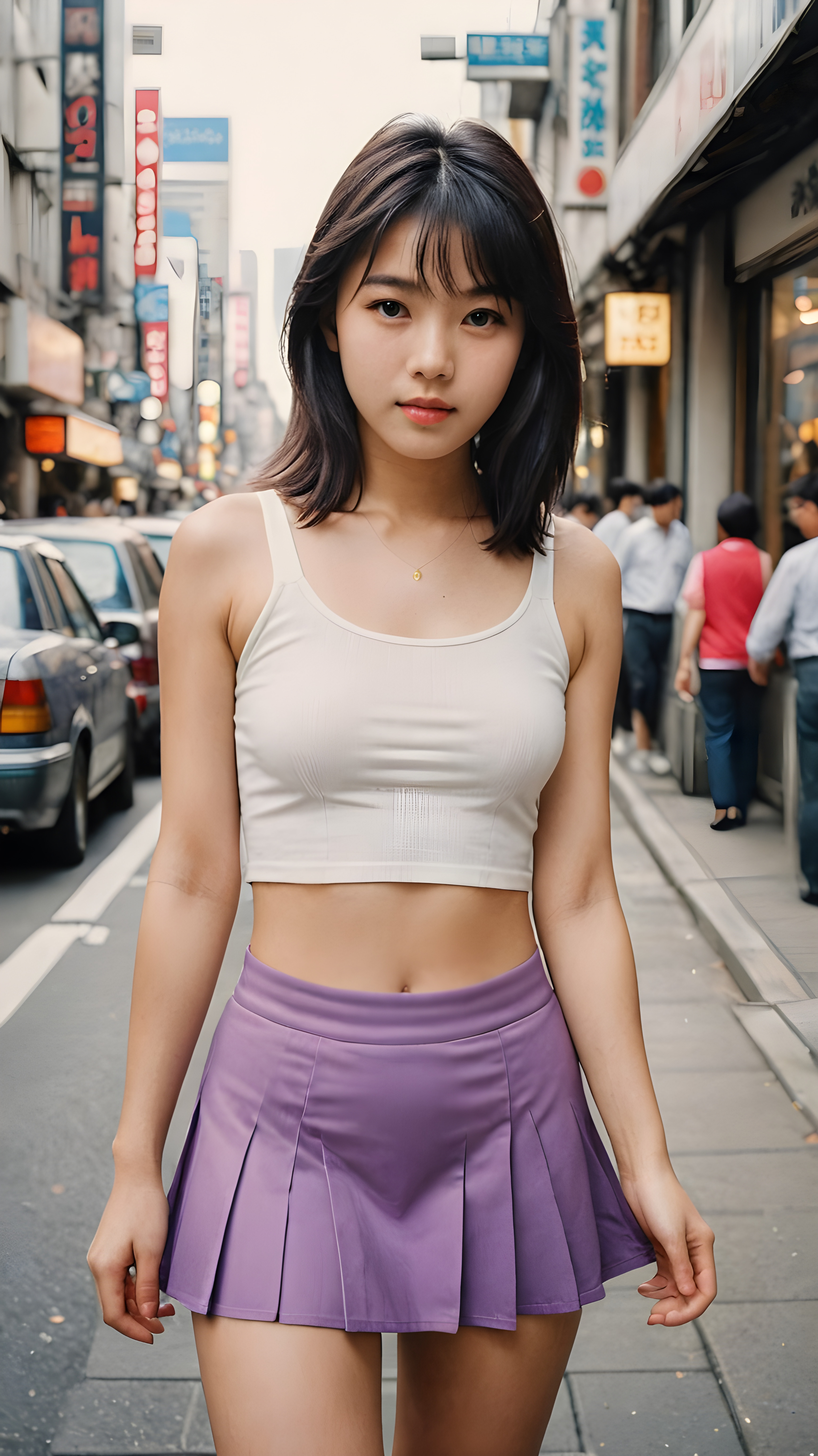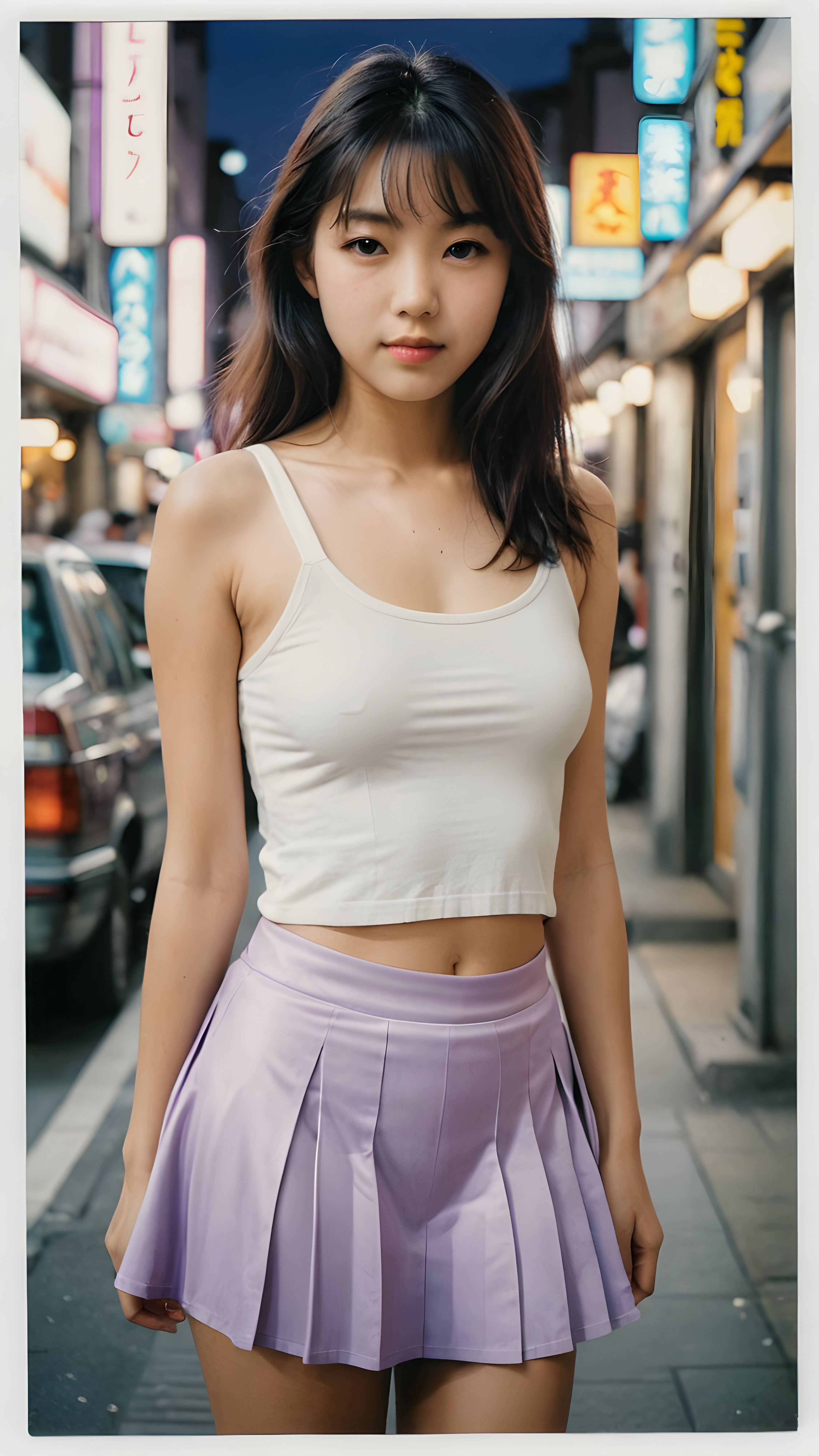 ((a detailed and realistic polaroid photo from the 1980s)), a trendy young Japanese teen girl in Tokyo, perfect hands, with soft long straight black hair, wears a white super fine cropped tank top and a ((round short violet mini skirt)), ((she shows her belly button)), she has a perfect curved body, immersed in the warm ambiance sharp details bring her stylish features to life, perfectly embodying the essence of urban sophistication, the composition contemplates the interplay of modern culture and personal expression, inviting viewers to revel in the captivating atmosphere of contemporary city, she stand in front of the viewer