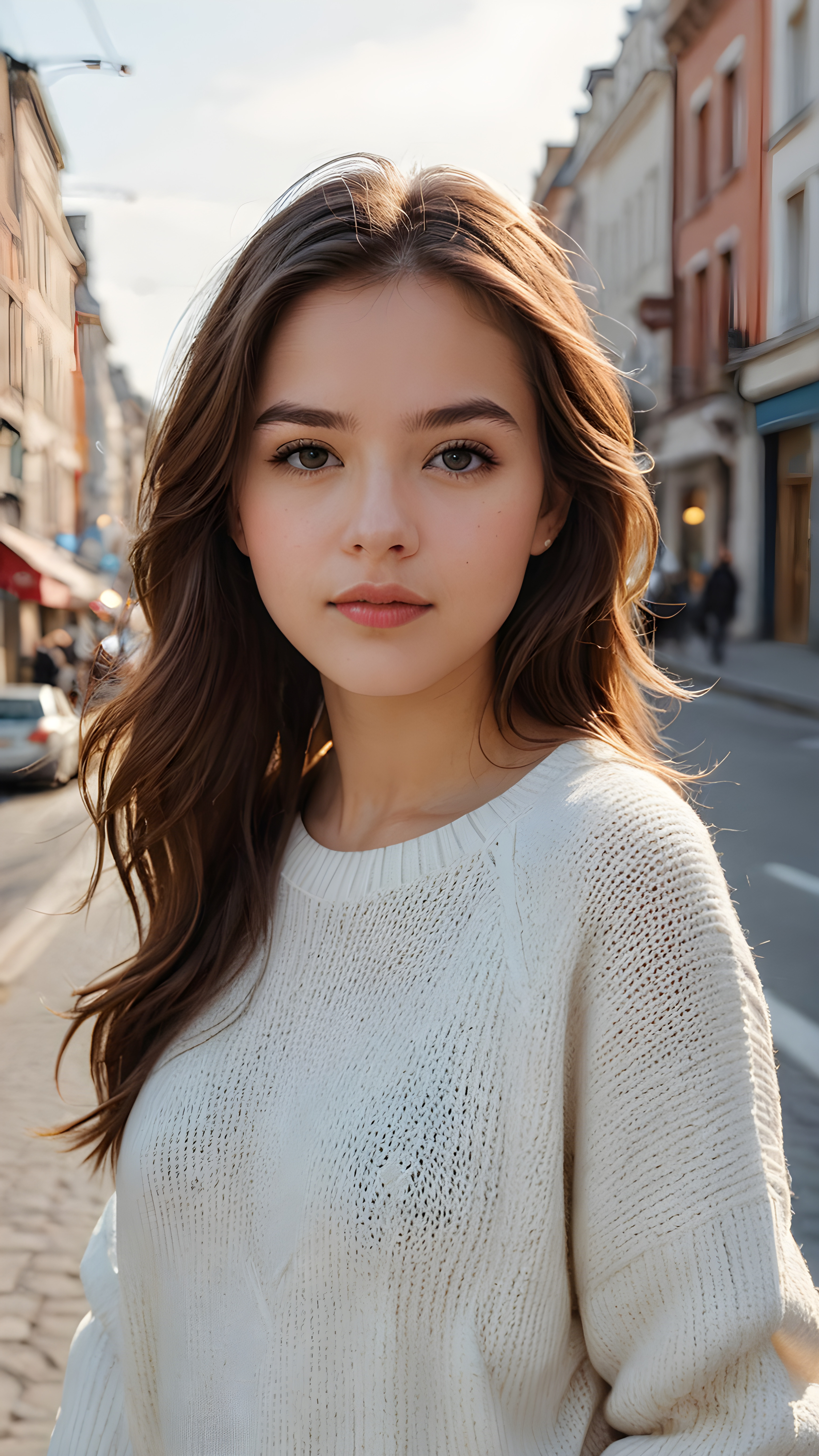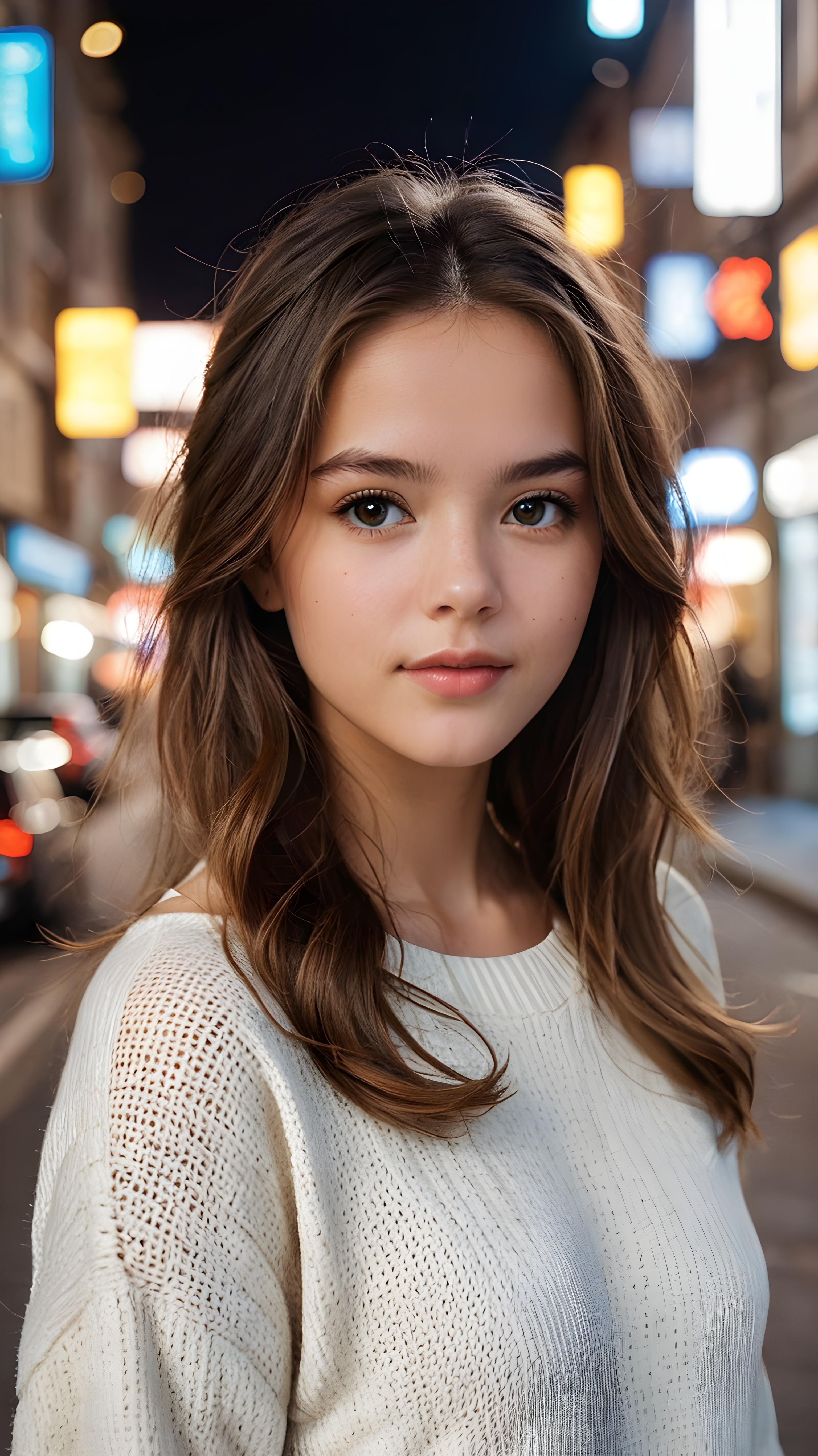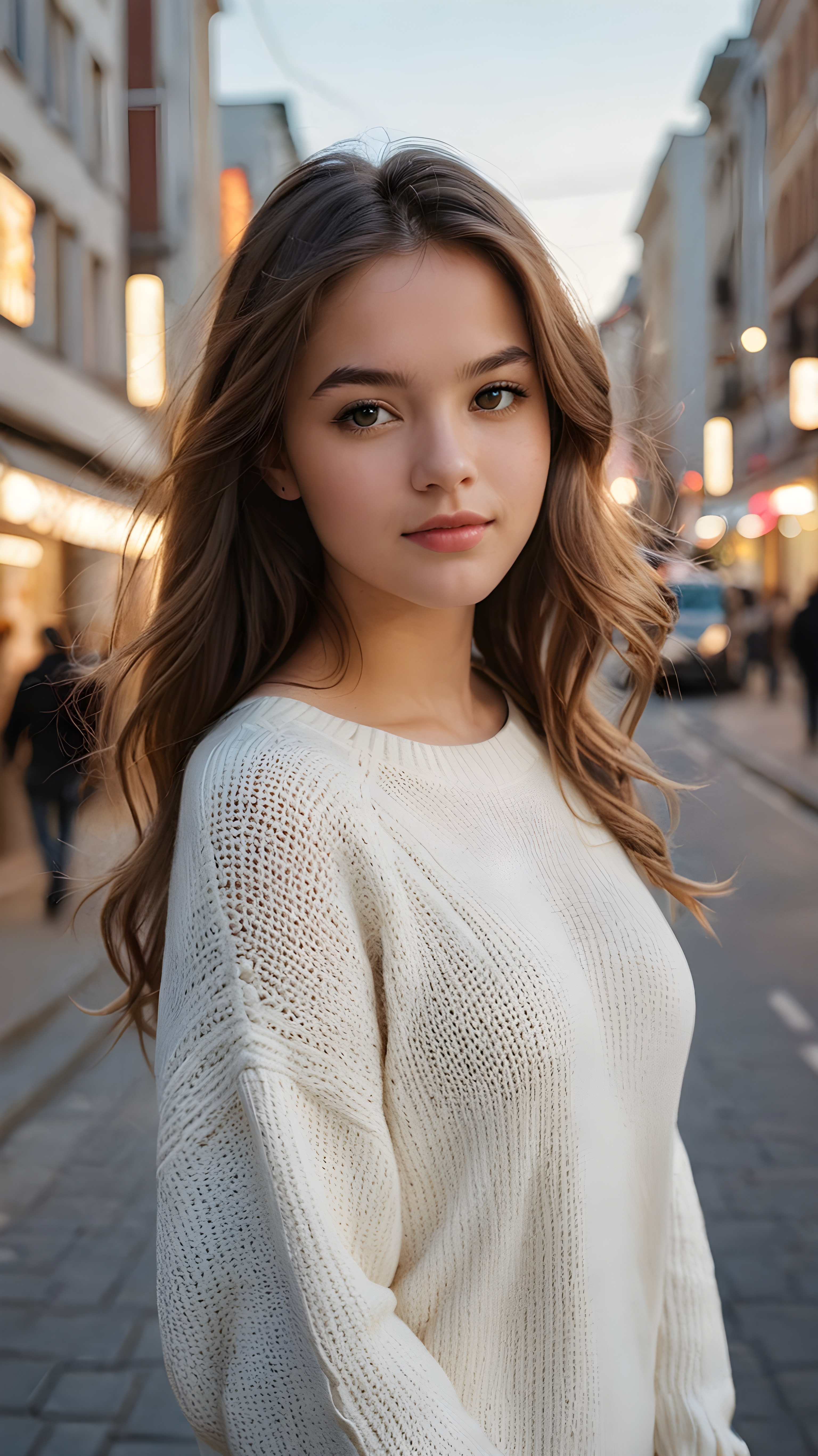 detailed and realistic portrait from a trendy young teen girl with soft long hair, wears a white super fine sweater, she has a perfect curved body, immersed in the warm ambiance sharp details bring her stylish features to life, perfectly embodying the essence of urban sophistication, the composition contemplates the interplay of modern culture and personal expression, inviting viewers to revel in the captivating atmosphere of contemporary city